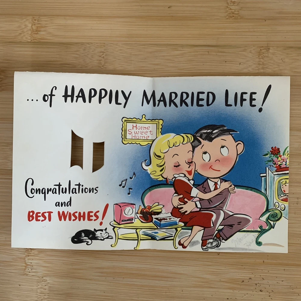 This vintage wedding card from the 1950s features a charming design that captures the essence of a lifelong commitment. The card is beautifully crafted and features intricate details that make it a unique addition to any collection. With its vintage charm and timeless design, this card is perfect for anyone who appreciates the beauty of vintage greeting cards. The card is ideal for collectors of all levels and is perfect for those who are looking for a unique and meaningful gift. Whether you're a seasoned collector or just starting out, this vintage wedding card is sure to impress. So why wait? Add this stunning piece to your collection today!