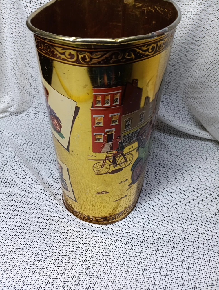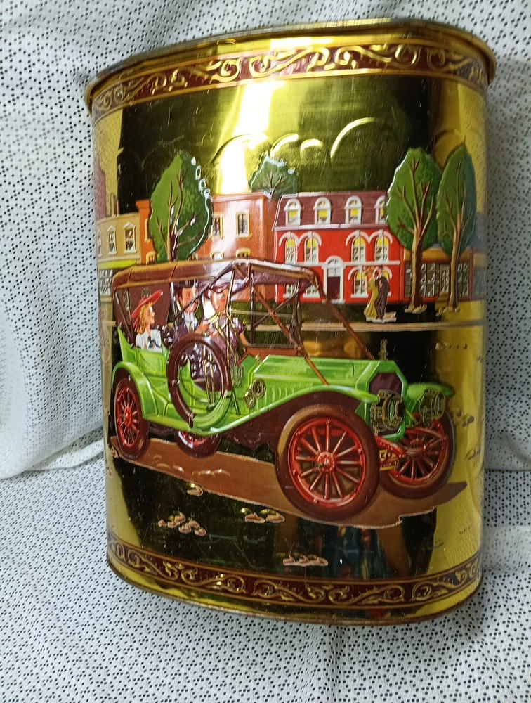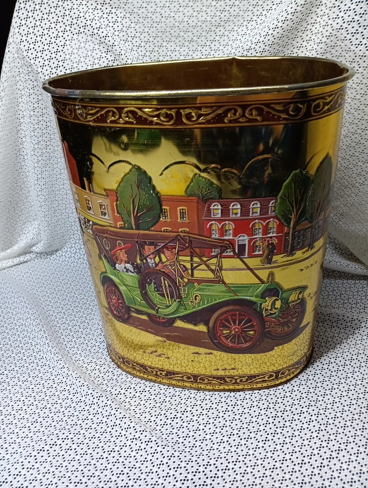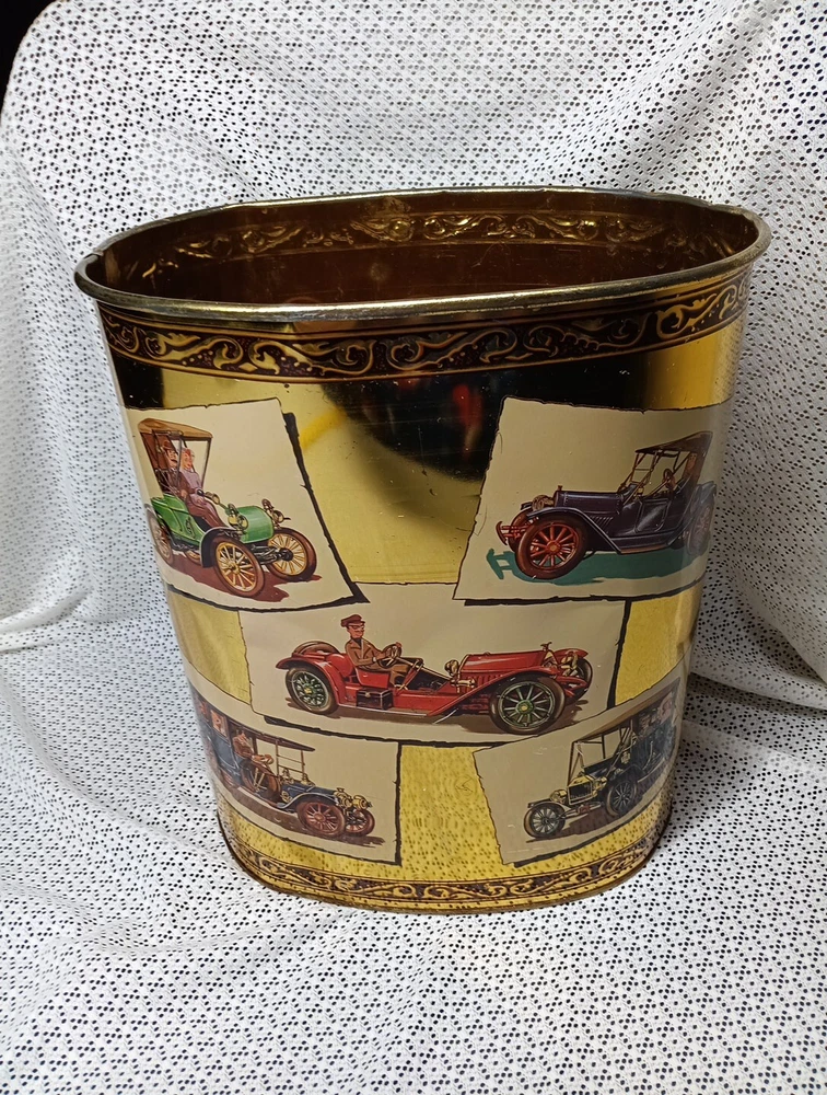 Vintage Weibro Metal Trash Can with Old Jalopy / Antique Car Images. Approx 13" X 10,5" X 7". Some minor surface rust in bottom of can, A few dings and dents, nothing major. See Pictures. Nice Bright color. Has been properly cleaned.