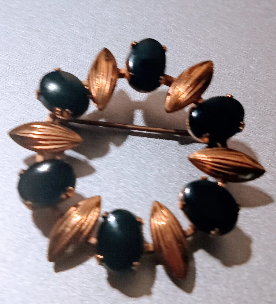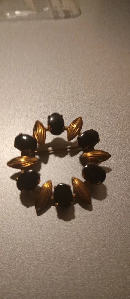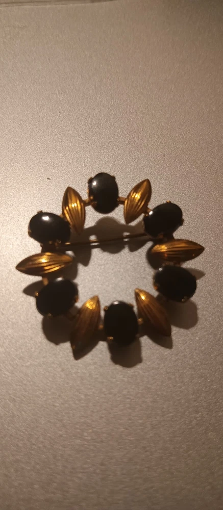 Showcase your classic style with this exquisite Weiss Goldstone Onyx Brooch from the 1950s. The oval-shaped brooch features a captivating black Goldstone stone, which adds a touch of elegance to any outfit. The prong setting ensures that the stone is securely held in place, and the engraving details show the craftsmanship that went into creating this beautiful piece of jewelry. This vintage brooch is perfect for any occasion, whether it's for an engagement, graduation, birthday, or Valentine's Day. The brooch measures 1.5 inches in length and has a timeless gold color that complements any skin tone. The eye-clean gemstone clarity grade ensures that you are getting a high-quality piece of jewelry. Add this beautiful Weiss Goldstone Onyx Brooch to your collection today and enjoy the timeless beauty it brings.