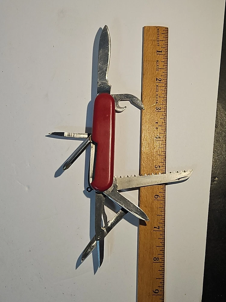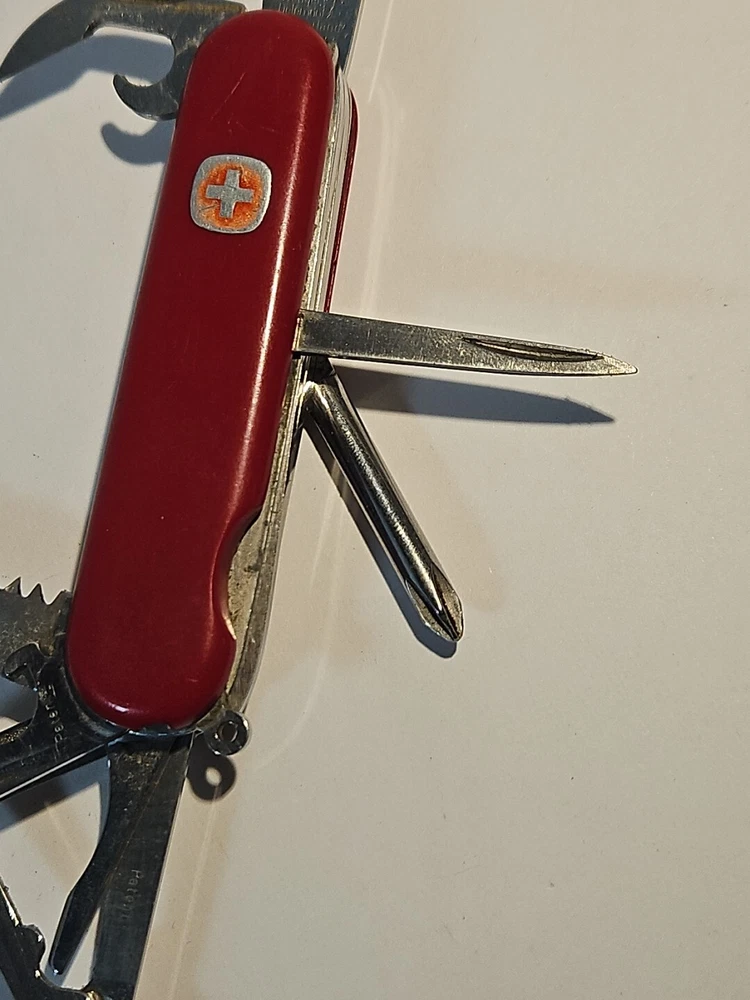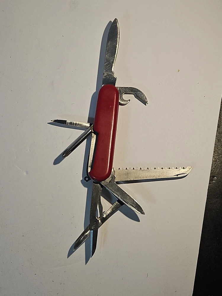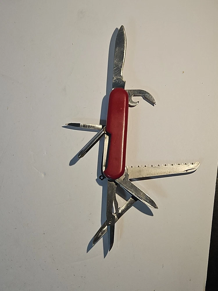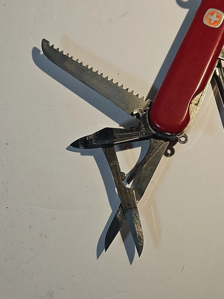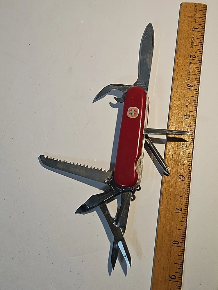 Type: Multi-tool Blade Edge: Serrated Handle Material: Plastic Brand: Wenger Blade Type: Clip Point, Drop Point Lock Type: Slipjoint Opening Mechanism: Manual Original/Reproduction: Original Model: Backpacker II Color: Red Country/Region of Manufacture: Switzerland Dexterity: Ambidextrous Tools: Bottle Opener, Corkscrew, Punch, Saw Number of Blades: 2 Blade Material: Stainless Steel