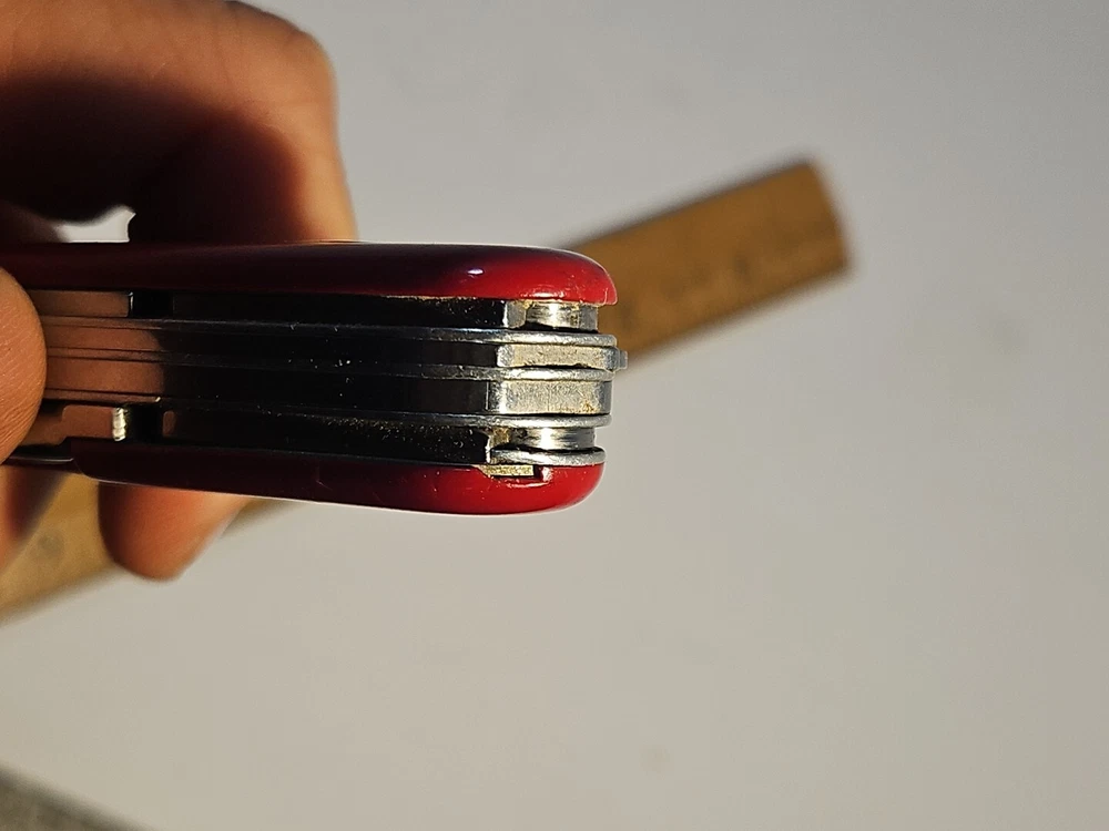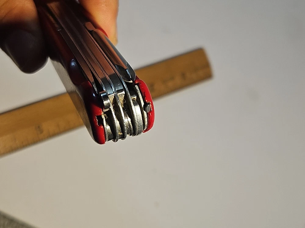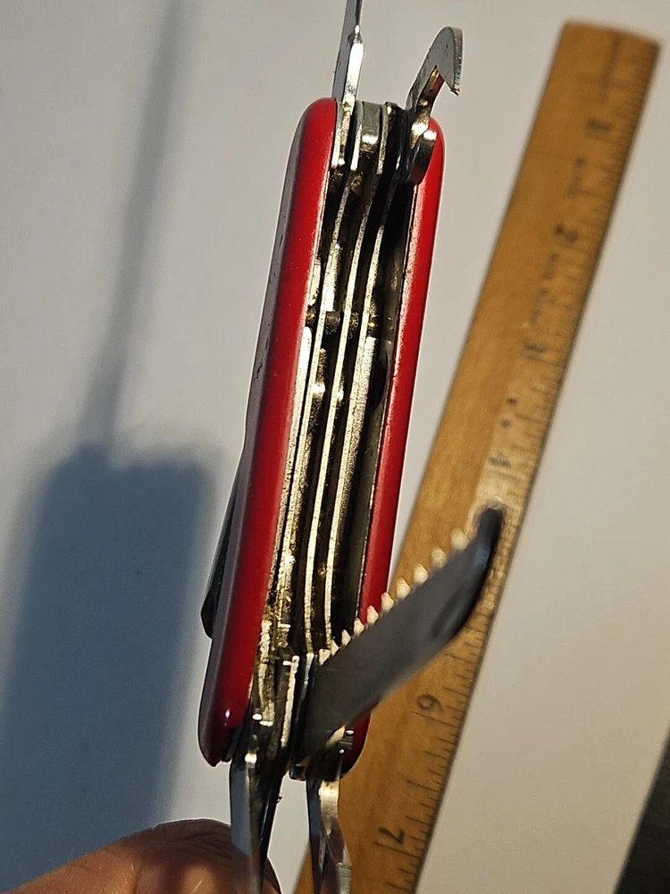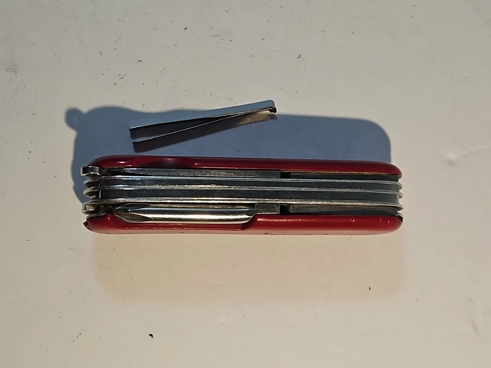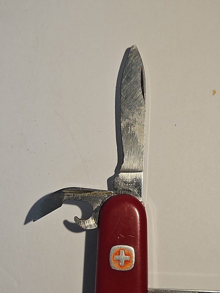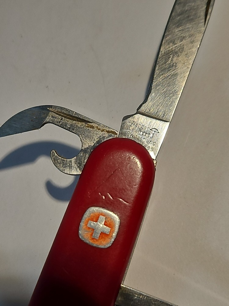 Type: Multi-tool Blade Edge: Serrated Handle Material: Plastic Brand: Wenger Blade Type: Clip Point, Drop Point Lock Type: Slipjoint Opening Mechanism: Manual Original/Reproduction: Original Model: Backpacker II Color: Red Country/Region of Manufacture: Switzerland Dexterity: Ambidextrous Tools: Bottle Opener, Corkscrew, Punch, Saw Number of Blades: 2 Blade Material: Stainless Steel