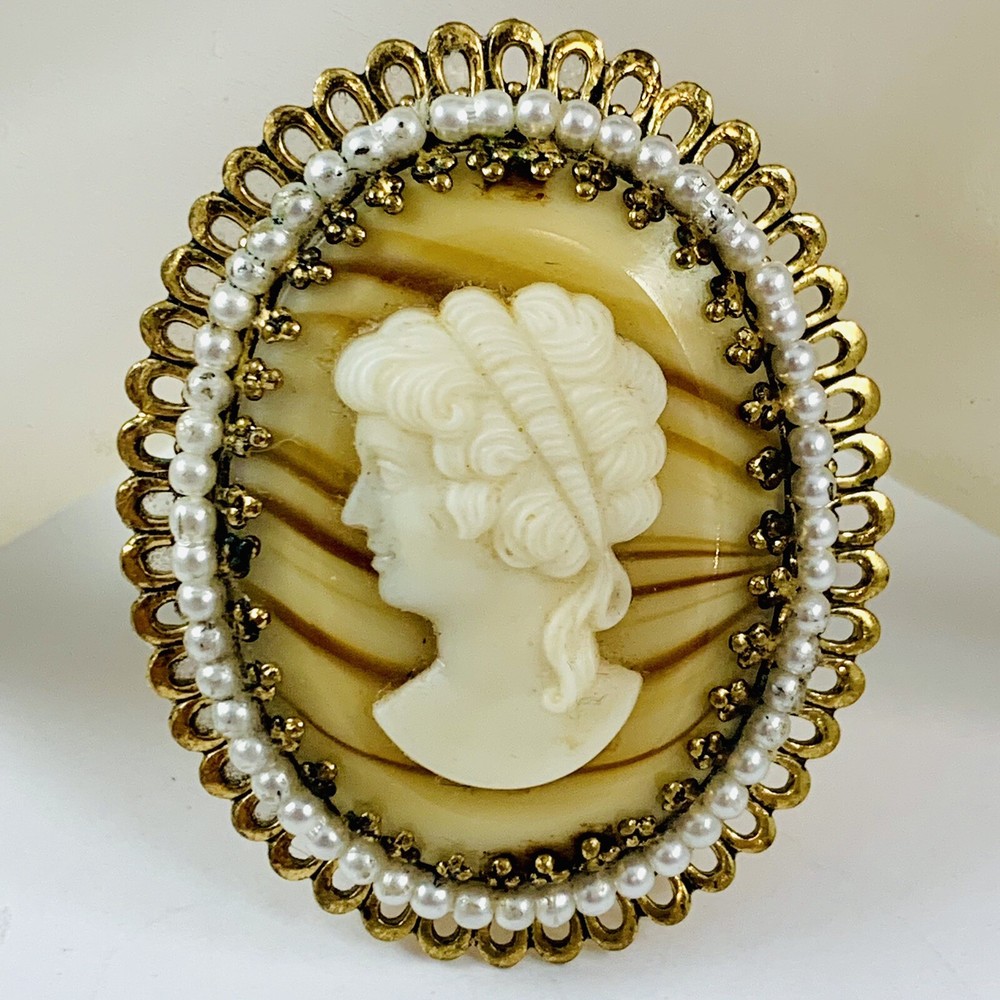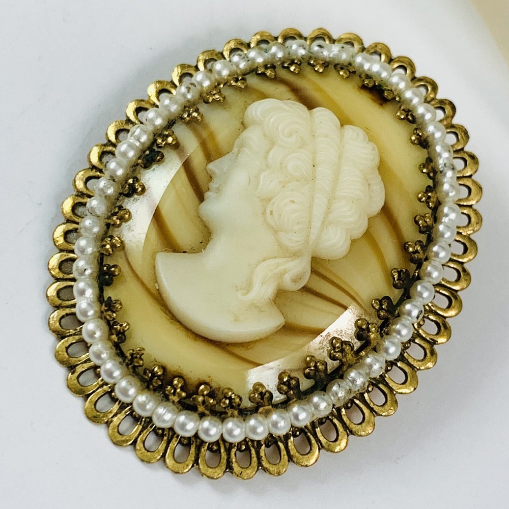 Vintage West Germany Glass Cameo Faux Pearl Gold Tone Brooch. Piece does show some finish wear on the back. Pre-Owned Vintage Estate Jewelry. Ready to wear, give as gift or add to a collection. Our Vintage items are mostly from estate sales and vary in age from 100+ years old to more modern pieces. Please use your judgement. Items are photographed on a measuring matte with one-inch squares to give you an idea of size. Any photography props / holders you see are not included.