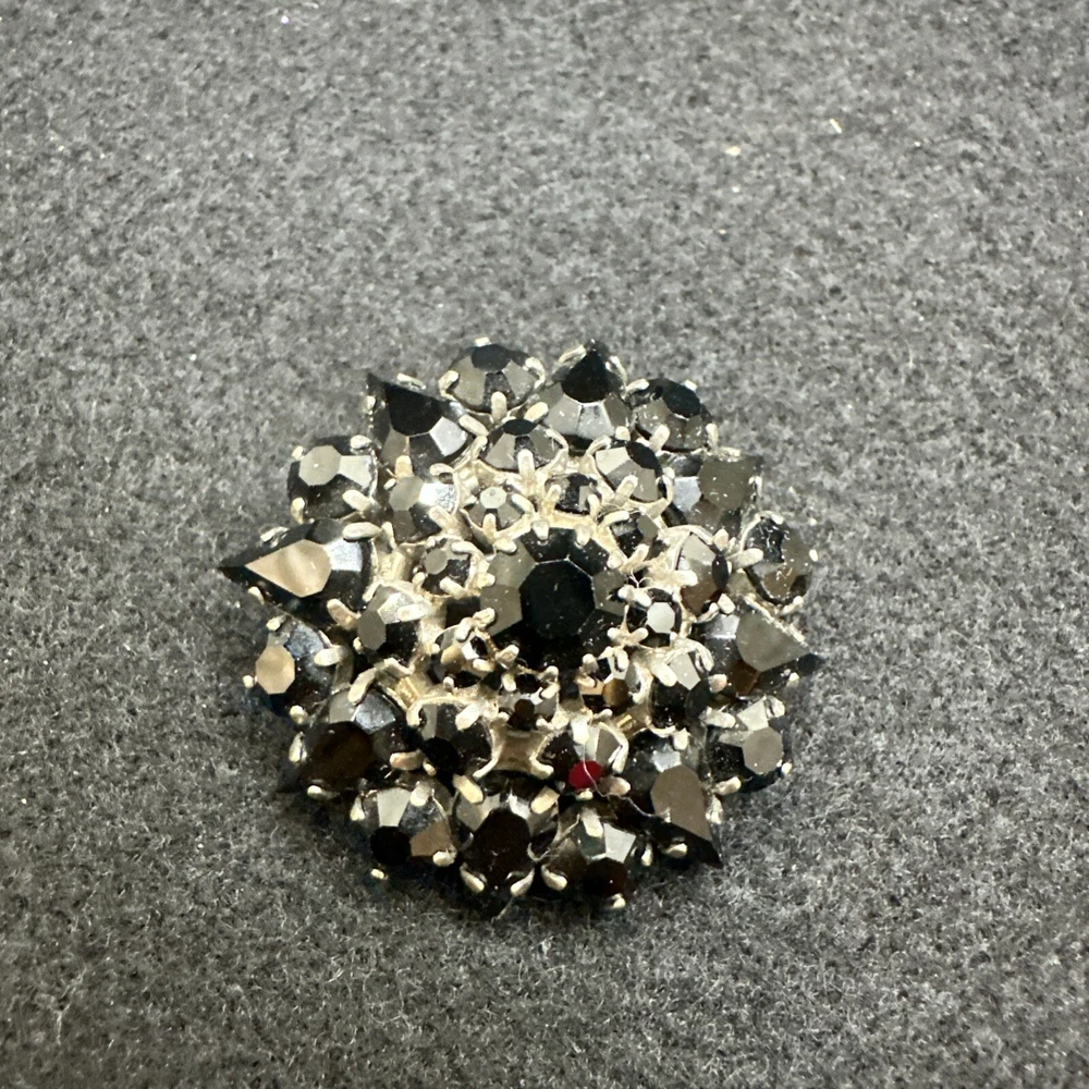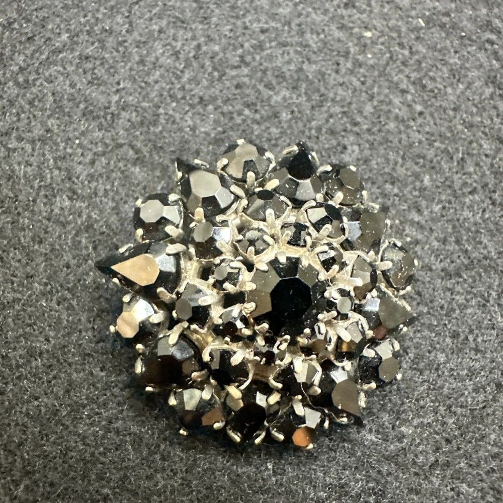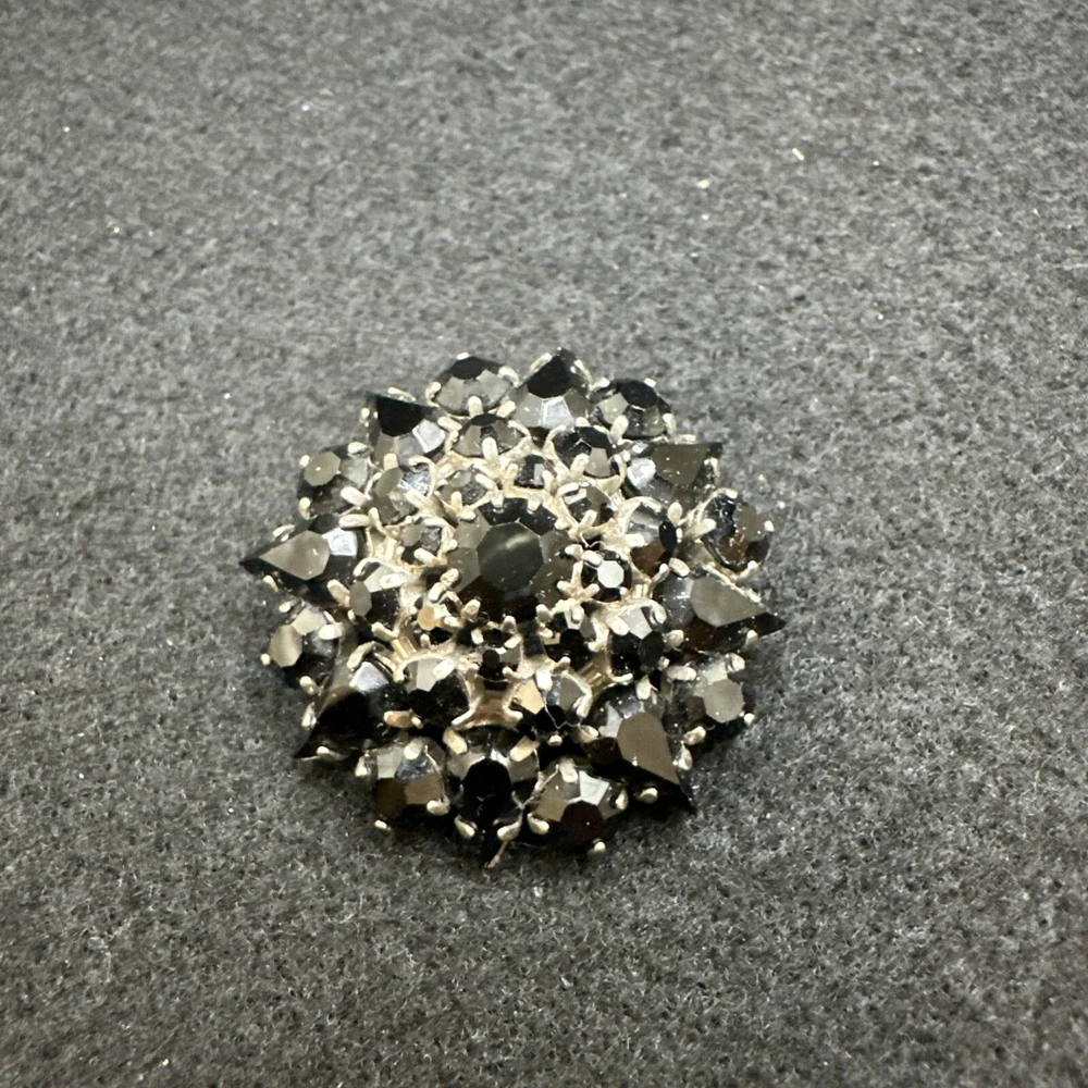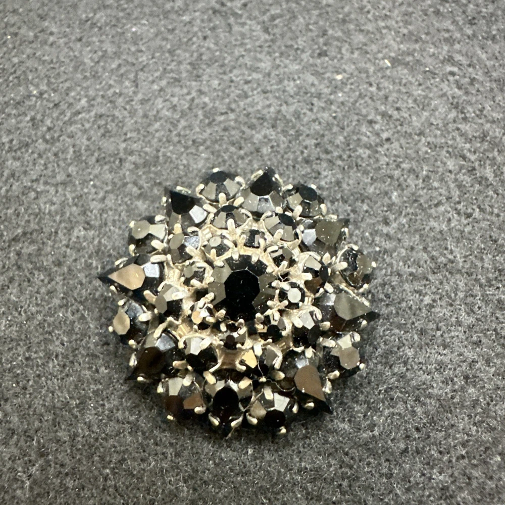 This vintage brooch from West Germany is a timeless piece of fashion jewelry. The silver tone and black onyx gemstone make it perfect for any occasion. The brooch is signed and plated with rhodium, making it an original and authentic piece. The round shape and retro design of this brooch make it a unique addition to any collection. It is 1.25 inches in length and can be worn by both men and women. This brooch is a great vintage find and is sure to impress.