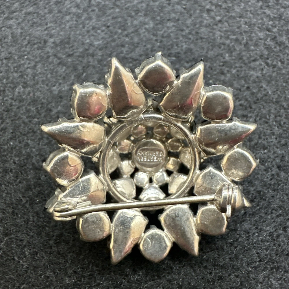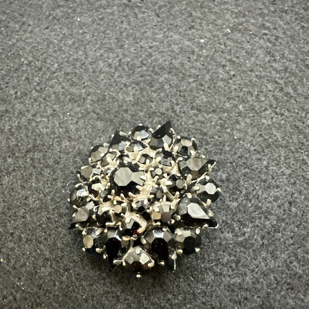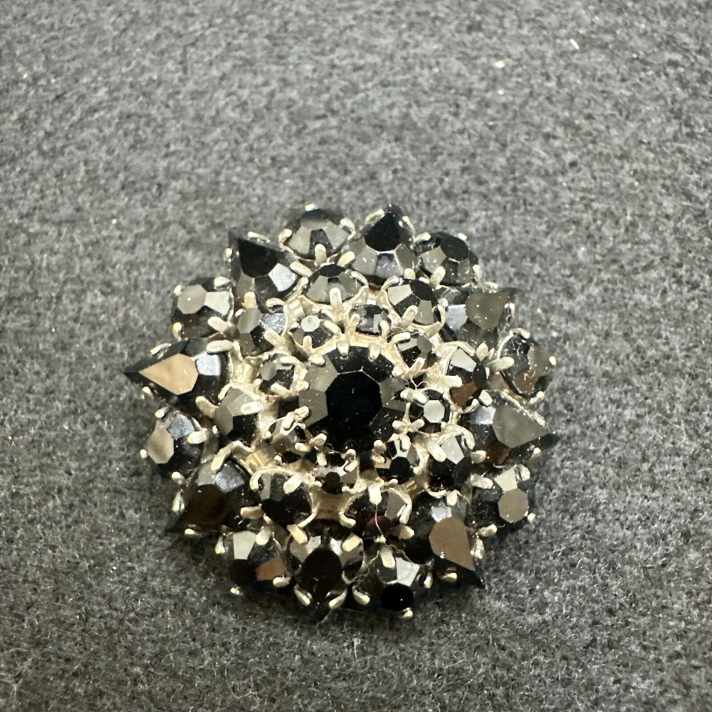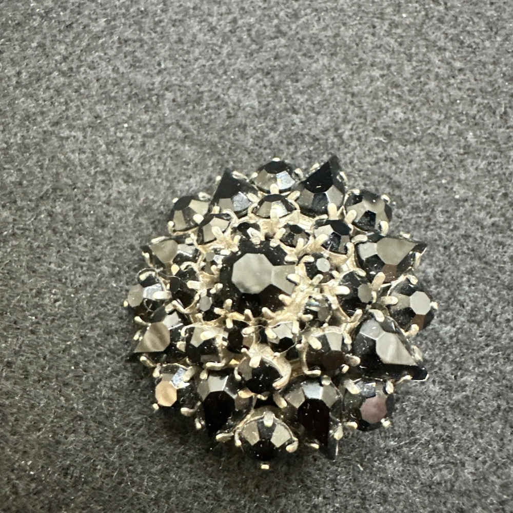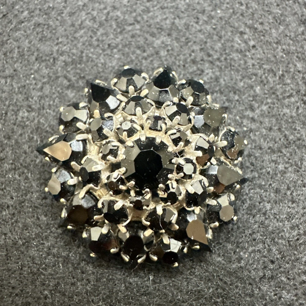 This vintage brooch from West Germany is a timeless piece of fashion jewelry. The silver tone and black onyx gemstone make it perfect for any occasion. The brooch is signed and plated with rhodium, making it an original and authentic piece. The round shape and retro design of this brooch make it a unique addition to any collection. It is 1.25 inches in length and can be worn by both men and women. This brooch is a great vintage find and is sure to impress.