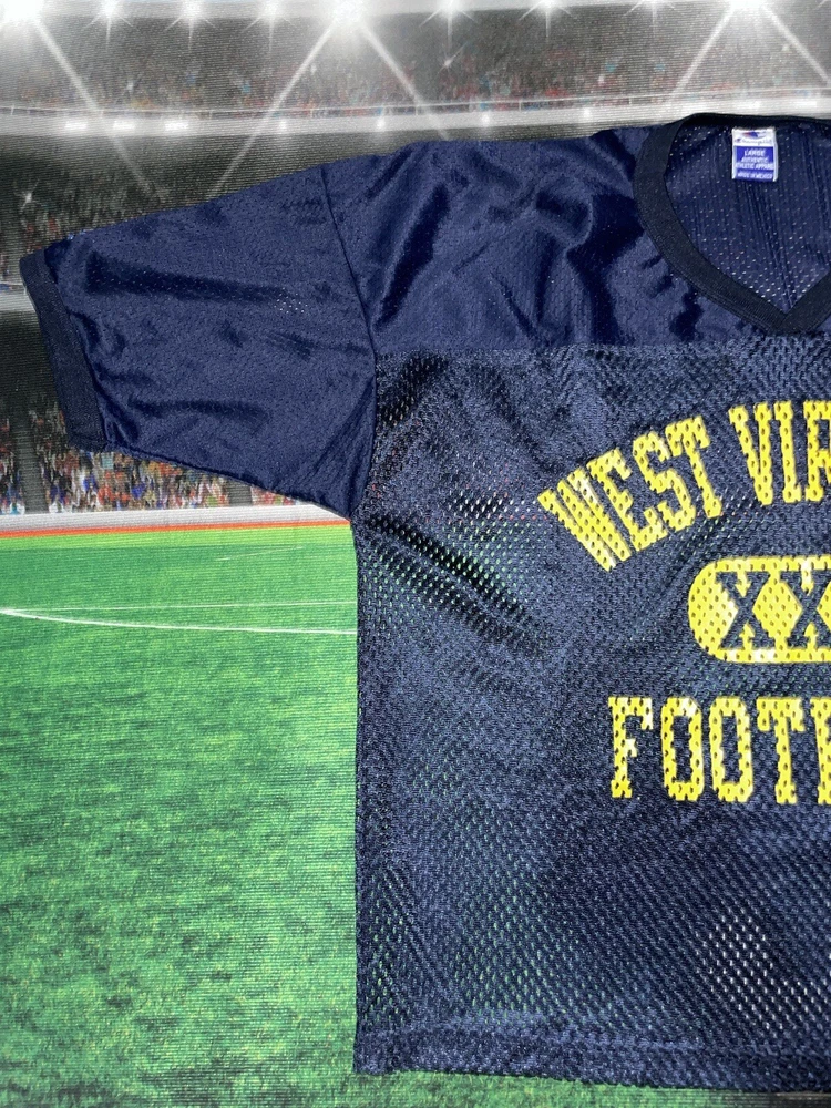 Show off your love for the West Virginia Mountaineers with this vintage football jersey from Champion. The blue unisex adult jersey is perfect for any fan of the team looking to support them during the pre-season. With a size of 44, this jersey is a great fit for anyone who wants to represent their favorite college team in style. The jersey features the team's name and logo, making it a great addition to any fan's collection. Whether you're heading to a game or just want to show off your team spirit, this vintage West Virginia Mountaineers jersey is the perfect choice.