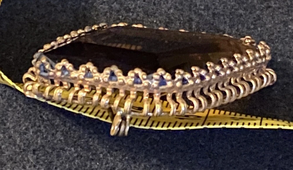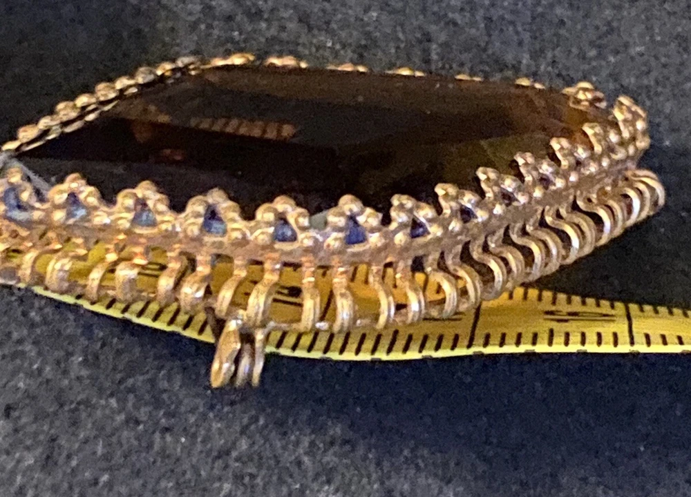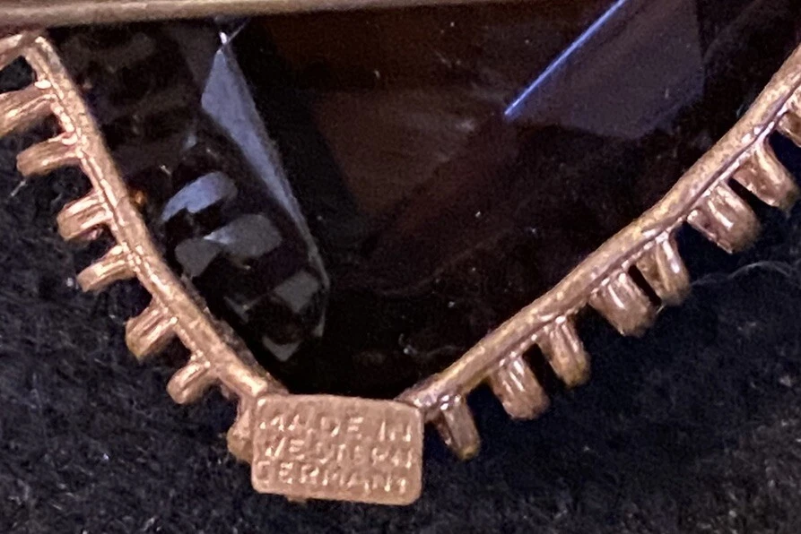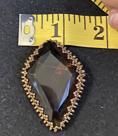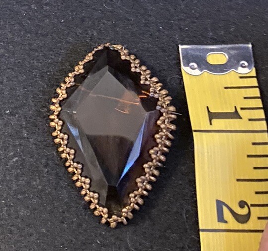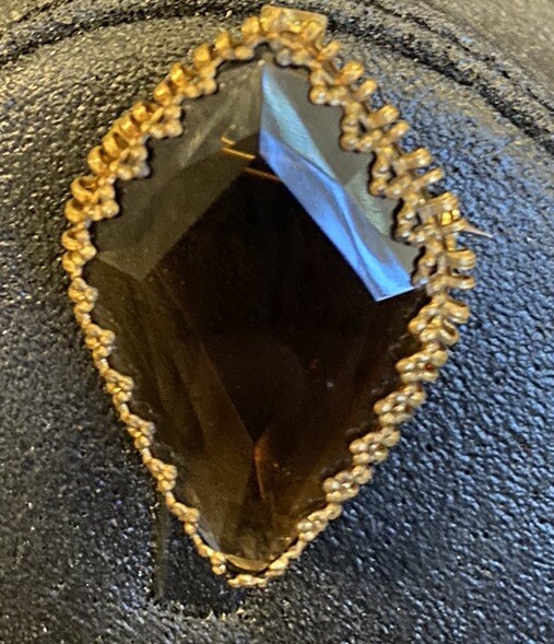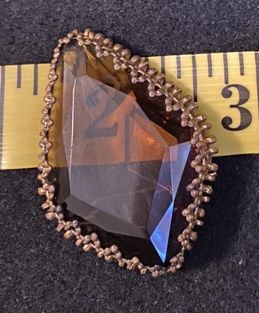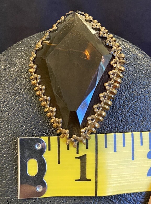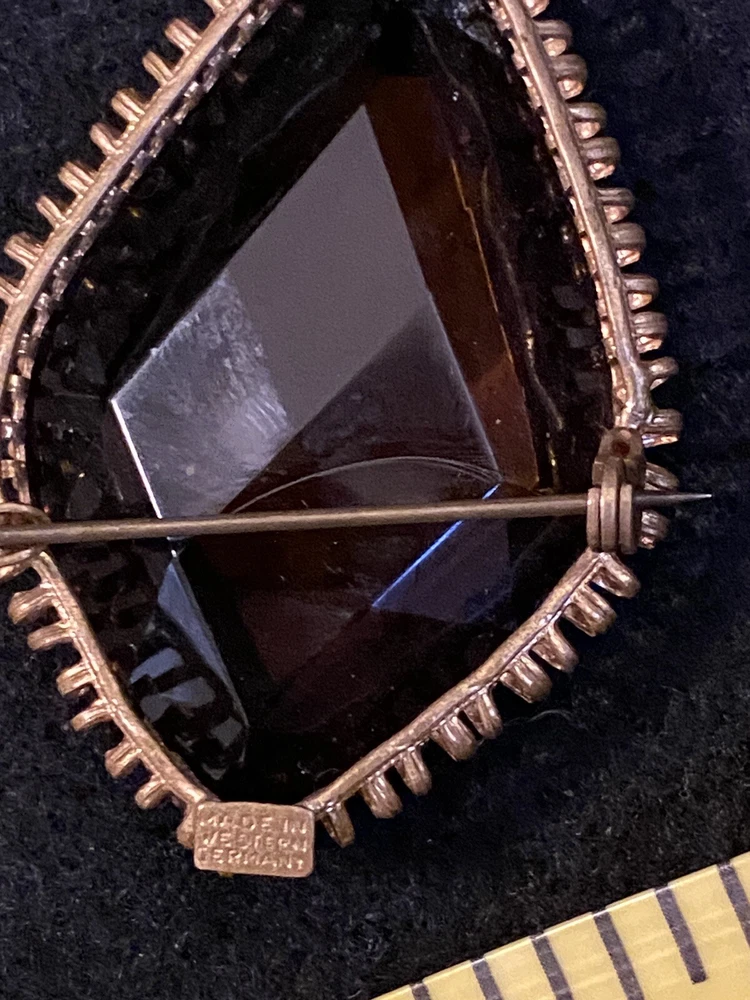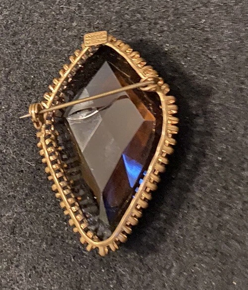 This vintage brooch is a stunning piece featuring a beautiful amber faceted glass and delicate gold tone filigree. The brooch is signed and originates from Western Germany, with intricate Victorian-inspired details that make it a true work of art. The brooch is made of high-quality materials and is perfect for adding a touch of beauty to any outfit. Whether you are a collector or just looking for a unique accessory, this vintage brooch is a must-have for anyone who appreciates fine craftsmanship and beauty. The glass has a maker imperfection on the back.