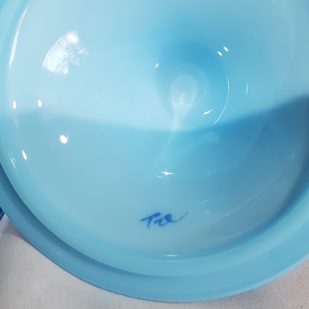This elegant Westmoreland milk glass covered compote or candy dish, is hand painted with delicate white daisies. It is signed by the artist, R (or L) Drury, 1979. The interior of the lid is also signed. The height is 8" to the top of the finial, the bowl diameter is 3 3/8" and the foot is 3 1/8". The condition is good, no issues that I can find.