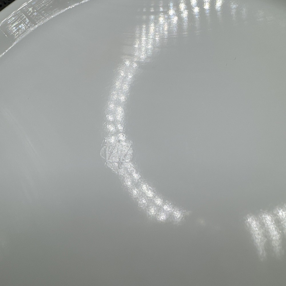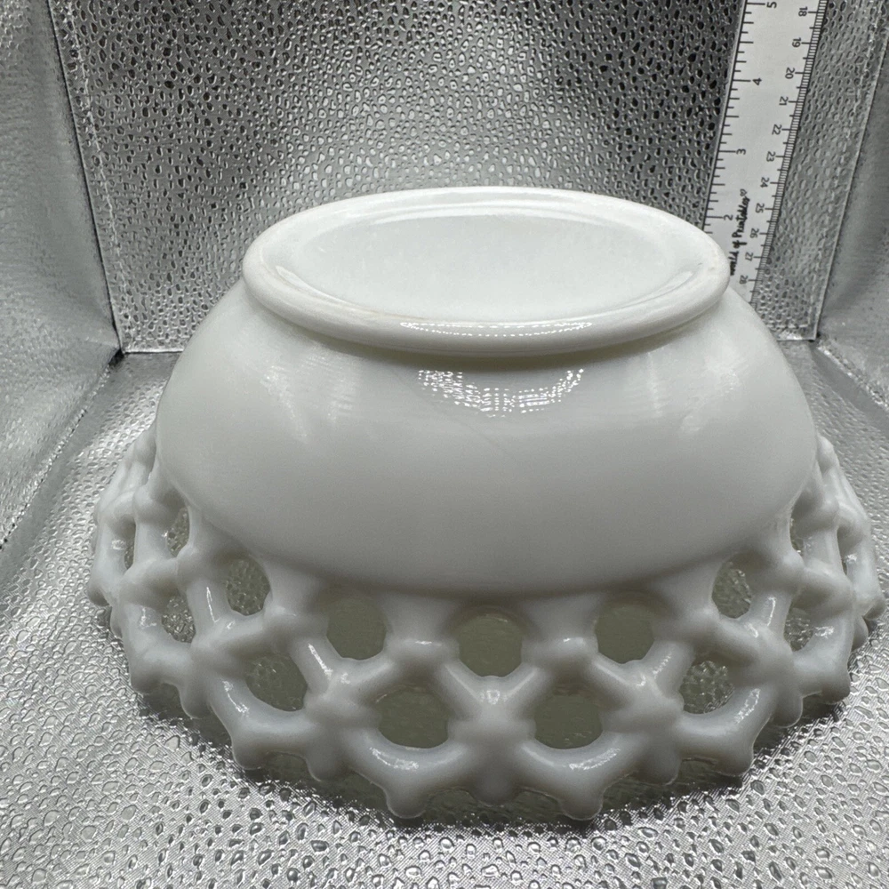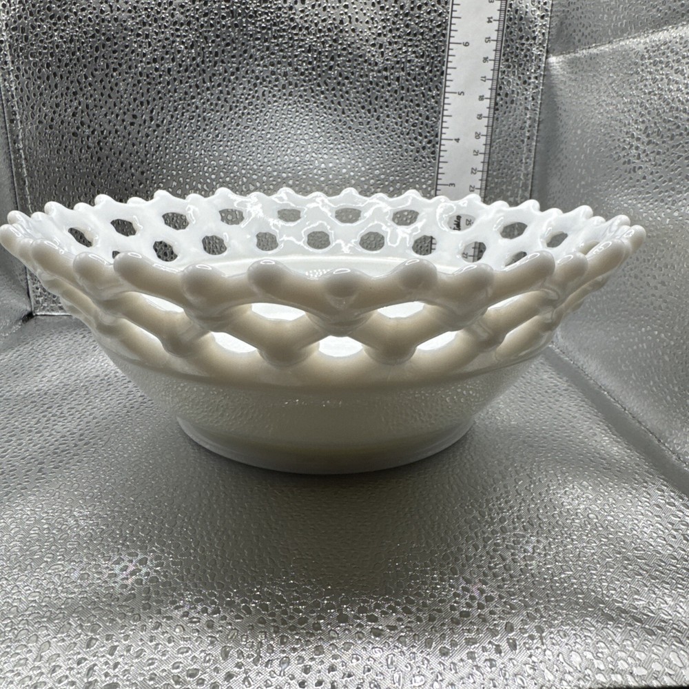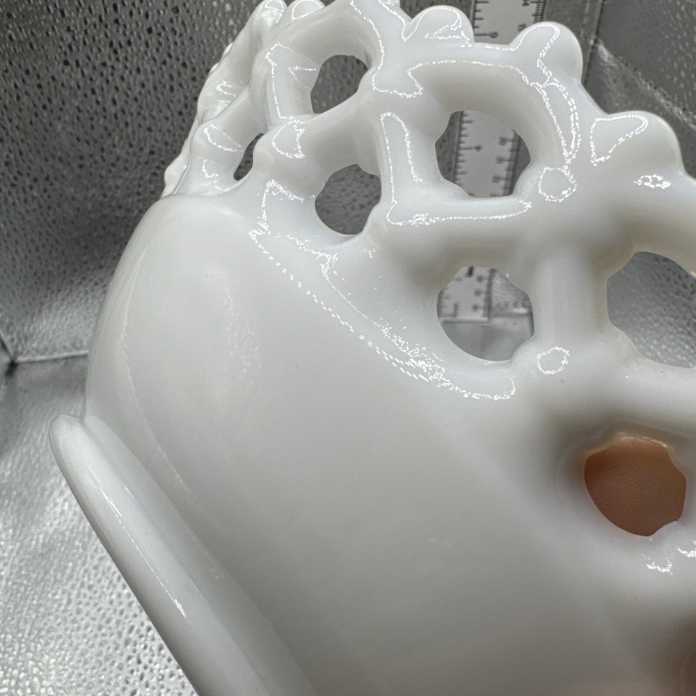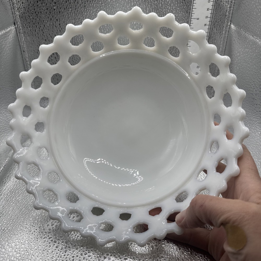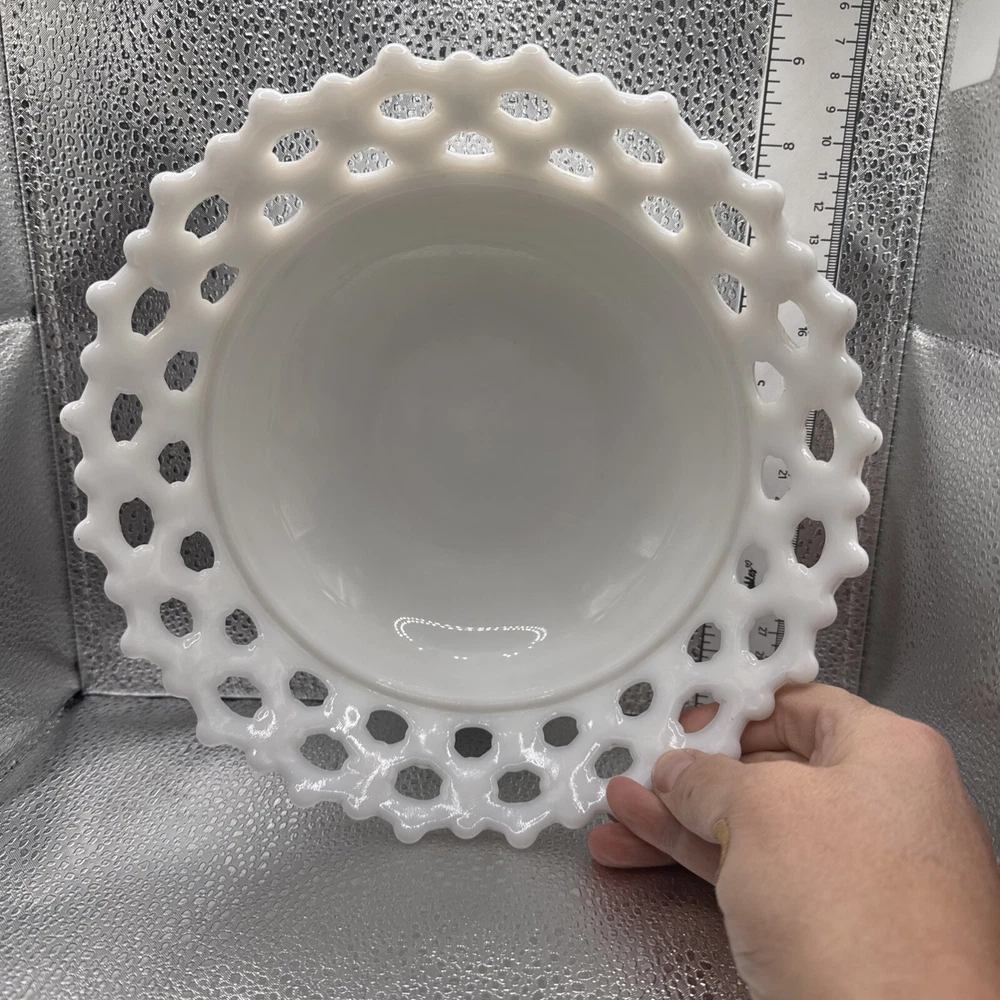 This vintage Westmoreland milk glass bowl features the Doric pattern with a beautiful white lace edge design, measuring 9 inches in diameter. Handmade and produced in a milk glass production style, this original piece from the Laced Edge product line is a stunning addition to any collection. The backstamp is impressed on the bowl, showcasing its authenticity as a piece of vintage Westmoreland glassware.
