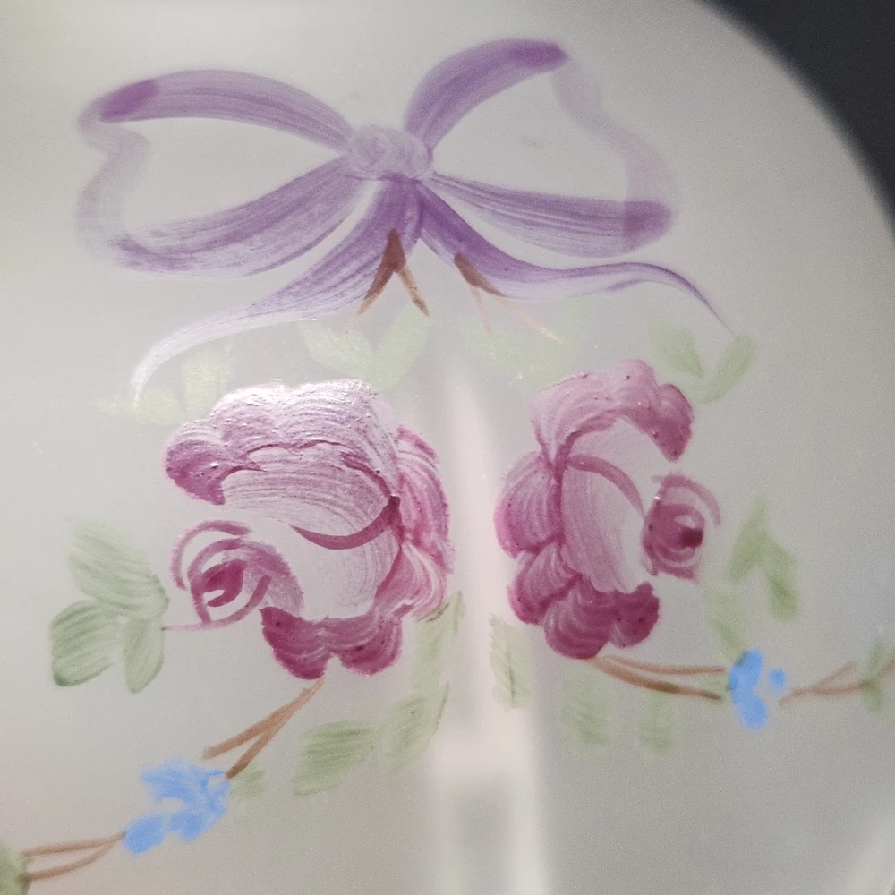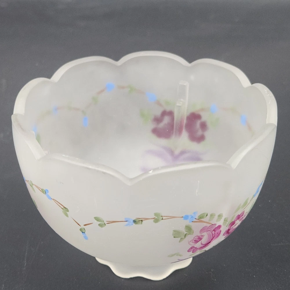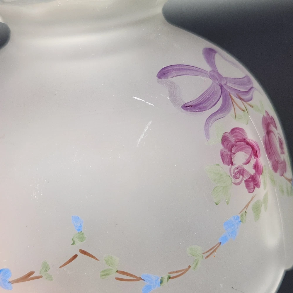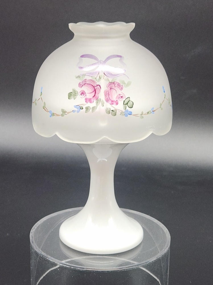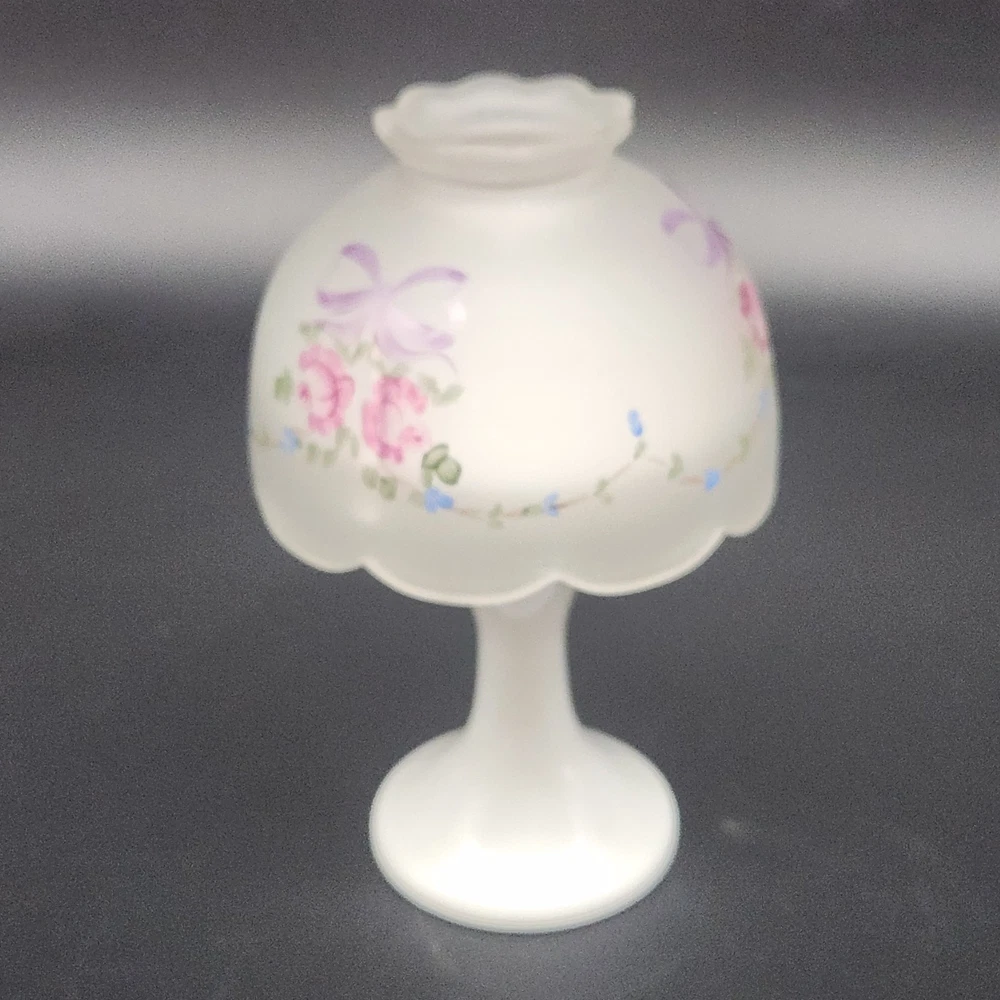 A vintage Westmoreland fairy light featuring hand-painted roses and bows on frosted milk glass. This elegant piece emits a warm, nostalgic glow when a votive or tea light is added. • Hand-painted floral and bow details • Frosted milk glass construction • Measures approximately 7.5 inches tall • Vintage collectible piece Used but in very good condition for its age. A few tiny surface scratches on the frosted glass. See photos for details.