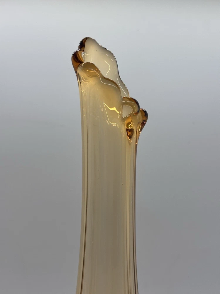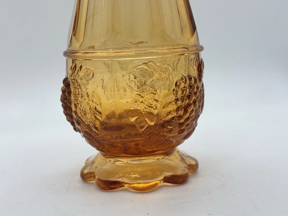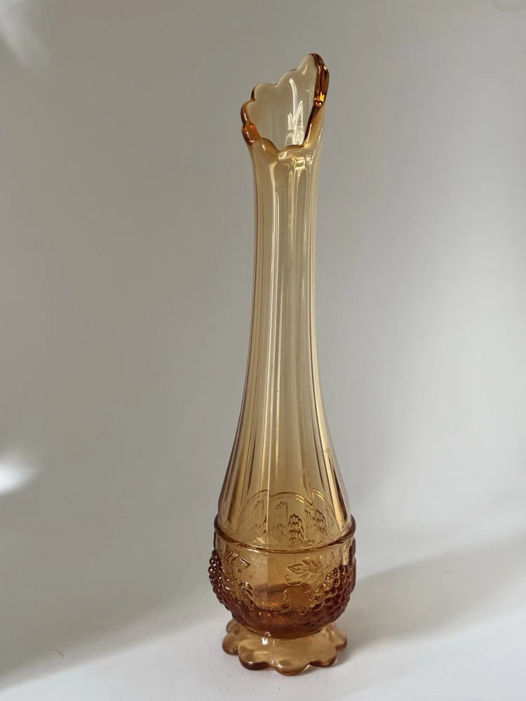 Westmoreland swung vase , paneled with grape leaves and bunches design Not a true amber , a little more to peach color 11.5” h base is 2.5” Perfect condition no glass sickness or chips Experienced packing and fast shipping