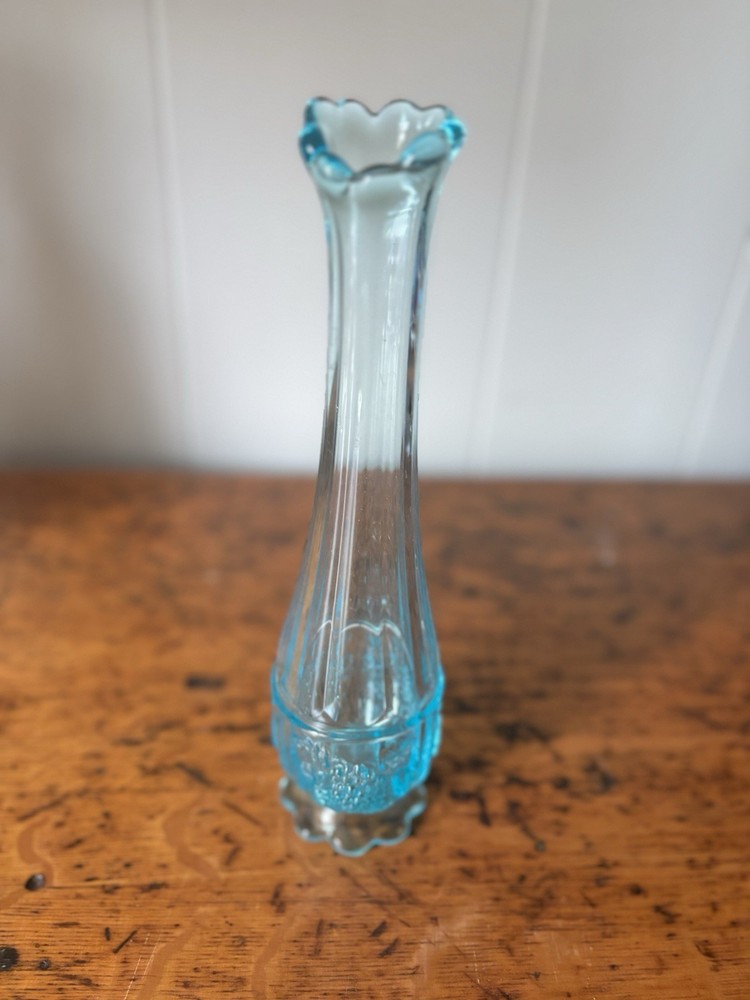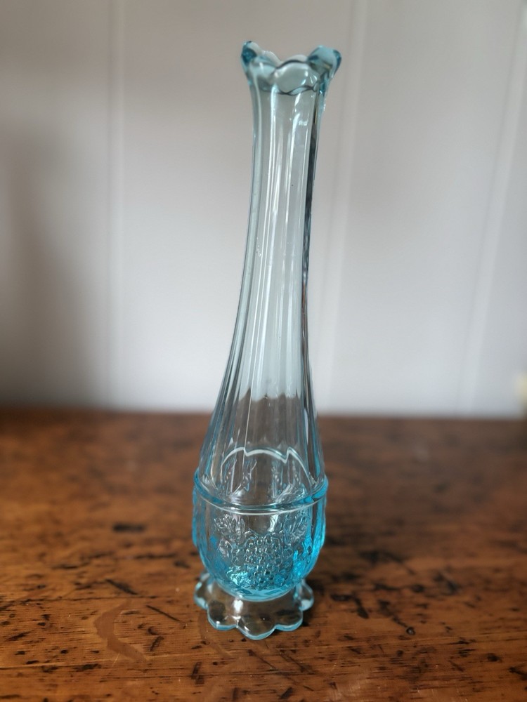Westmoreland swung vase , paneled with grape leaves and bunches design Teal Aqua light blue 11.5” h base is 2.5” Perfect condition no glass sickness or chips Experienced packing and fast shipping