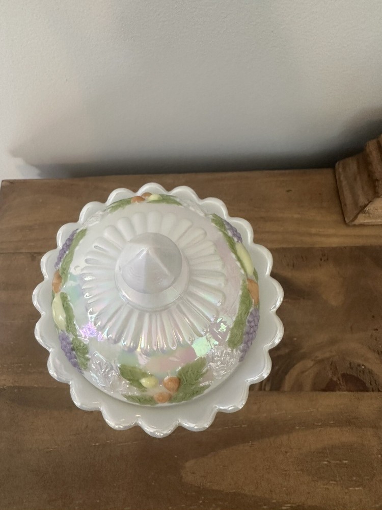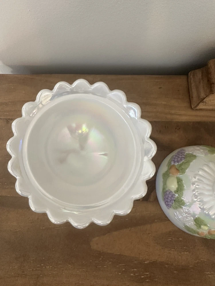 This is a beautiful Westmoreland Iridescent Pedestal Glass Candy Dish with Lid that has been hand painted with a fruit design. The dish is made of high-quality glass and features a white color that accentuates the intricate details of the hand-painted artwork. This collectible item is an original and was made in the United States using ceramic and porcelain materials. It is perfect for display and can be used to hold small candies or treats. No chips or cracks. 7”T with lid