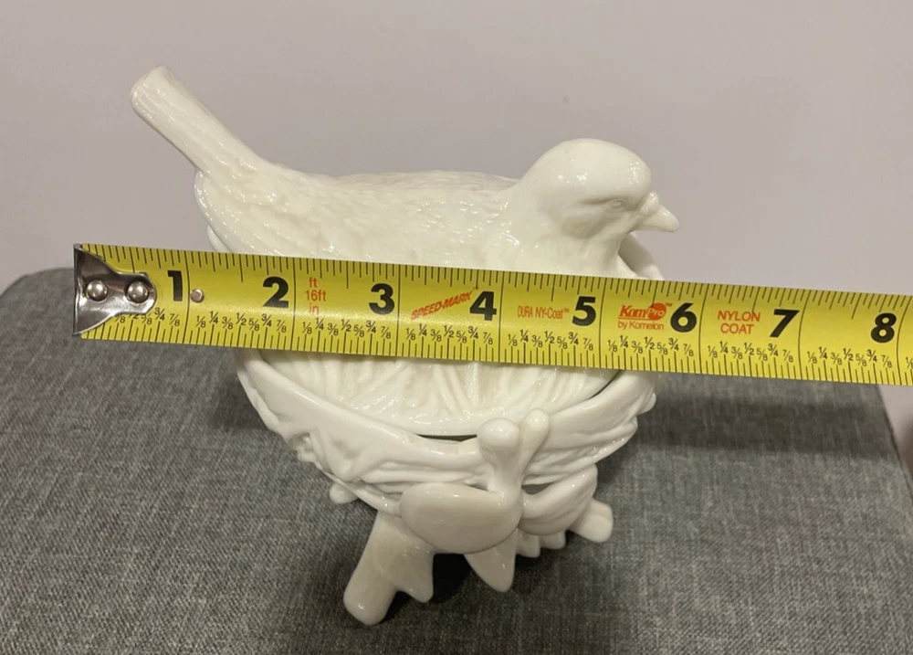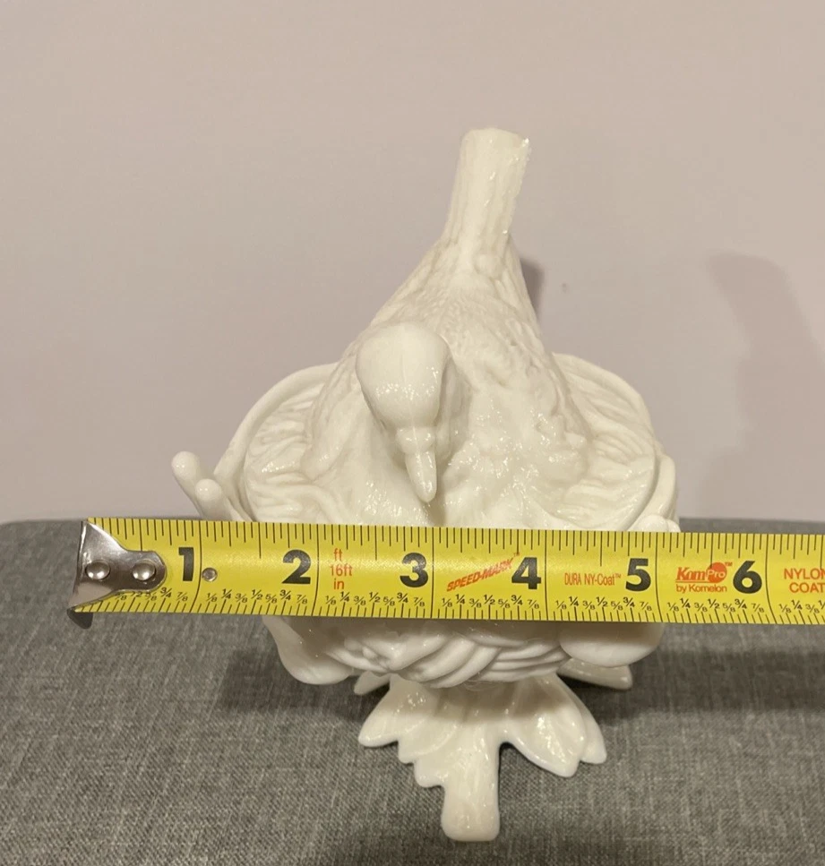 Experience the charm of yesteryear with this Vintage Westmoreland Milk Glass Hen on Nest Covered Candy Dish. The classic design features a white milk glass base adorned with a delicate bird motif, exuding a serene and timeless elegance. The round shape and footed base provide a stable platform, perfect for displaying as a centerpiece or storing sweets and confections. Crafted in the United States, this piece is a testament to the esteemed legacy of Westmoreland glassware. The milk glass production style adds a smooth, creamy texture that enhances the dish's visual appeal. Whether used for its intended purpose or as a collector's item, this candy dish brings a touch of historical sophistication to any setting. This item is in good condition, however there are two small chips on the rim of the nest and it appears the nest has had a repair done to it as seen in the pictures. Please refer to the pictures for the best details of the exact item you are receiving. Photos are NOT stock photos!