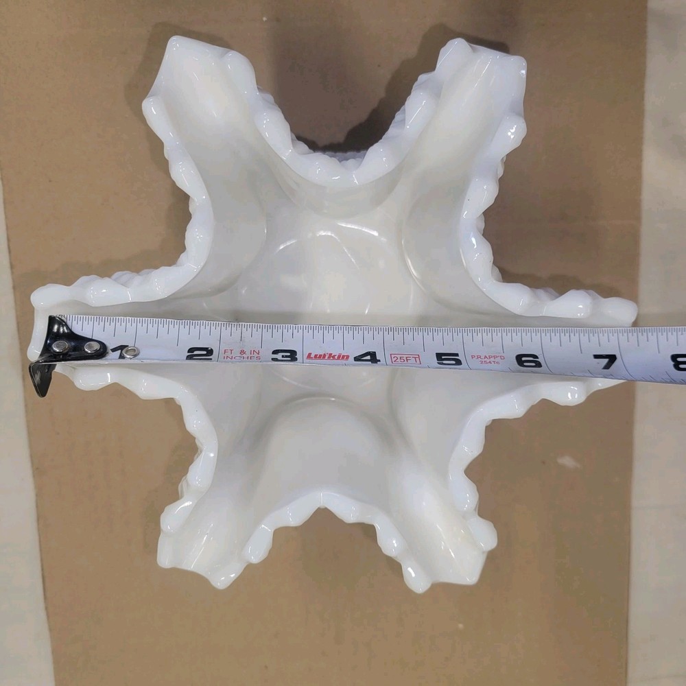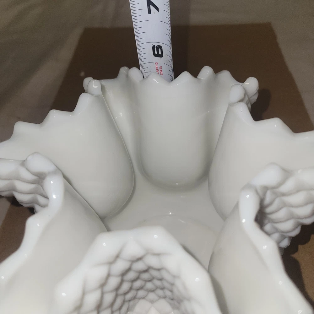 Vintage Westmoreland Milk Glass English Hobnail Diamond Deep Crimp Pinched Vase is a classic piece made of milk glass with an English Hobnail pattern. The vase features a deep crimp pinched design, adding a touch of elegance to any space. Made by Westmoreland, known for their high-quality glassware, this vintage piece is a beautiful and timeless addition to any collection. Very clean and in great condition.