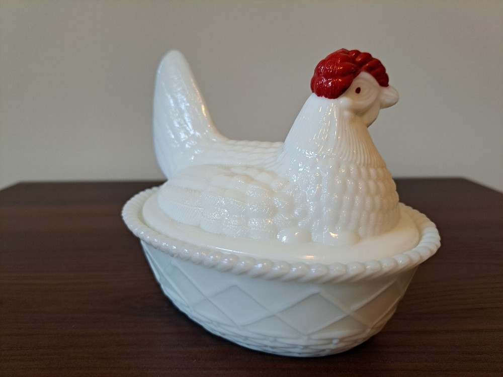 Vintage WESTMORELAND Nesting Hen Milk Glass Dish - 4 1/2 " Tall. The company stamp is on the inside of the top. There is a slight imperfection on the inside rim of the base piece. There is a picture that captures this. See all the pictures for the overall condition of the item. Let me know of any questions or if you need additional pictures. Thanks for your interest!