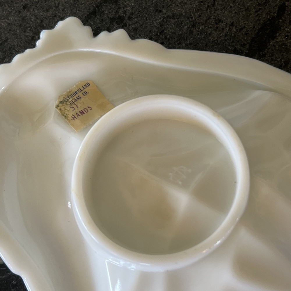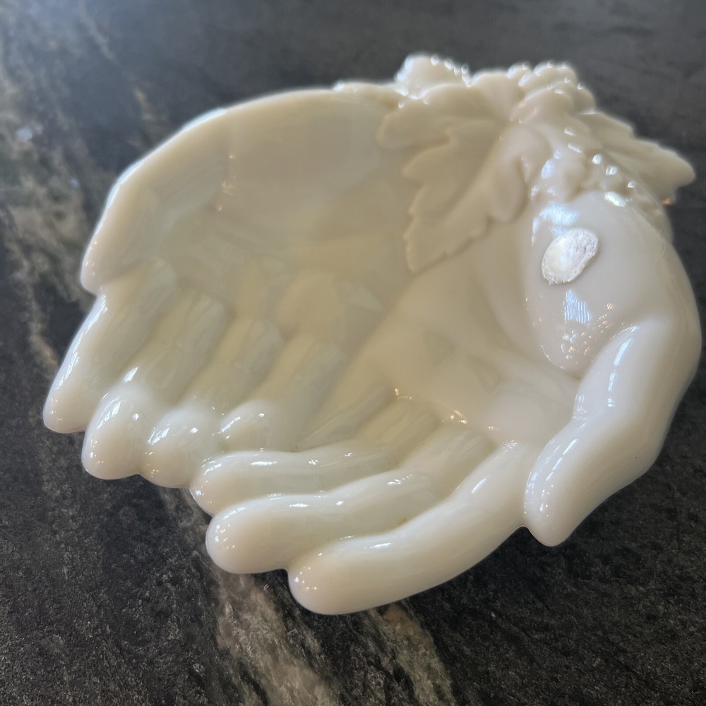 This vintage Westmoreland milk glass dish is stunning! The delicate open hands design makes it so versatile—perfect for holding jewelry, trinkets, or even as a soap dish. The quality is amazing, and it’s in excellent condition with the original price tag still intact. A beautiful, functional piece that adds charm to any space. Highly recommend!