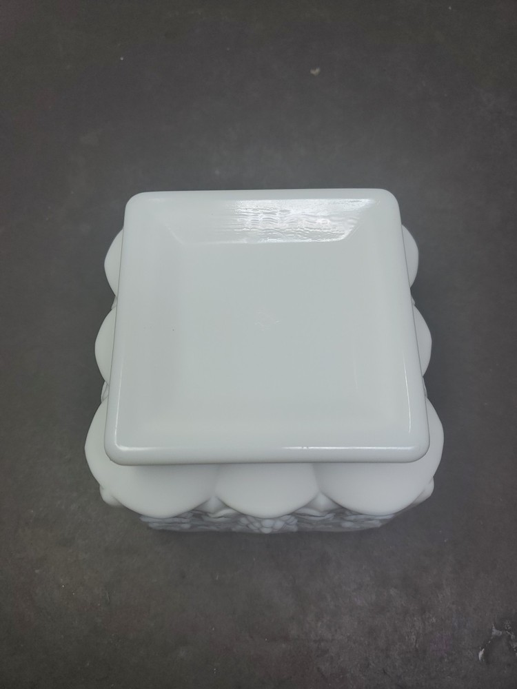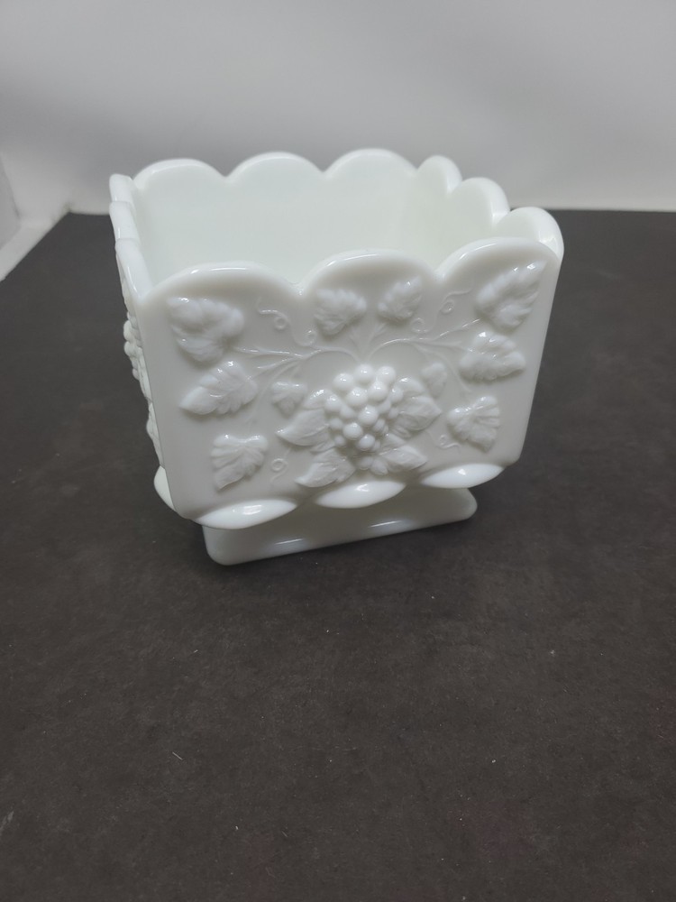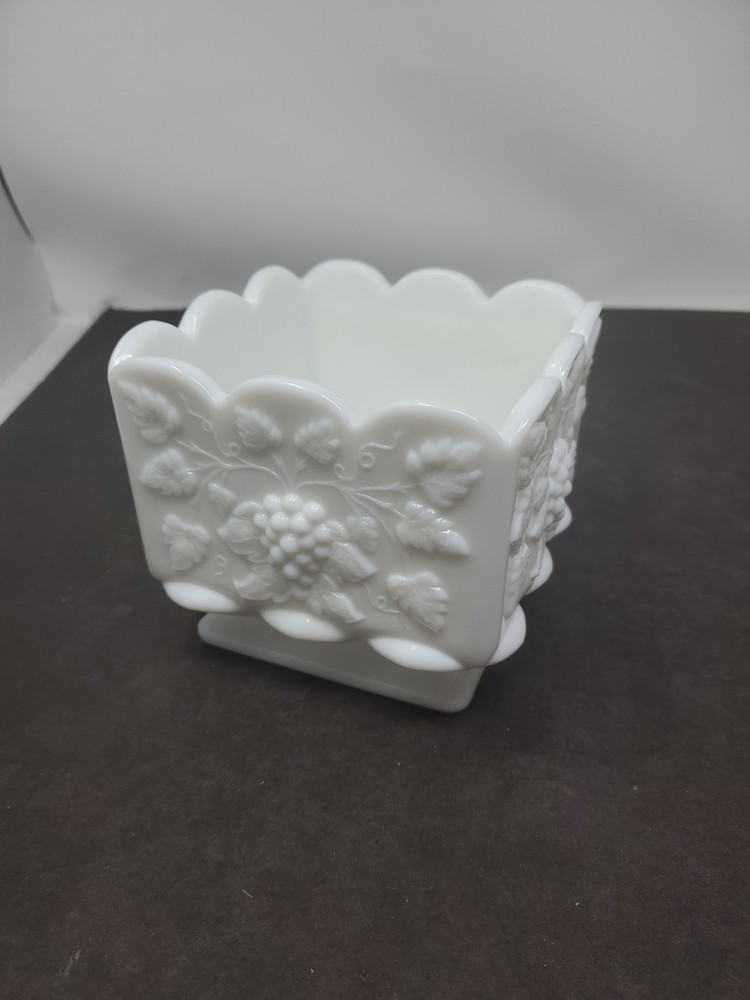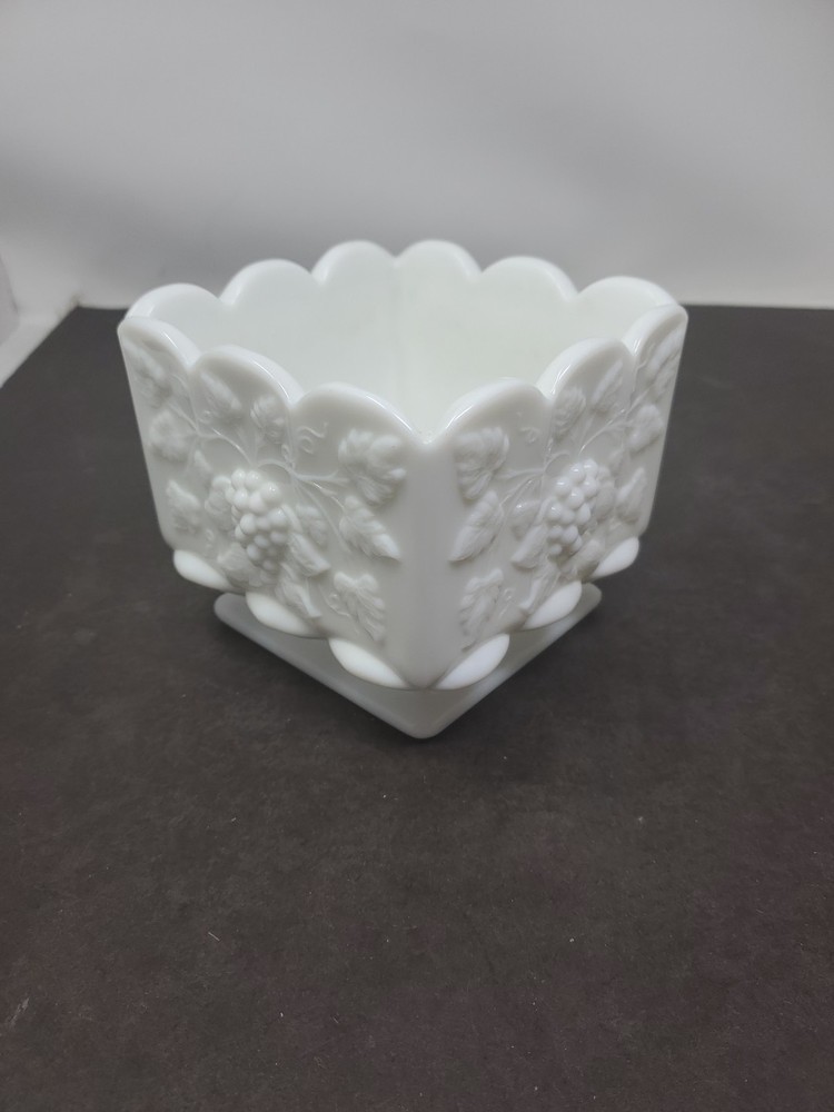 This vintage Westmoreland planter is a beautiful addition to any collection. The square shape and scalloped edge make it a unique piece, while the white milk glass material adds a touch of elegance. The planter is an original piece from the Paneled Grape product line, and is in excellent condition. Measuring 4 inches in height and 4.75 inches in length and width, this planter is the perfect size for any space. The item weighs 2 lb 2 oz, making it a sturdy and durable piece. This Westmoreland planter is a must-have for any collector or lover of decorative pottery and glassware. EUC no chips or cracks Shelf M5