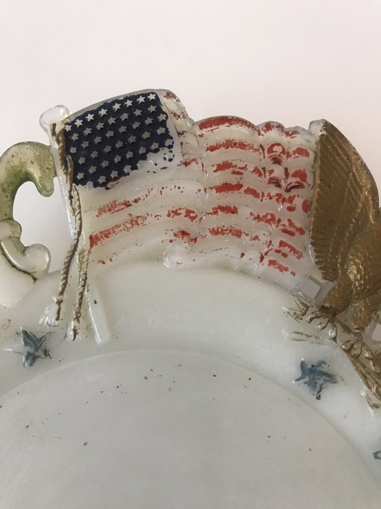 Delve into the rich history of American decor with this exquisite Westmoreland Milk Glass Collector Plate, featuring a vibrant display of the American flag, eagles, and fleur-de-lis design. Crafted in 1903, this piece embodies the patriotic spirit and ornate style of the Edwardian era, making it a timeless treasure for any collection. Measuring at 7.25 inches in diameter, the plate's round shape and multicolor palette are complemented by the high-quality glass material, ensuring both durability and aesthetic appeal. Proudly manufactured in the United States, this decorative plate is a testament to the intricate artistry and cultural heritage of early 20th-century America.