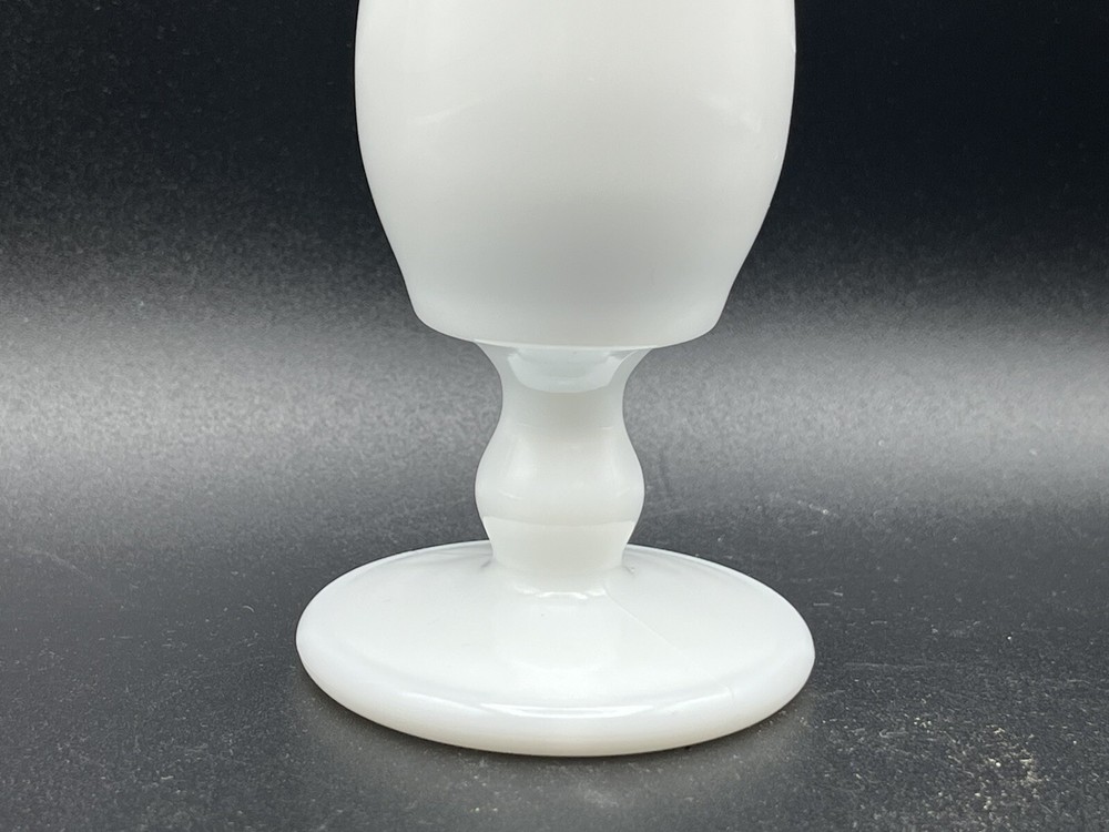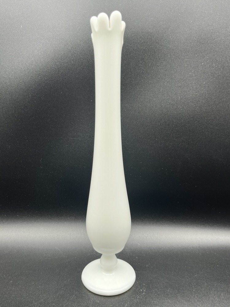 This vintage Westmoreland bud vase is a mid-century modern piece from the 1950s, originating from the United States. Handmade from white milk glass, it stands at 10.75 inches tall on a pedestal base. The vase features a hand-blown swung design with a glossy finish, making it a decorative and elegant addition to any space. Perfect for displaying flowers, this original piece embodies the charm and craftsmanship of mid-20th-century glassware.