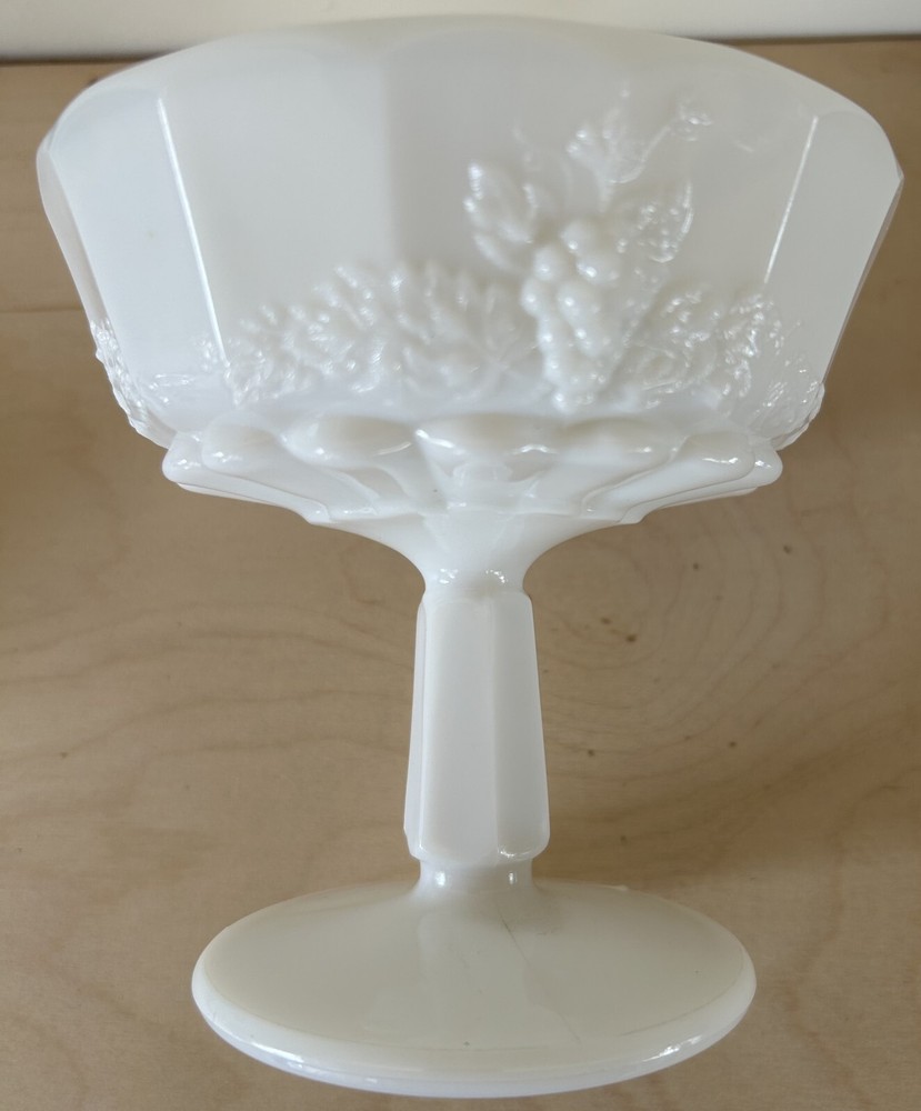 Handmade: No Number of Compartments: 1 Shape: Round Finish: Glossy Color: White Type: Candy Dish Antique: No Brand: Westmoreland Material: Glass Time Period Manufactured: 1930-1939 Production Style: Milk Glass Pattern: GRAPE Vintage: Yes Original/Licensed Reproduction: Original Style: Mid-Century Modern Seller Notes: “EXCELLENT PRE-OWNED CONDITION DISPLAYED ONLY” Product Line: Paneled Grape Item Height: 7" Country/Region of Manufacture: United States