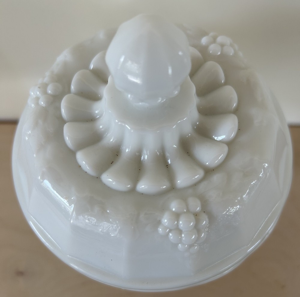 1. This vintage compote dish is absolutely stunning! The delicate grape pattern and milky white glass give it such an elegant, timeless look. Perfect for displaying candies, trinkets, or even as a standalone decor piece. The pedestal base adds a touch of sophistication, and the lid keeps contents fresh. A beautiful addition to any home!