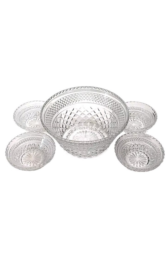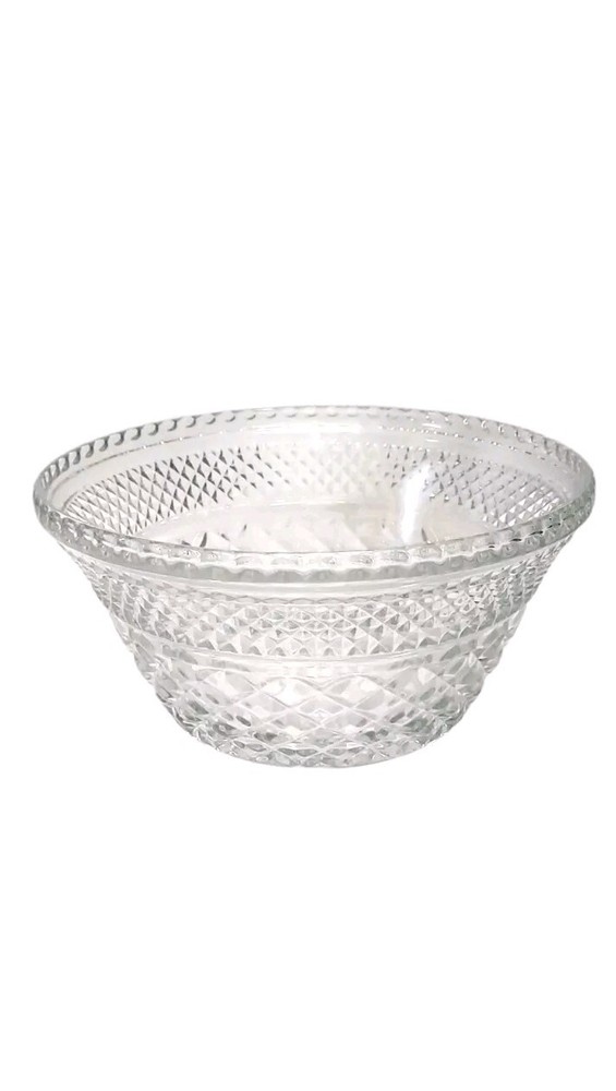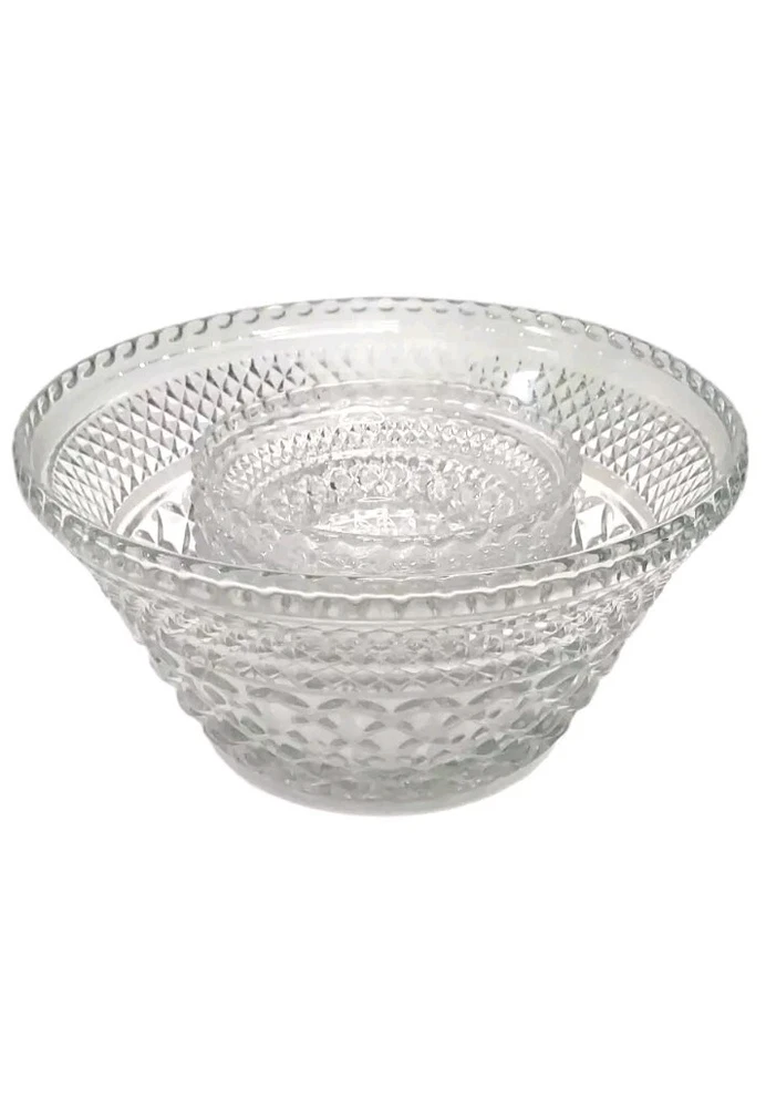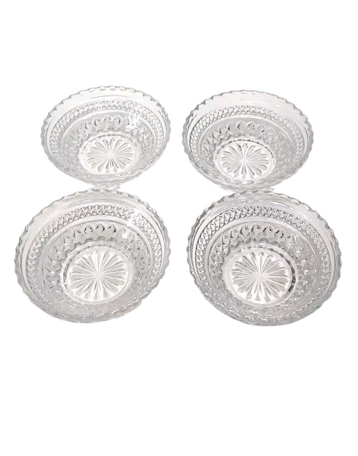 Vintage Anchor Hocking Wexford 5pc Serving Set made from the 1960s to the early 90s. This set includes four small Berry Dessert Bowls & one large Serving Bowl, all made of clear pressed glass. The design features a retro Mid-Century Modern style & is 100% functional & displays beautifully. All bowls are in excellent condition! The large bowl measures 9½" wide & 5" tall. The small bowls each measure 5¼" wide & 1½" tall. Manufactured by Anchor Hocking in the United States, this set is a charming addition to any kitchen or dining room. These will ship with immense care, fast & FREE! If you have any questions or would like more pictures of a certain angle I may have missed just reach out & I will reply promptly. Thank you!