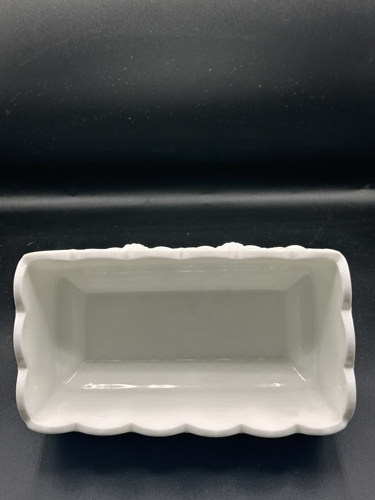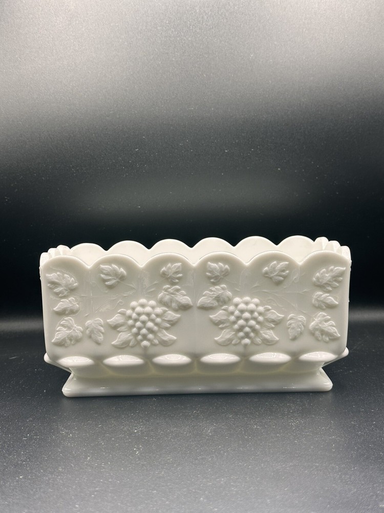 Vintage Westmorland White Milk Glass Paneled Grape Window Box Planter/Vase is a decorative piece featuring a grape pattern on glass. This Vase is designed in a boxing theme with a milk glass production style. It comes in a white color and packaged in a box. The product line is called Paneled Grape, showcasing a classic and elegant design. 8.5” x 4.5”