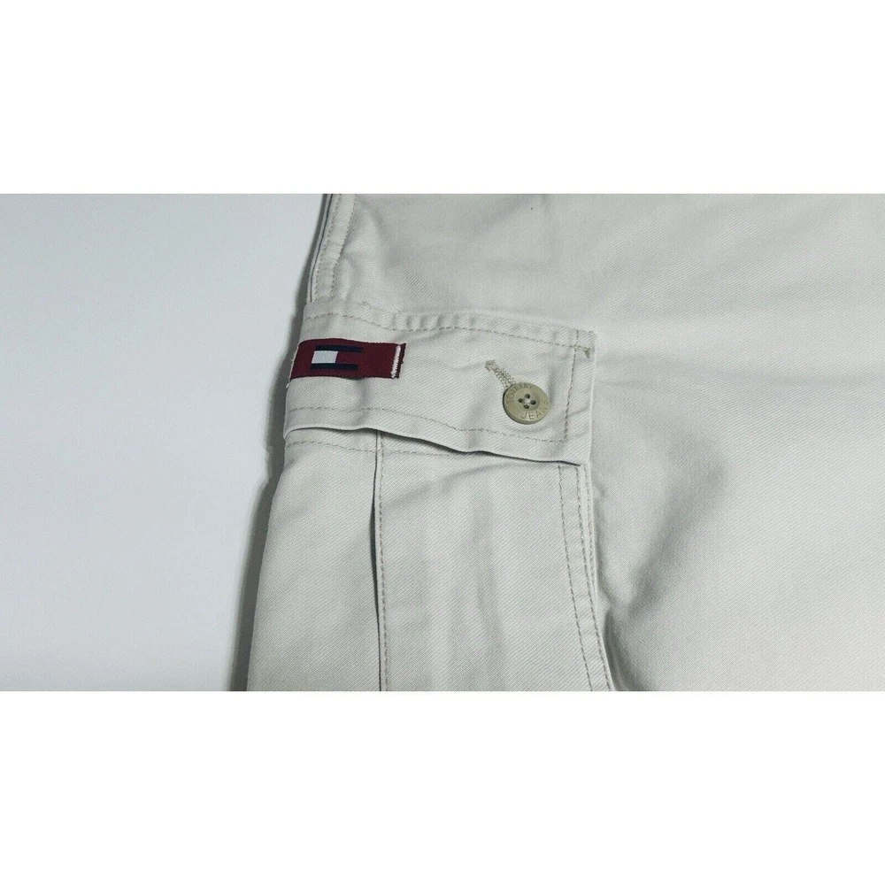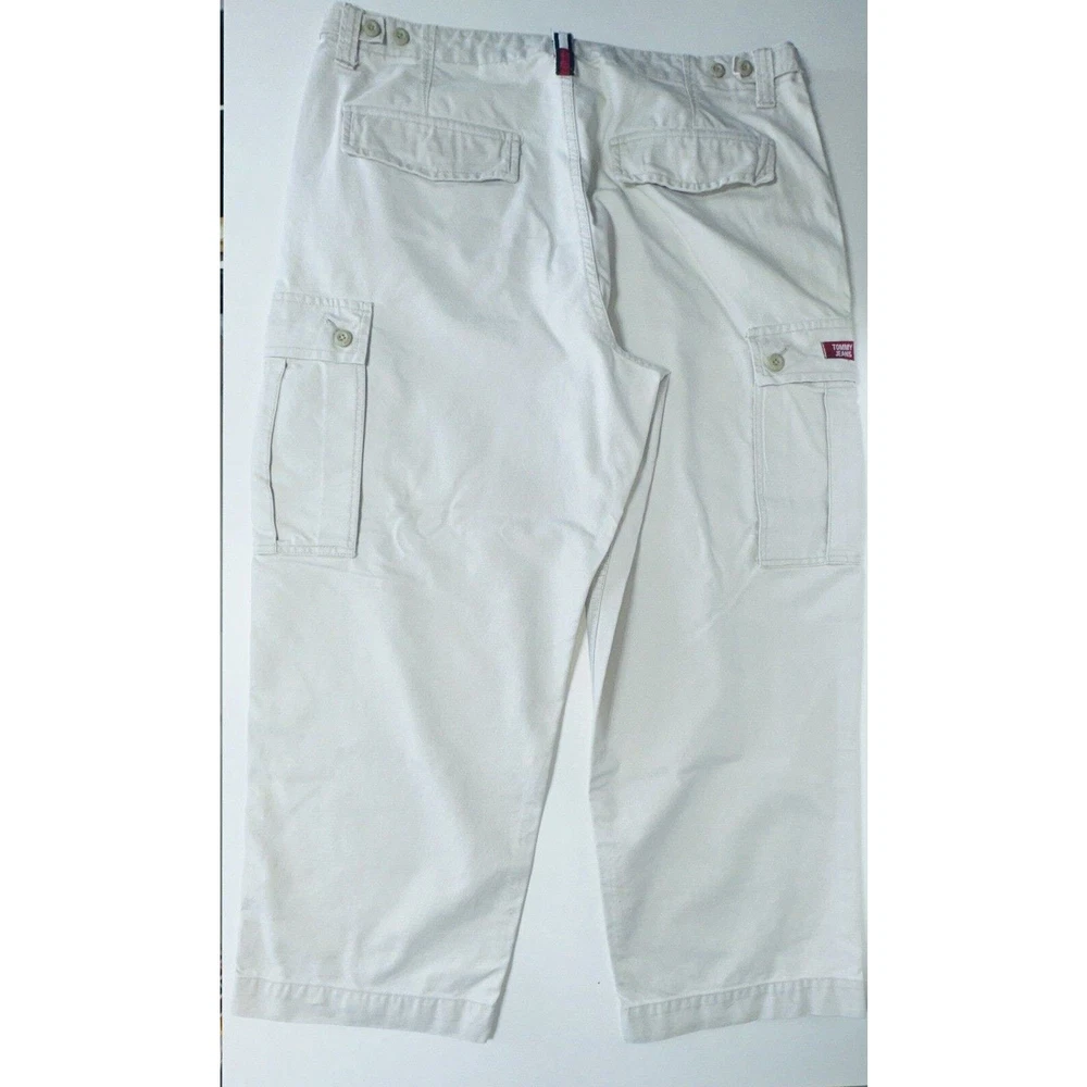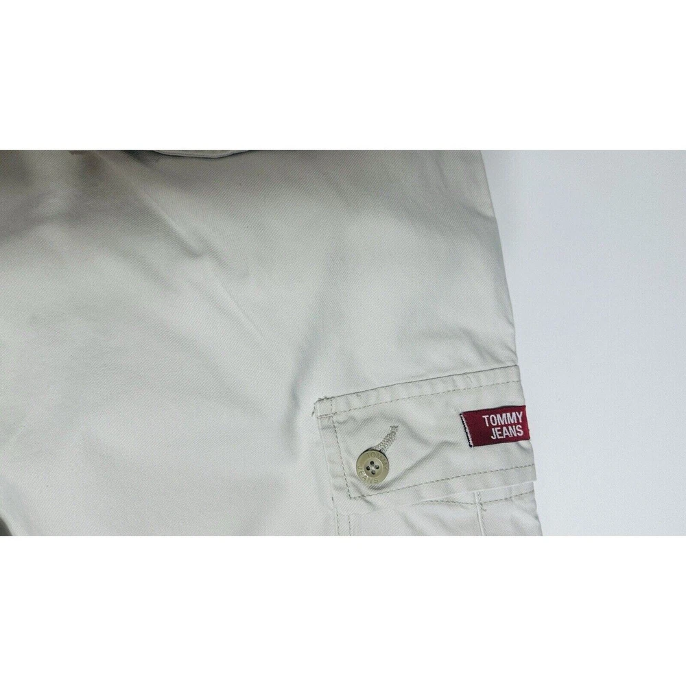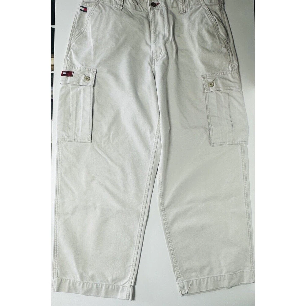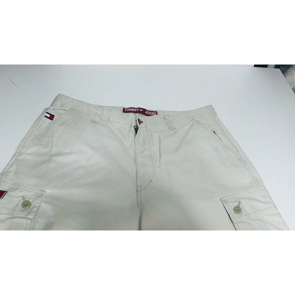Images with the colorful wand are pointing out light flaws As you can see they are hardly visible Great pair of pants here with skater hip hop 90s vintage vibe! Elevate your wardrobe with these vintage Tommy Jeans cargo pants. The khaki beige color and wide leg design give them a unique 90s look that's perfect for casual, workwear, or business occasions. Made from durable cotton canvas fabric, these pants are easy to care for and comfortable to wear. Featuring a flat front and belt loops, these pants have a relaxed fit with a mid-rise waist size of 42 inches and a waist size of 38 inches. The cargo pockets and 5-pocket design provide ample storage space for your essentials. Perfect for any season, these pants are a must-have for any skating or vintage enthusiast.