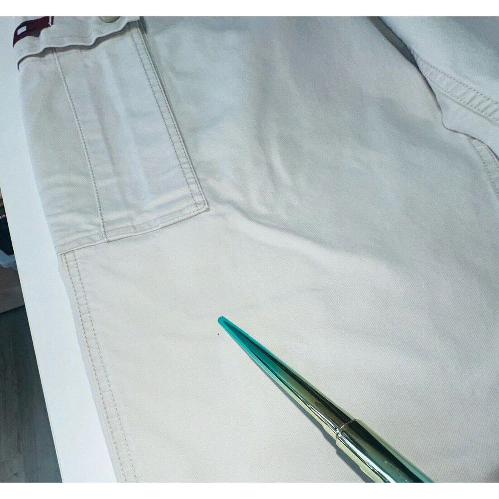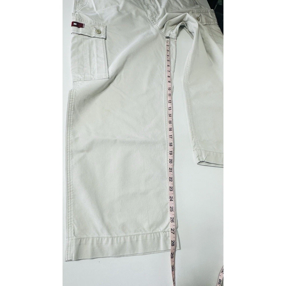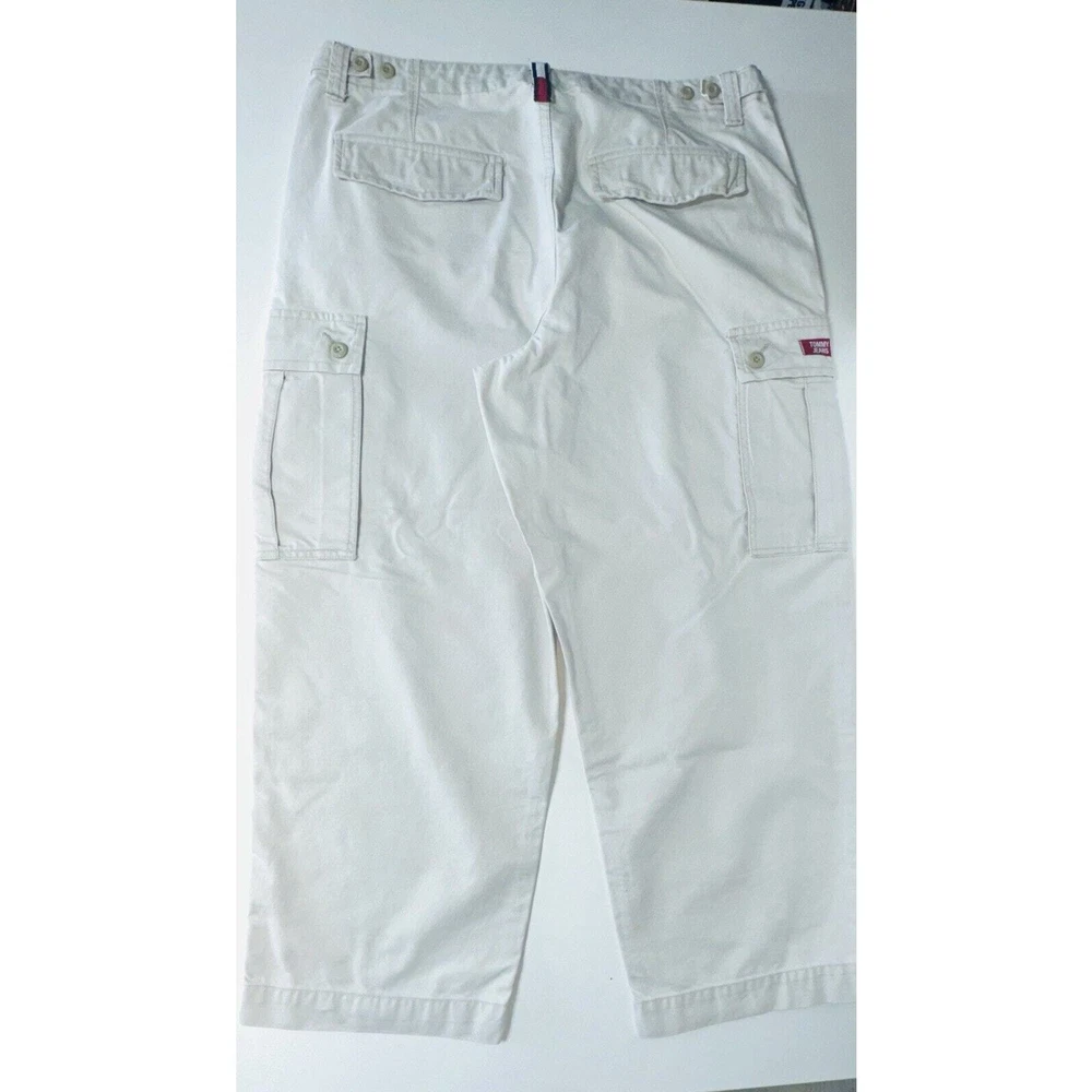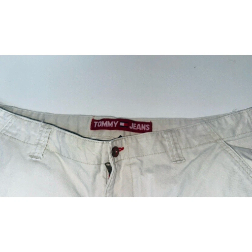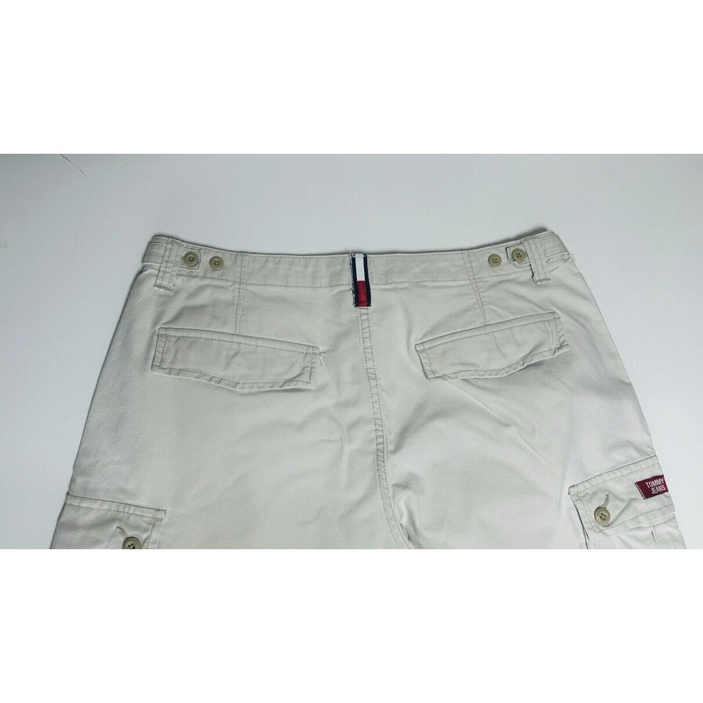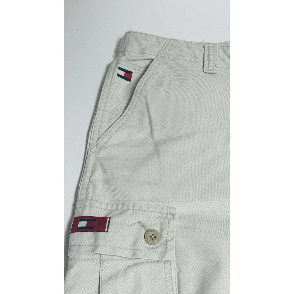 Images with the colorful wand are pointing out light flaws As you can see they are hardly visible Great pair of pants here with skater hip hop 90s vintage vibe! Elevate your wardrobe with these vintage Tommy Jeans cargo pants. The khaki beige color and wide leg design give them a unique 90s look that's perfect for casual, workwear, or business occasions. Made from durable cotton canvas fabric, these pants are easy to care for and comfortable to wear. Featuring a flat front and belt loops, these pants have a relaxed fit with a mid-rise waist size of 42 inches and a waist size of 38 inches. The cargo pockets and 5-pocket design provide ample storage space for your essentials. Perfect for any season, these pants are a must-have for any skating or vintage enthusiast.