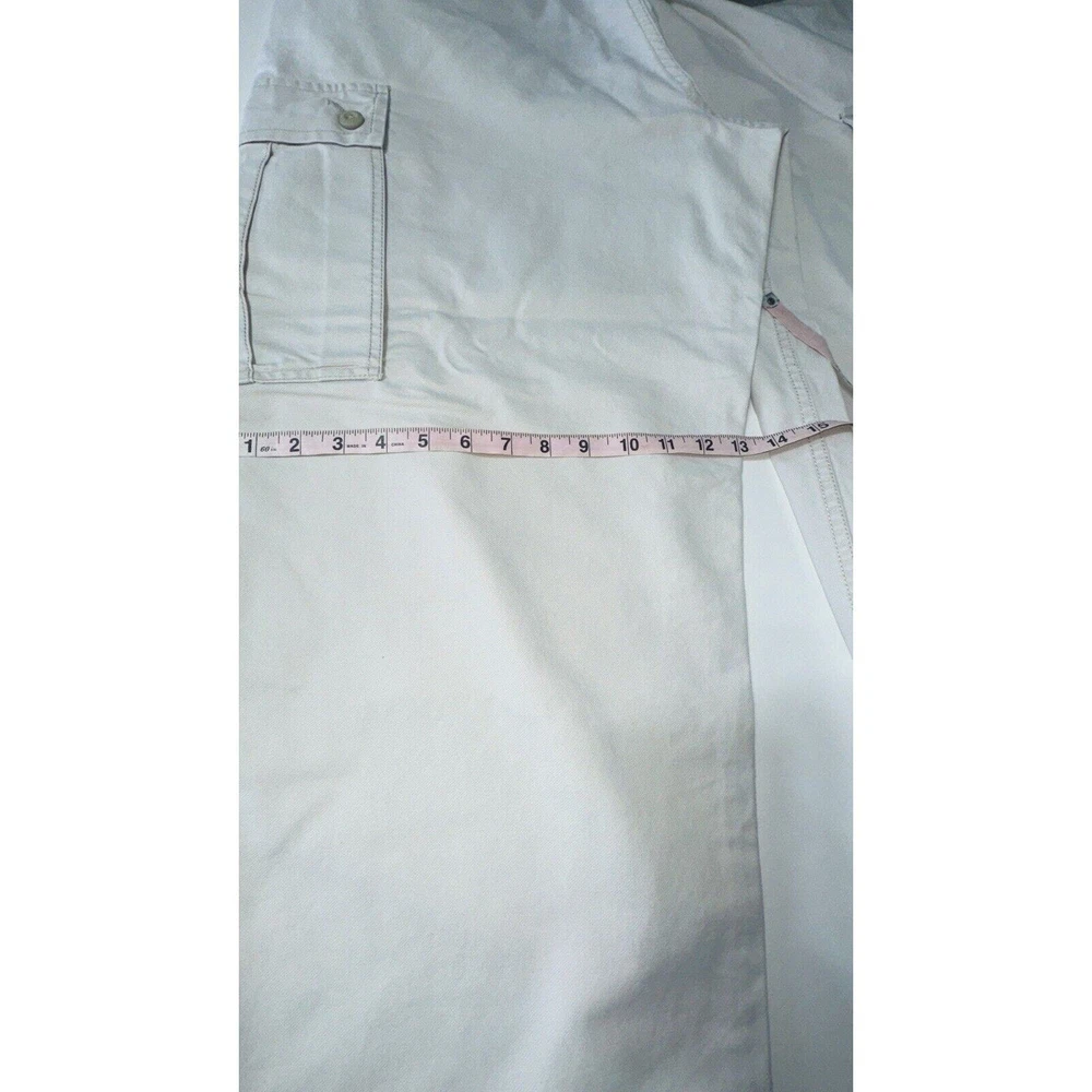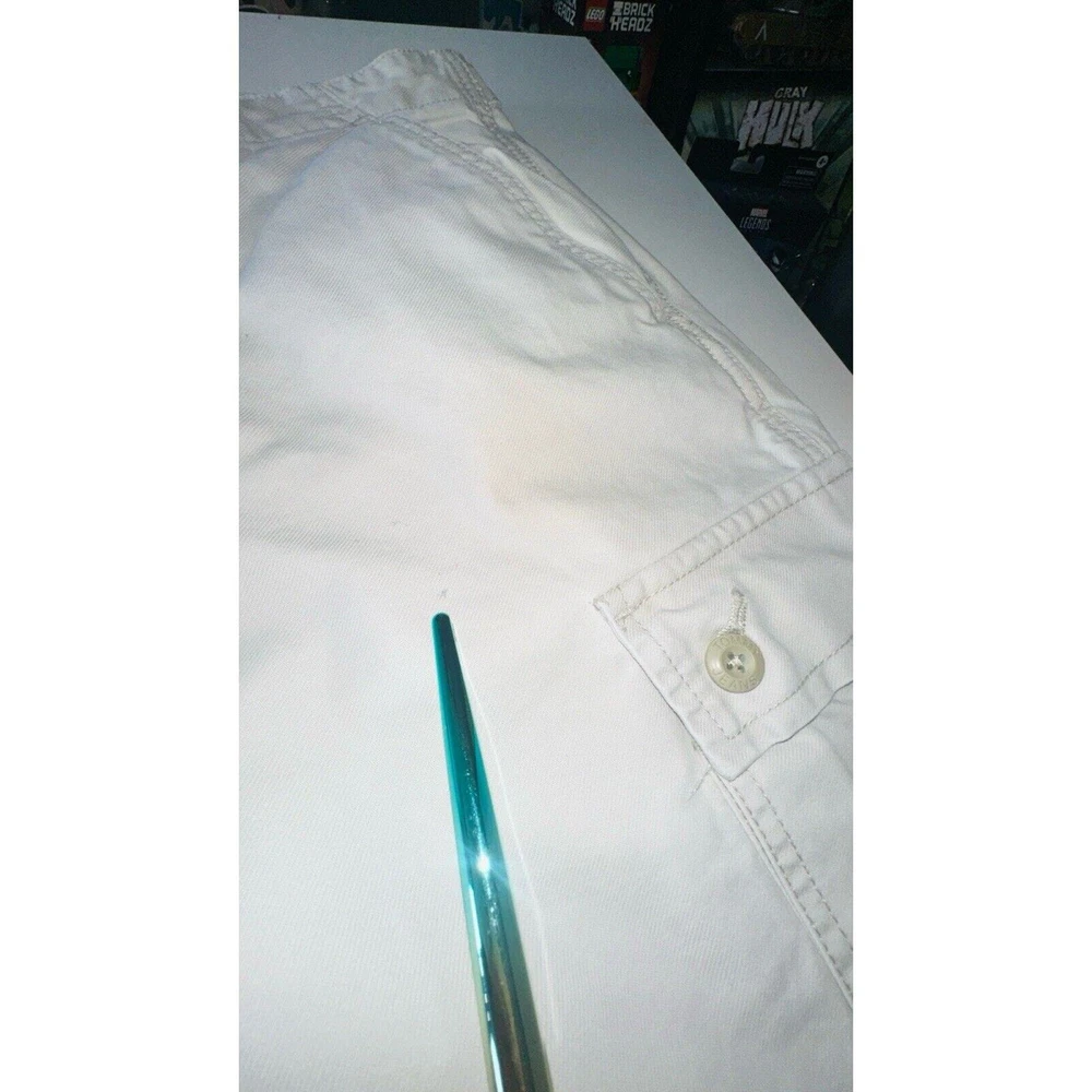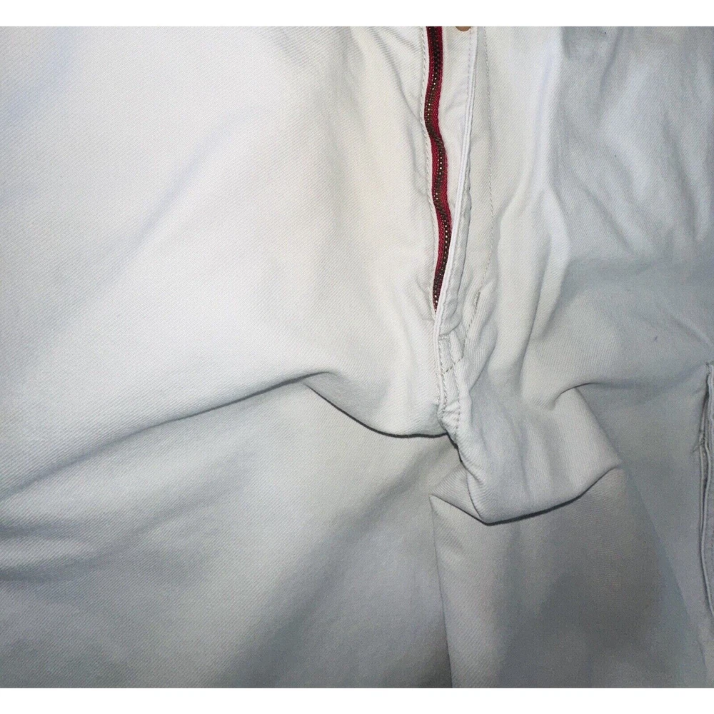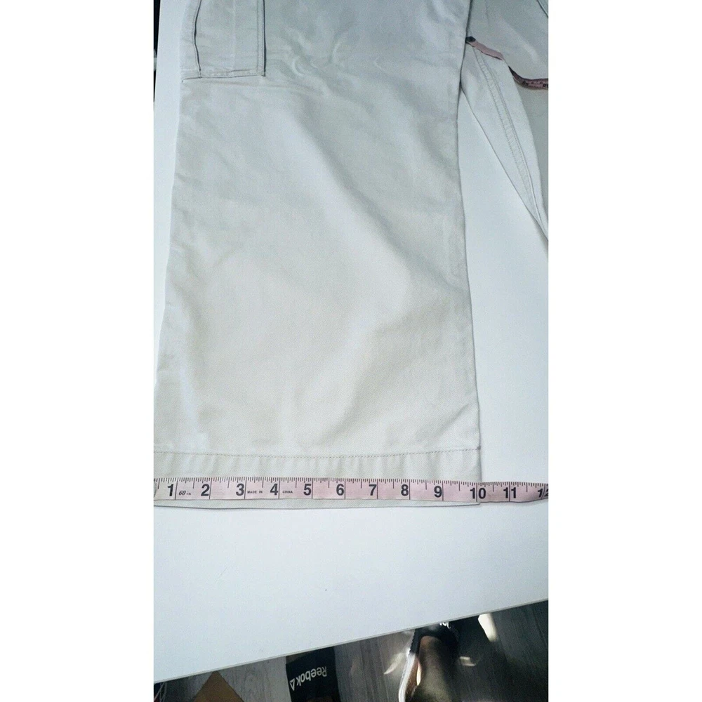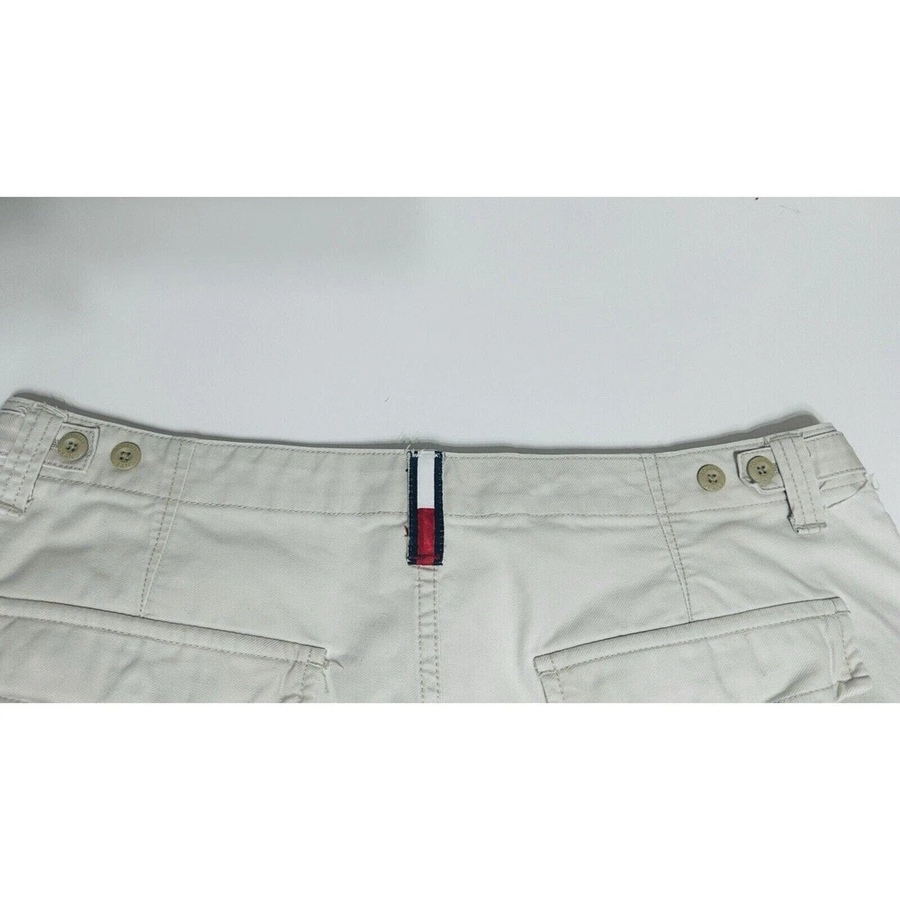 Images with the colorful wand are pointing out light flaws As you can see they are hardly visible Great pair of pants here with skater hip hop 90s vintage vibe! Elevate your wardrobe with these vintage Tommy Jeans cargo pants. The khaki beige color and wide leg design give them a unique 90s look that's perfect for casual, workwear, or business occasions. Made from durable cotton canvas fabric, these pants are easy to care for and comfortable to wear. Featuring a flat front and belt loops, these pants have a relaxed fit with a mid-rise waist size of 42 inches and a waist size of 38 inches. The cargo pockets and 5-pocket design provide ample storage space for your essentials. Perfect for any season, these pants are a must-have for any skating or vintage enthusiast.