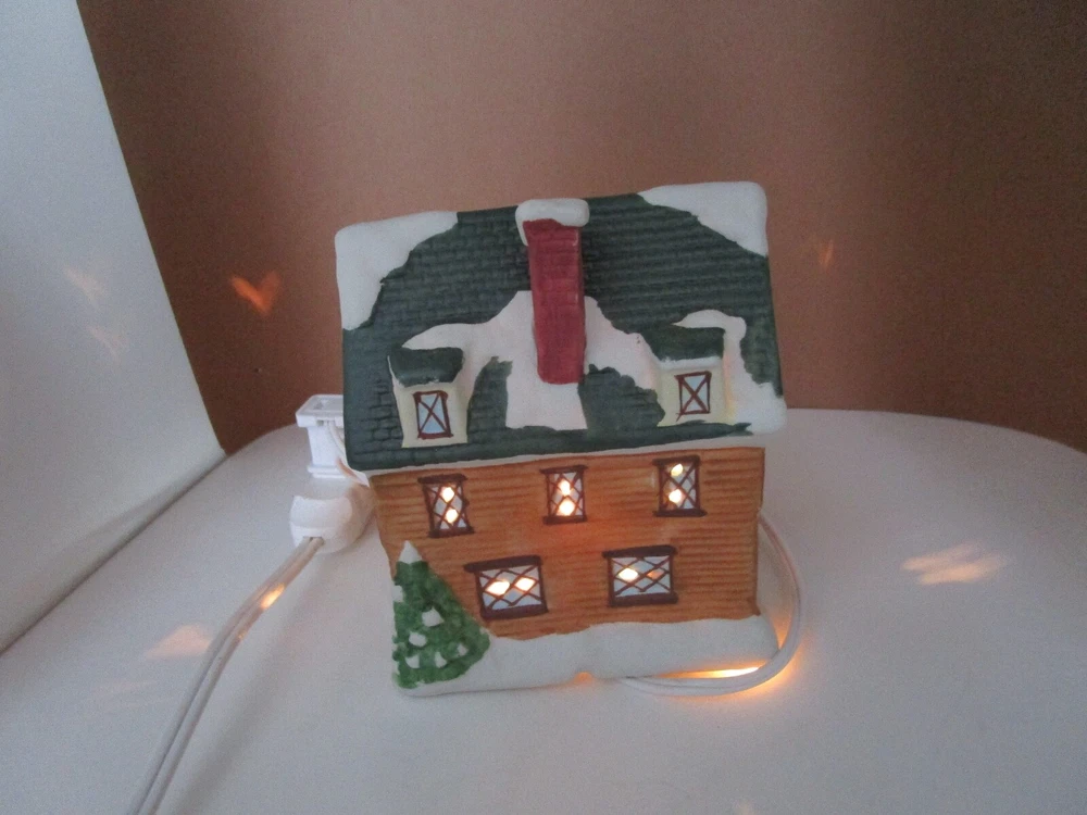 A Vintage Porcelain Christmas Village House. Measures about 5 3/8" in height. Includes the cord and bulb, and it works. CONDITION: In nice shape. Some surface scratches, and some scuffing and discoloration on the bottom rim from display. The box is in okay shape, with some general wear and tear. I purchase all of my items at auctions, estate sales and flea markets so cannot be sure of their history or whether they've come from smoke-free or pet-free homes. I do my best to list any damage or use, but I'm not an expert. So if there's something specific you need to know before bidding, please ask. Payment is due within three days. Thank you!
