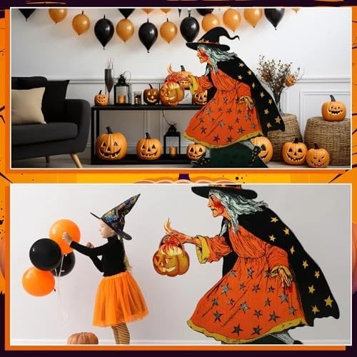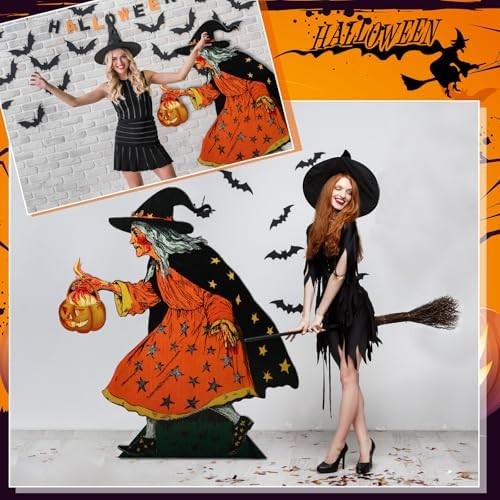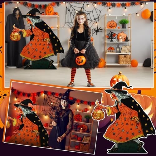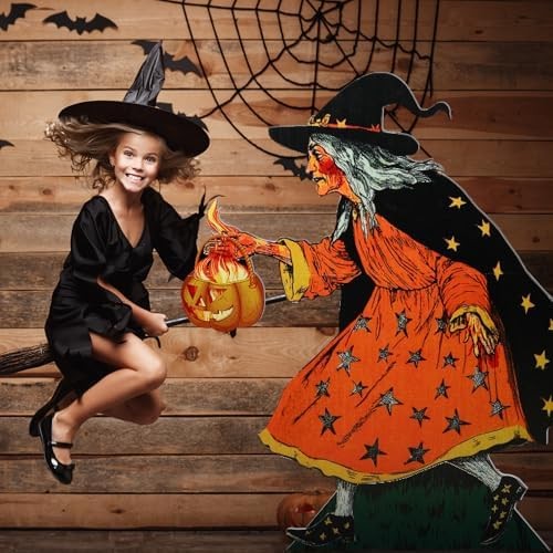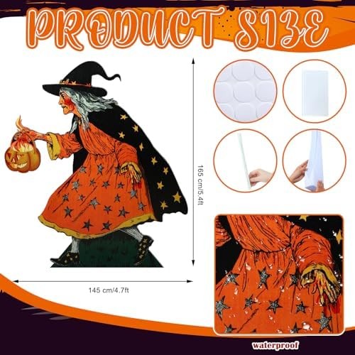 Vintage Witch with Pumpkin Cardboard Cutout Stand up: you will receive a set of Vintage Halloween witch with lantern stand up decoration set, connecting rods, plastic patches, and 1 installation instruction; It provides the components needed for Halloween witch and lantern cardboard stand-ups party decoration, easy to use Quality PVC Material: we use quality PVC material to ensure the durability and long-lasting nature of the witch and pumpkin decorations; Its waterproof performance ensures long-term use without worrying about damage caused by wet weather; Witch and moon standup's quality can be the pride of your party decorations Vintage Witch with Pumpkin Cardboard Cutout Stand up Decoration Size Details: 5 feet tall (about 1.5 meters) after assembly, large enough size and its classic witch with pumpkin design, this witch will be the focus of your horror party. Whether indoors or outdoors, this large Witch with pumpkin lantern display will attract attention at your event and is an ideal Halloween party photo backdrop Easy Assembly and Disassembly: our Witch with pumpkin lantern centerpiece comes with all necessary installation tools and easy-to-follow installation instructions; Self-adhesive support stakes are easy to use; Sufficient number of connecting rods ensure that the large hollow decorative column remains in good condition, plastic patches minimize creases, and the detachable design is also convenient for packaging Witch with pumpkin lantern Decorations and Photography Props: our witch with pumpkin lantern standup decoration is an ideal addition to any Halloween party or event, suitable for stage decoration or photo background for Halloween parties, school events, retro theme parties, and can also be applied to decorate indoors or courtyards. Whether you are hosting a Halloween party, a retro theme family gathering, or just want to enhance the existing decorations, it is a good choice