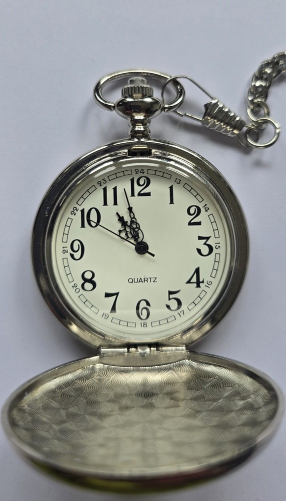 The Quartz Wolf Pocket Watch features a quartz movement for accurate timekeeping.