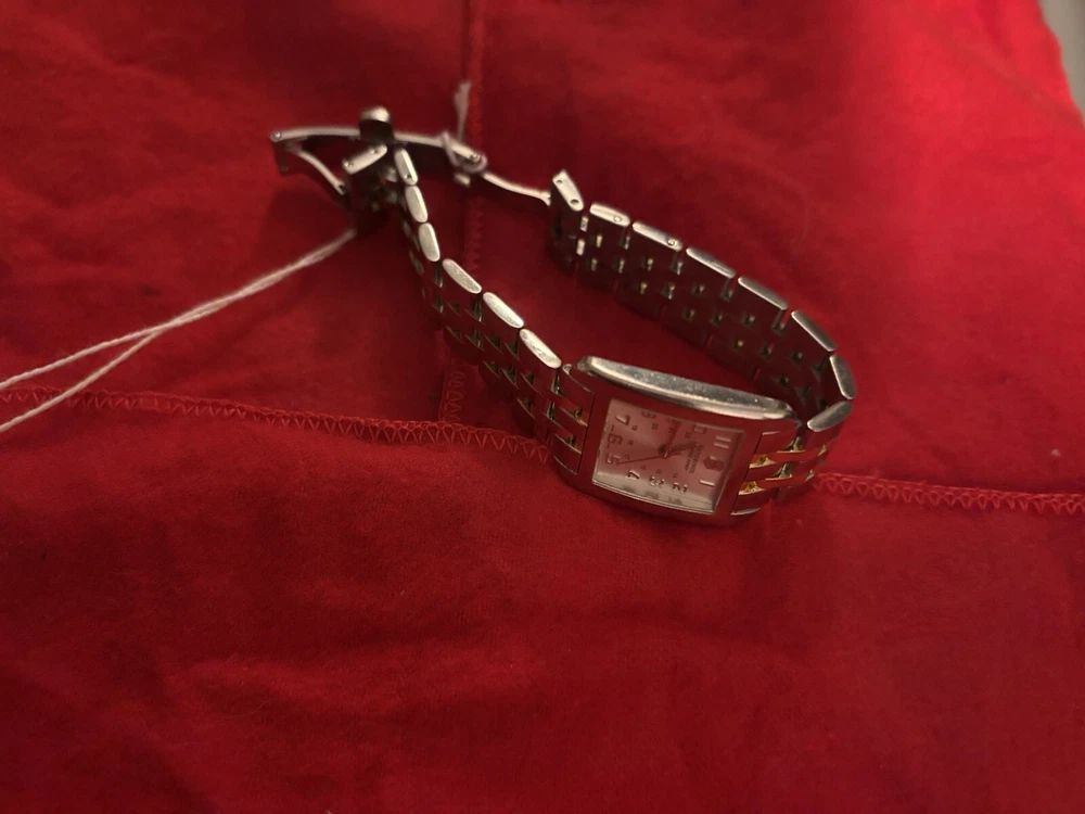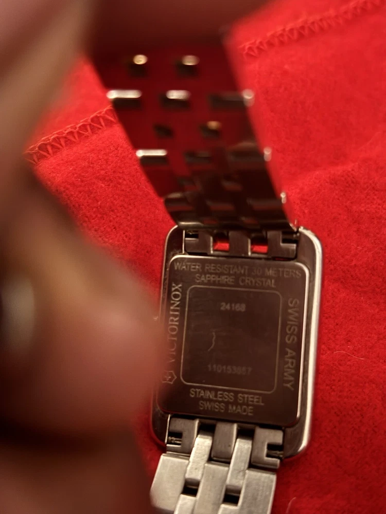 This vintage Victorinox Alliance wristwatch for women features a silver and gold-tone bracelet with a butterfly clasp closure. The square-shaped case is made of polished stainless steel with a smooth silver bezel. The watch has a silver face with Arabic numeral indices, a seconds hand, and a 12-hour dial. The watch is water-resistant up to 30 meters and is powered by a Swiss mechanical quartz movement. It comes with a seller's warranty and is not customized or handmade. The watch is left-handed and has a snap caseback. This luxury watch has a vintage feel and is perfect for both casual and military styles.