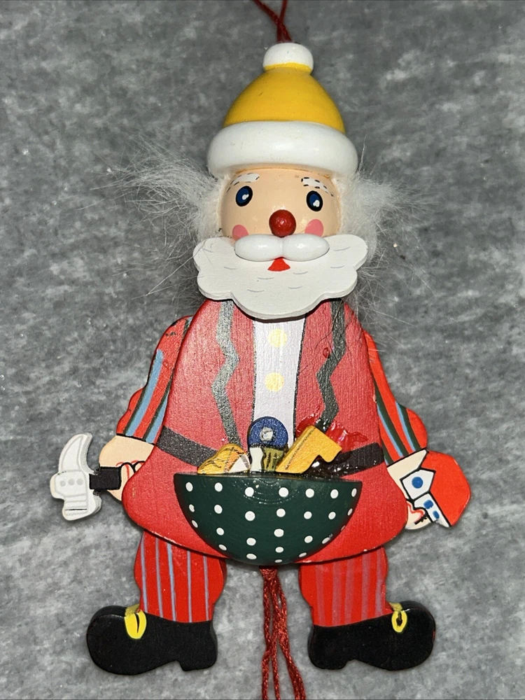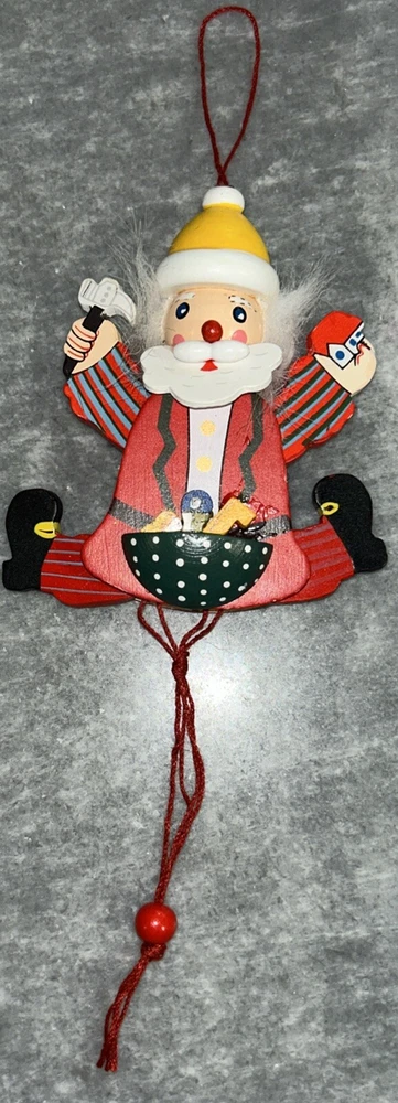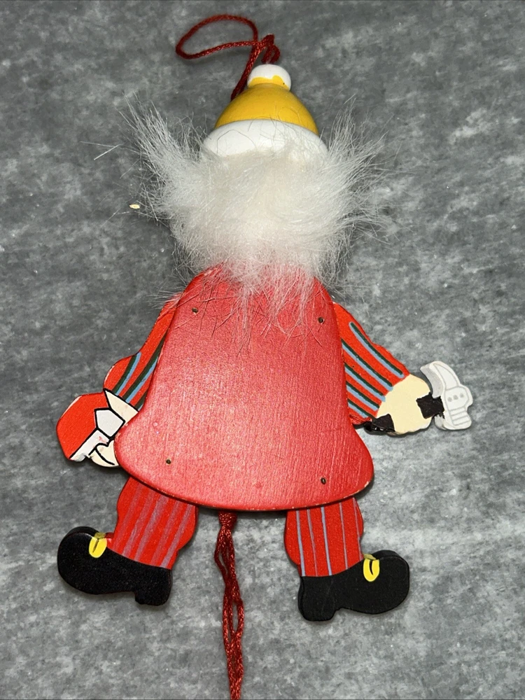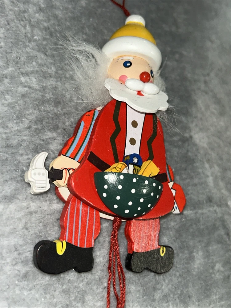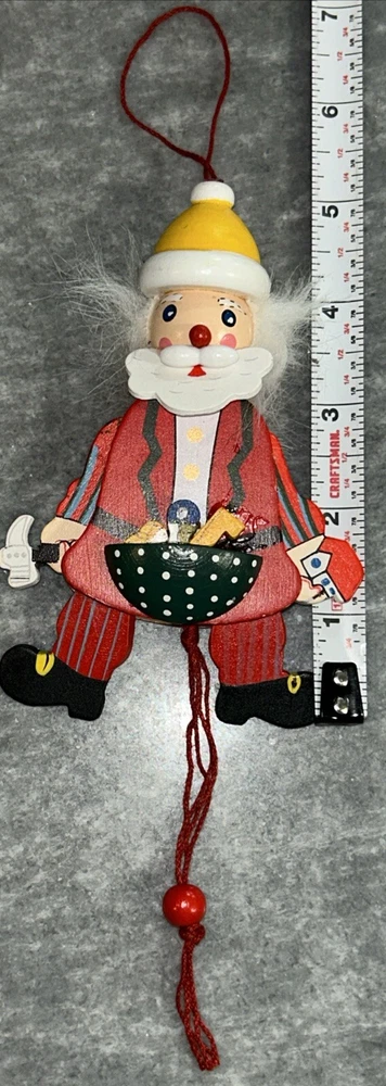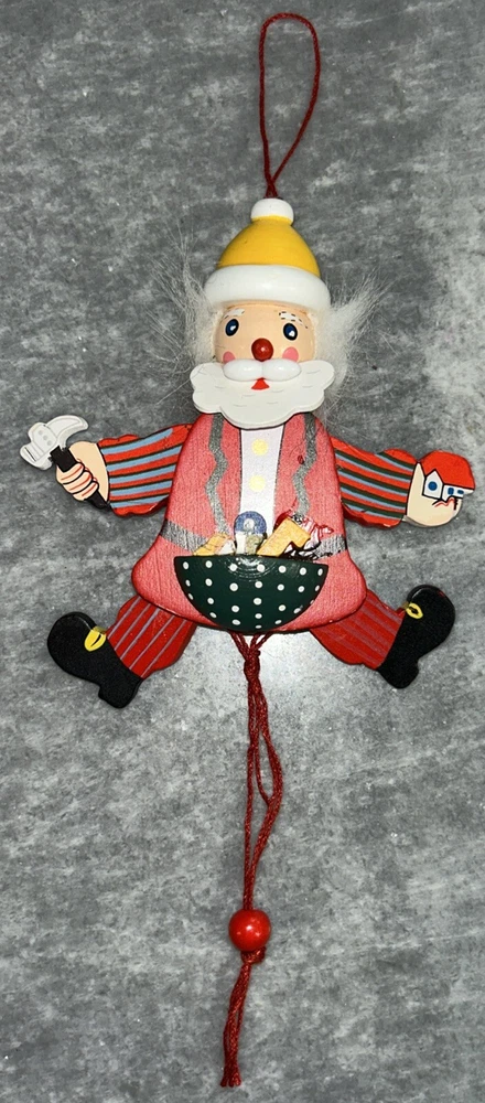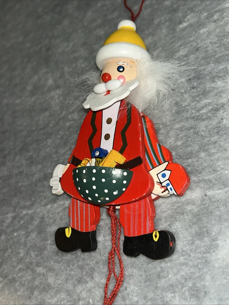 This vintage Christmas ornament features a charming santa pull puppet, perfect for adding a touch of whimsy to your holiday decor. Crafted from wood and handmade with care, this original piece boasts a unique all-over multicolor pattern and a workshop theme. Measuring approximately 5 inches in height and weighing just 1.5 ounces, this ornament is a great addition to any collection or a thoughtful gift for a child or adult alike.