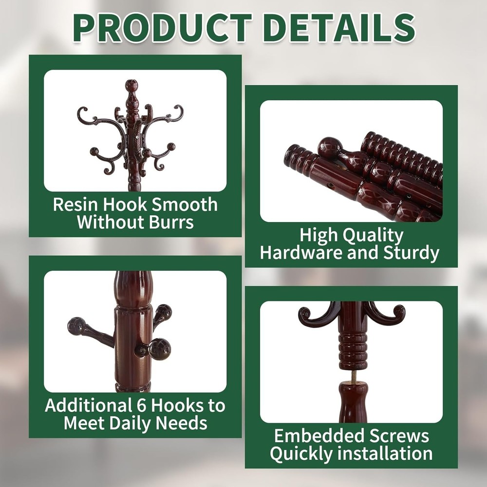 gtin13: Does not apply Type: Coat Rack Set Frame Material: Wood Installation Type: Free Standing Maximum Weight Recommendation: 300 Pounds Finish Type: Polished UPC: Does not apply Furniture Finish: Birch Personalized: No Features: Adjustable Height, Heavy Duty, Space Saver Batteries Included?: No Required Tools: No Hook Style: Round Base Recommended Uses For Product: Coats, Hats, Tie, Tie & Belt, Umbrella Mounting: Free Standing Item Weight: 11.24 pounds Finish: Polished Material: Wood, Birch Number of Hooks: 11-16 Special Features: Adjustable Height, Heavy Duty, Space Saver Product Dimensions: 13"d X 13"w X 70.7"h Department: Unisex Baby & Toddler, Adults, Kids, Teens Color: Birch Wood Special Feature: Adjustable Height, Heavy Duty, Space Saver Brand: Unbranded Number of Shelves: 0 Care Instructions: Easy Care Batteries Required?: No Included Components: Solid Wood Coat Rack Style: Vintage Load Capacity: 300 Pounds