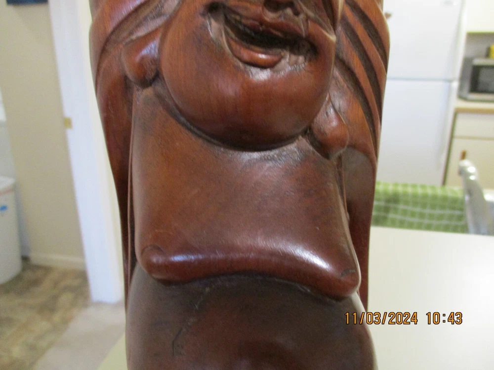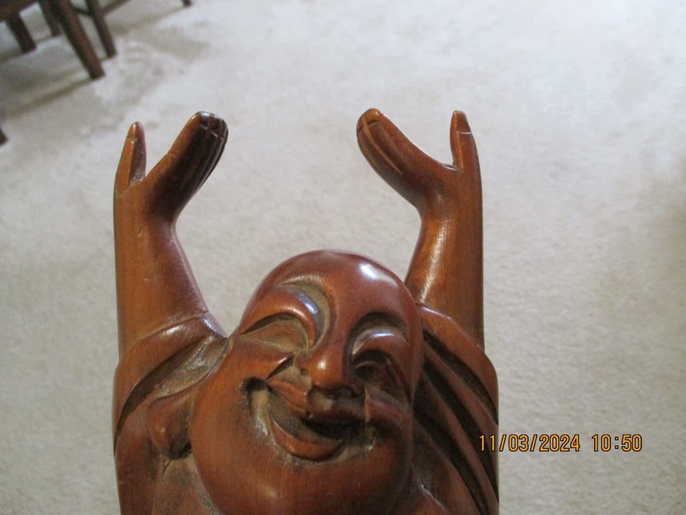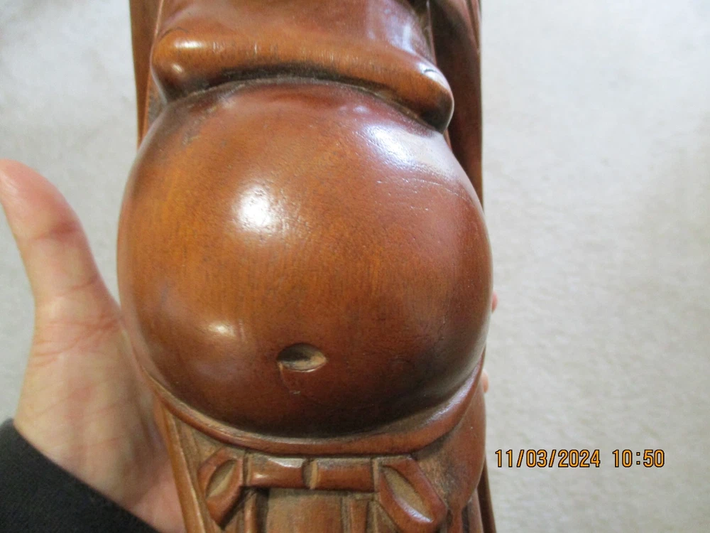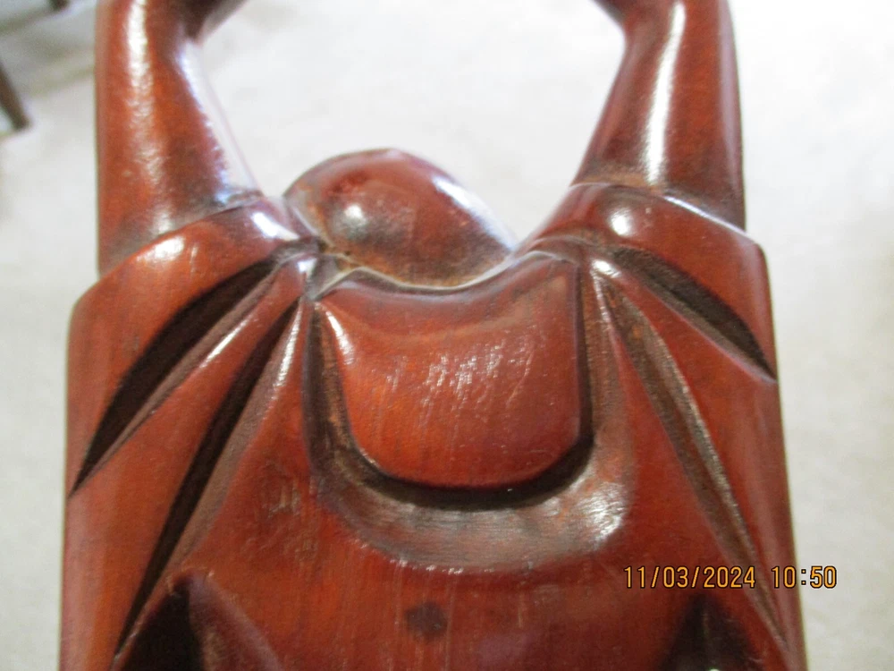 Up for sale is this Happy Buddha wood statue. It is about 11 1/2 inches tall. I was told that the previous owner traveled to many places in the world while in the military and acquired items along the way. I am not sure the age of this piece. It does have a partial tag on the bottom, but I can't make out where it came from. It looks to be in good vintage condition. It has a couple of marks on it (see pics). The right thumb does have a mark on it. I don't know if it is a crack or what. It's not loose at all. So it may just be on the surface.