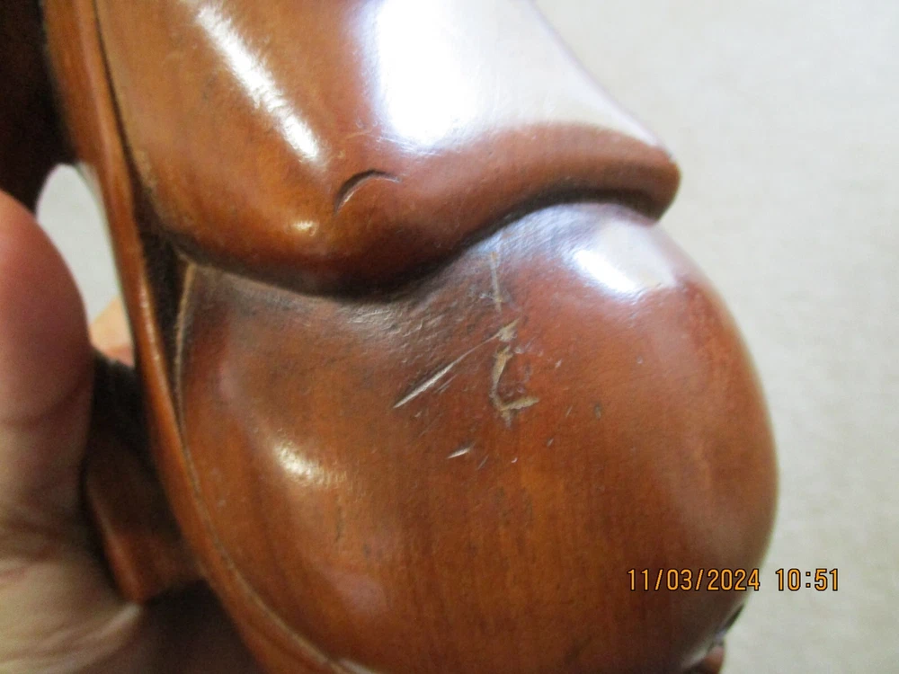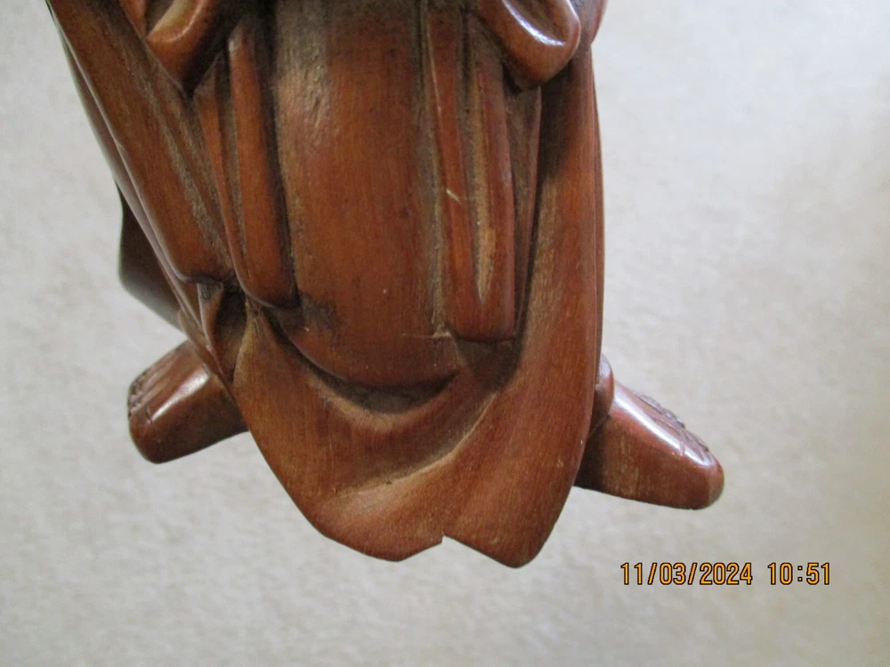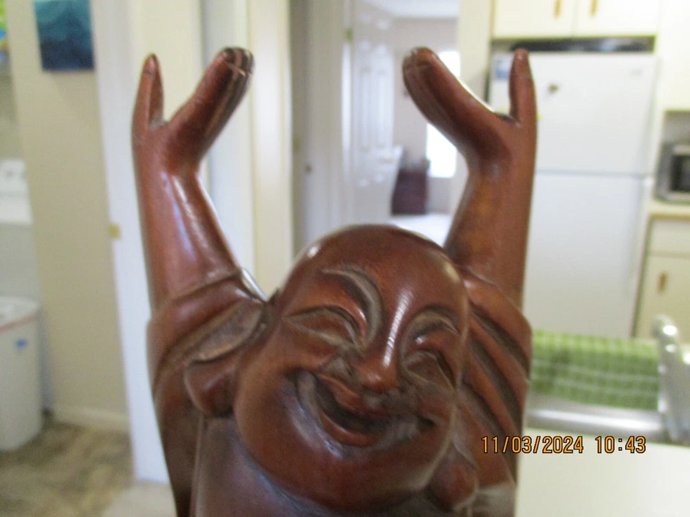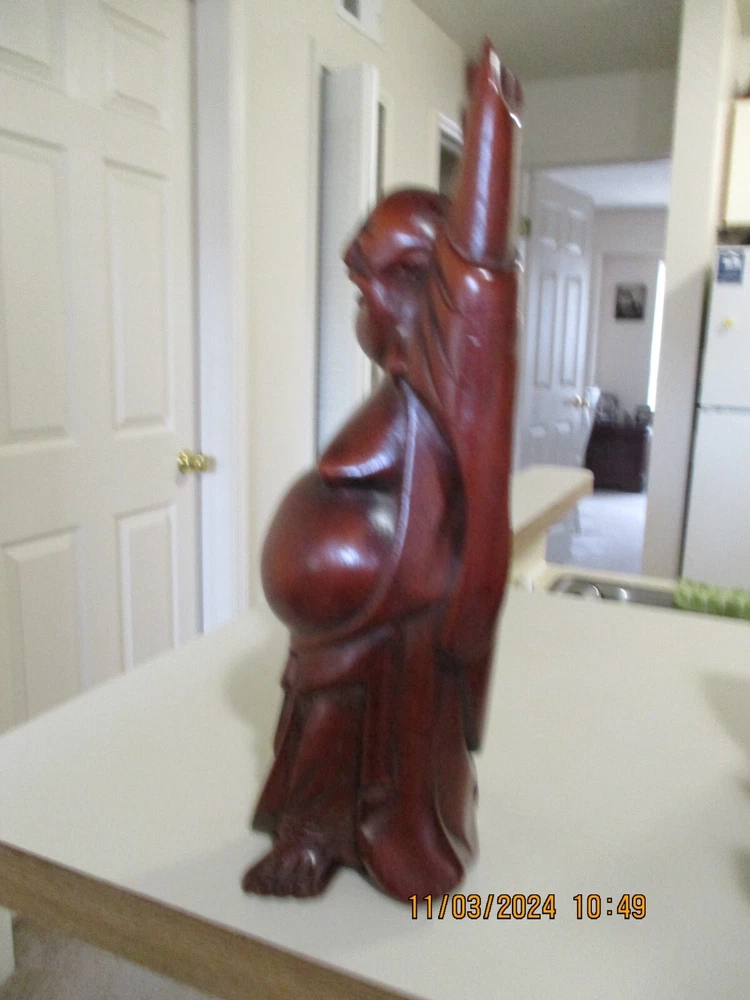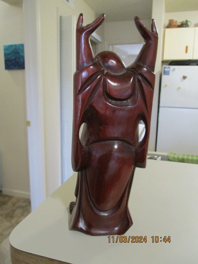 Up for sale is this Happy Buddha wood statue. It is about 11 1/2 inches tall. I was told that the previous owner traveled to many places in the world while in the military and acquired items along the way. I am not sure the age of this piece. It does have a partial tag on the bottom, but I can't make out where it came from. It looks to be in good vintage condition. It has a couple of marks on it (see pics). The right thumb does have a mark on it. I don't know if it is a crack or what. It's not loose at all. So it may just be on the surface.