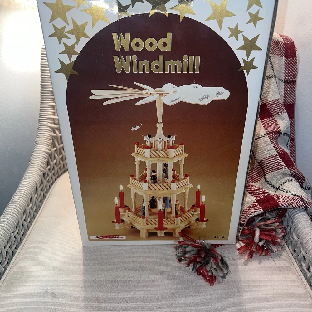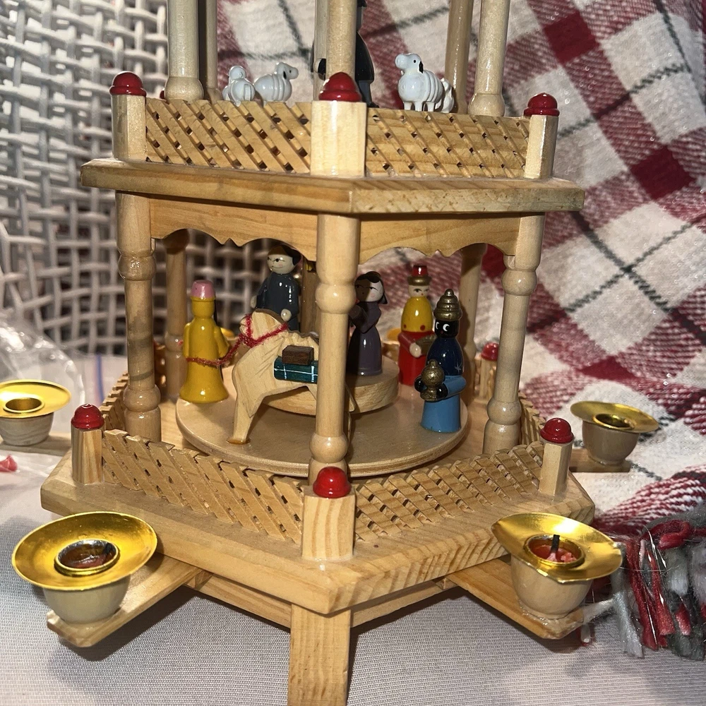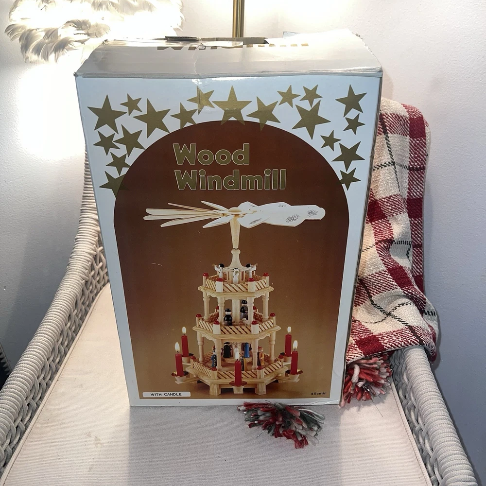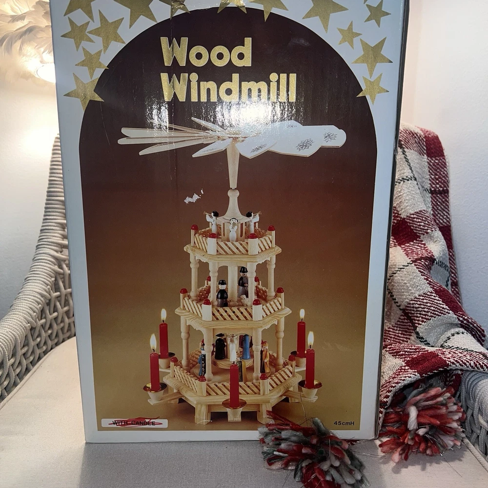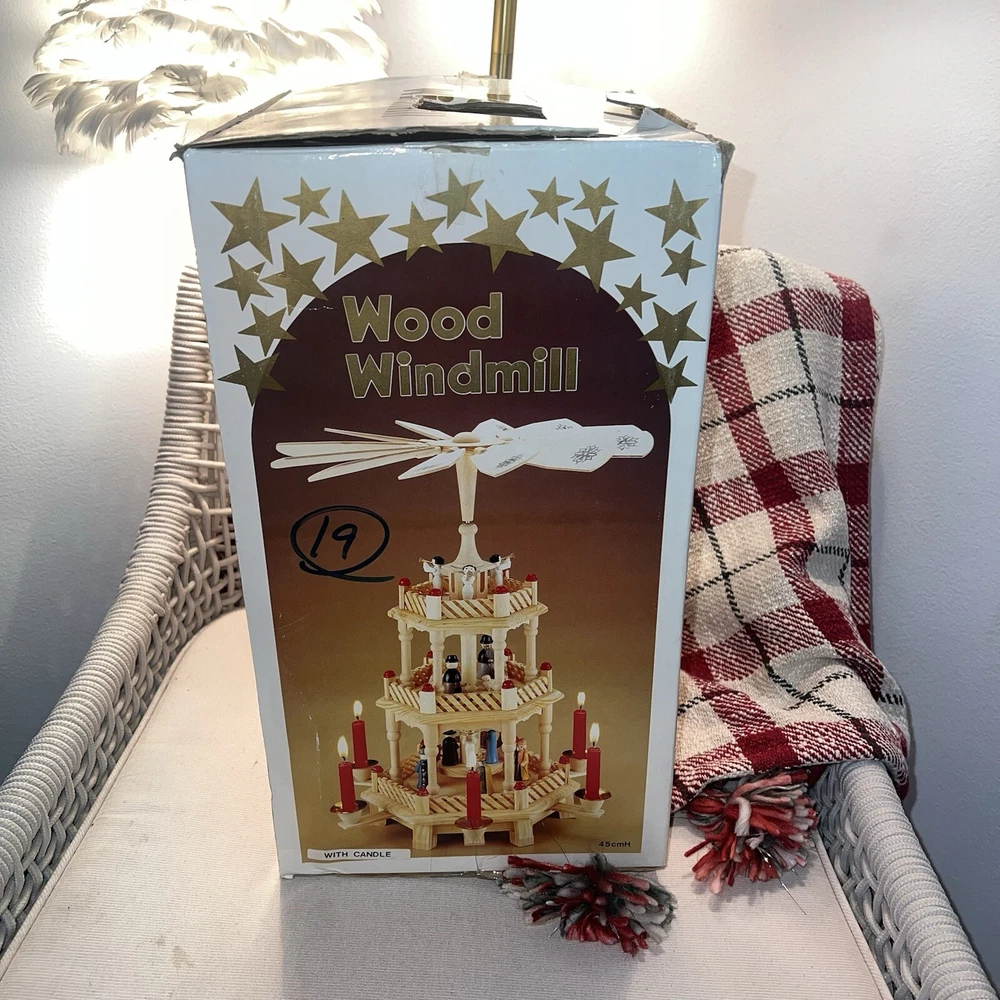 This vintage wooden Christmas nativity windmill carousel is a charming addition to any room. Its multicolor design and traditional style make it a perfect piece for the holiday season. The carousel features a revolving and rotating windmill that adds a unique touch to the overall design. Crafted from high-quality wood, this medium-sized carousel is a great collectible for adults and a perfect addition to any Christmas around the world collection. Whether you're looking for a decoration to go with your Christmas tree or a unique gift for a loved one, this vintage styled wooden Christmas nativity windmill carousel is sure to bring joy to any room. Box is in bad condition. Windmill has very little cosmetic damage, if any. Please see photos for details