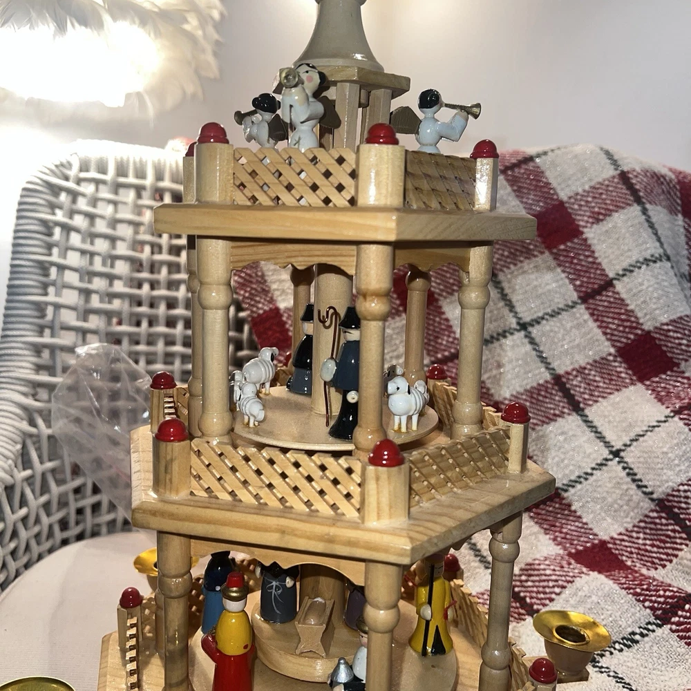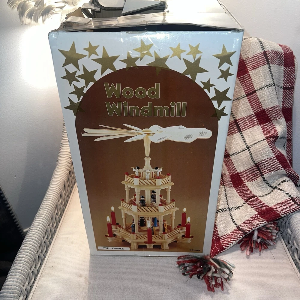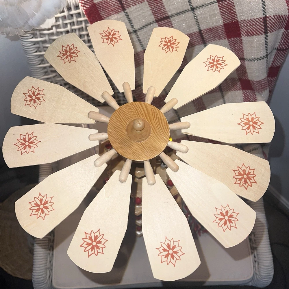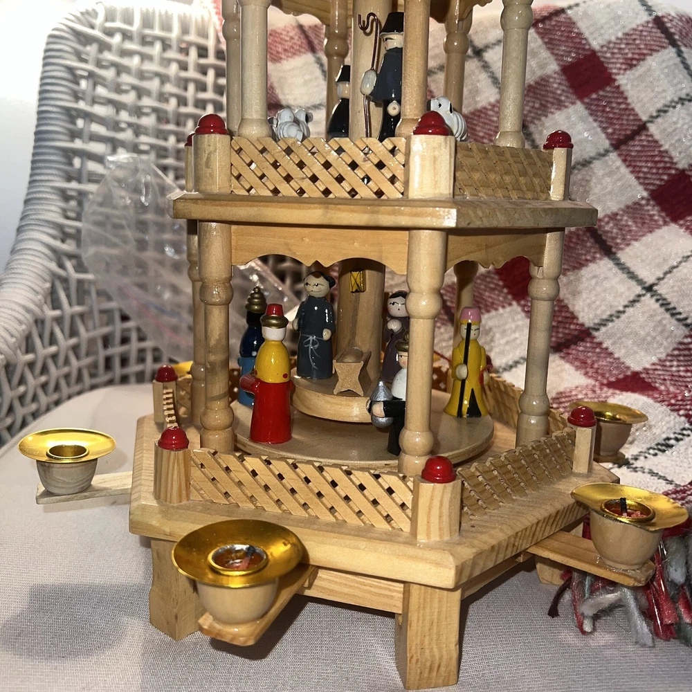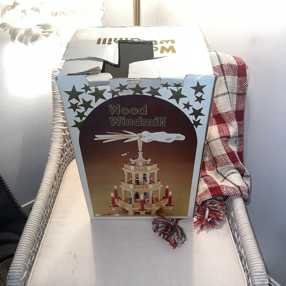 This vintage wooden Christmas nativity windmill carousel is a charming addition to any room. Its multicolor design and traditional style make it a perfect piece for the holiday season. The carousel features a revolving and rotating windmill that adds a unique touch to the overall design. Crafted from high-quality wood, this medium-sized carousel is a great collectible for adults and a perfect addition to any Christmas around the world collection. Whether you're looking for a decoration to go with your Christmas tree or a unique gift for a loved one, this vintage styled wooden Christmas nativity windmill carousel is sure to bring joy to any room. Box is in bad condition. Windmill has very little cosmetic damage, if any. Please see photos for details