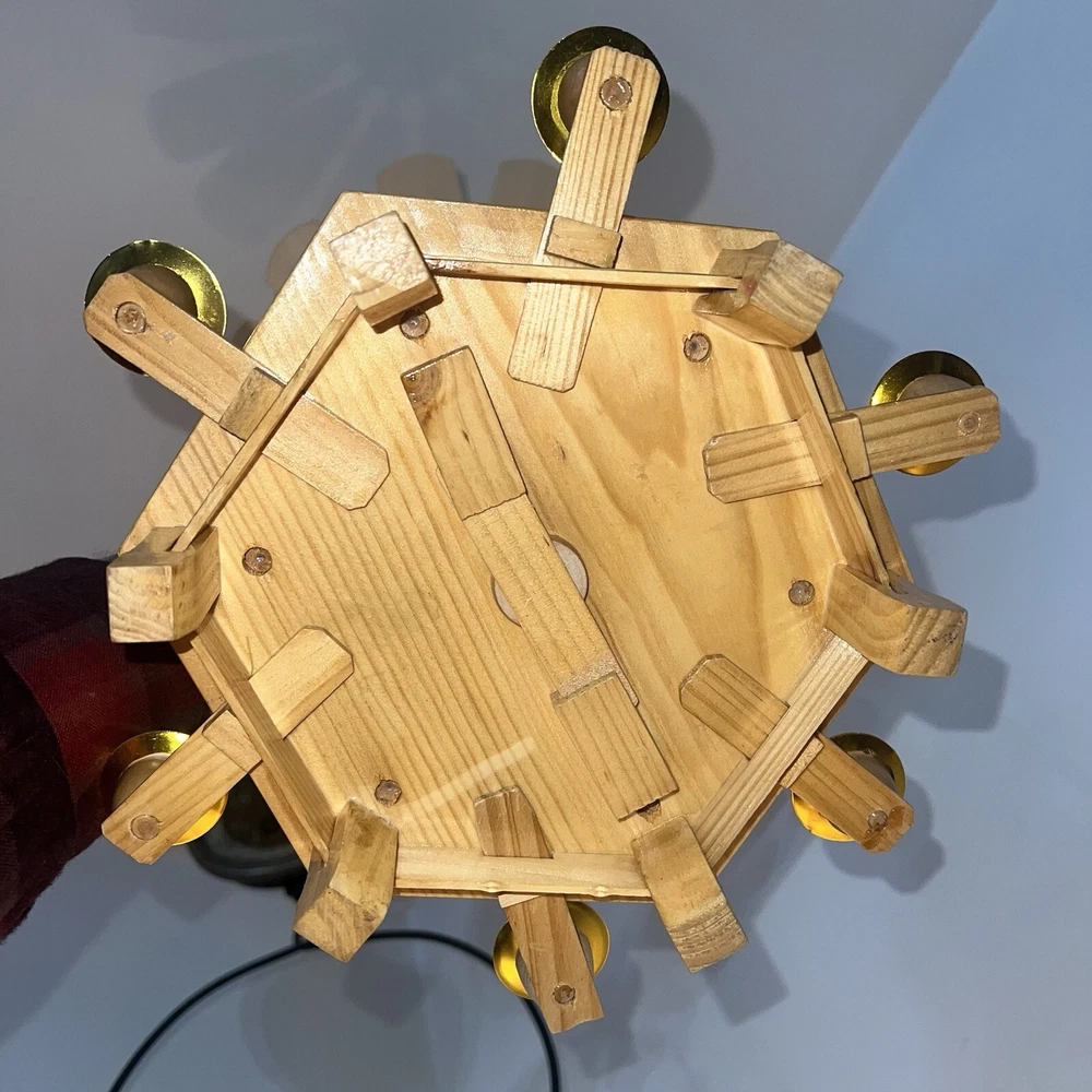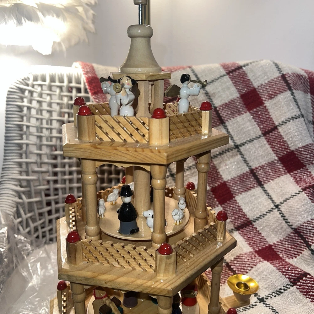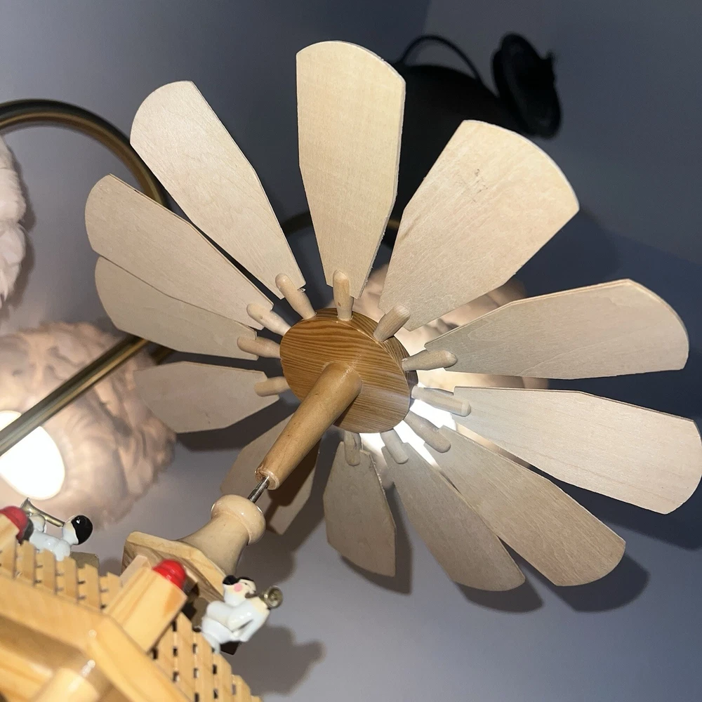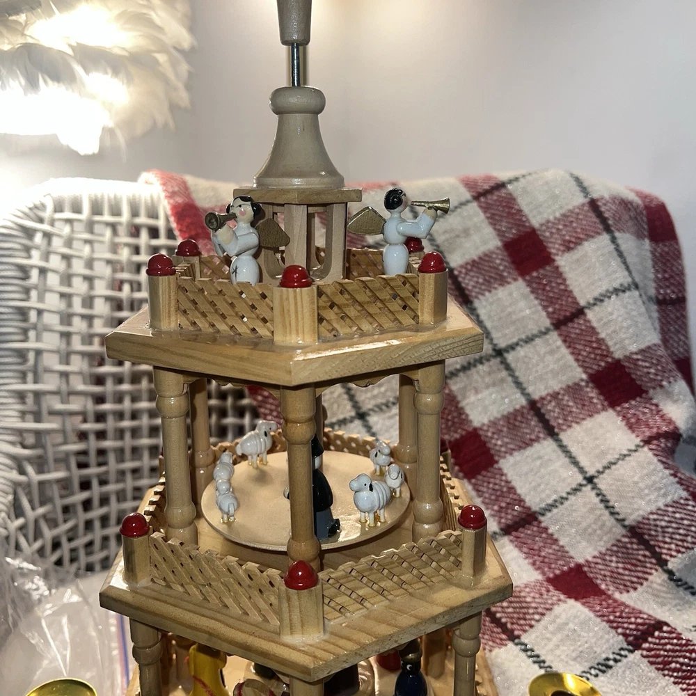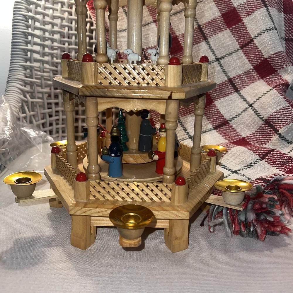 This vintage wooden Christmas nativity windmill carousel is a charming addition to any room. Its multicolor design and traditional style make it a perfect piece for the holiday season. The carousel features a revolving and rotating windmill that adds a unique touch to the overall design. Crafted from high-quality wood, this medium-sized carousel is a great collectible for adults and a perfect addition to any Christmas around the world collection. Whether you're looking for a decoration to go with your Christmas tree or a unique gift for a loved one, this vintage styled wooden Christmas nativity windmill carousel is sure to bring joy to any room. Box is in bad condition. Windmill has very little cosmetic damage, if any. Please see photos for details