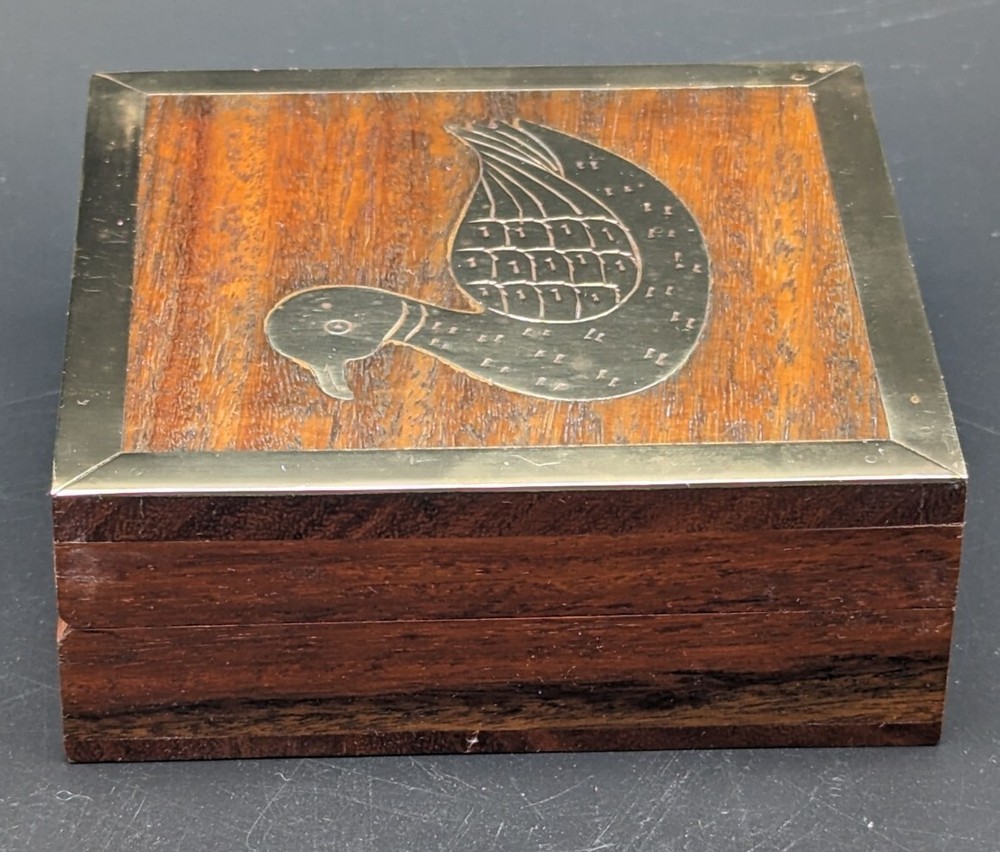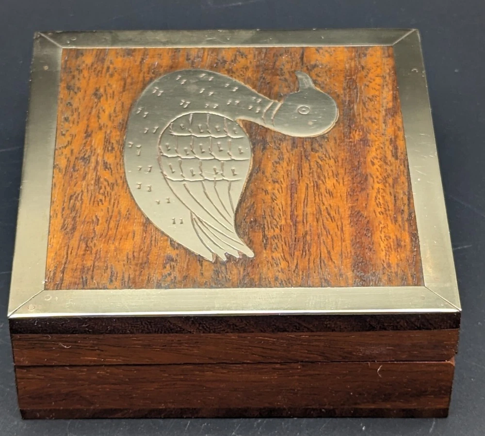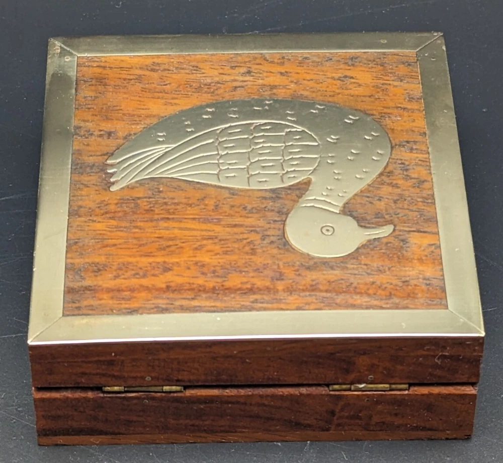 This vintage wooden trinket box is a charming collectible that adds character to any space. The box features a brass duck inlay and a hinged closure, making it perfect for storing small items. The mid-century modernism style and brown/brass color scheme make it suitable for all occasions and themes, from a rustic cabin to a modern apartment. Crafted with wood and brass materials, this box is an original handmade piece. The box is small in size, (approximately 4" × 4"× 1.5).