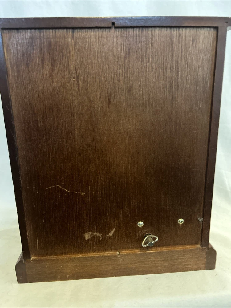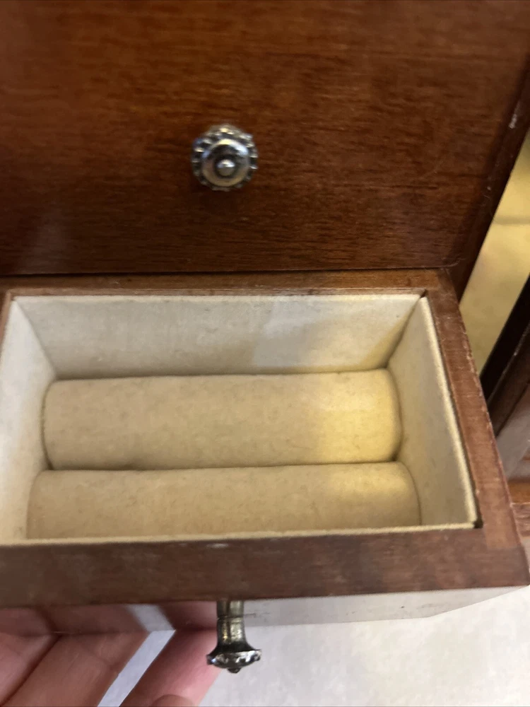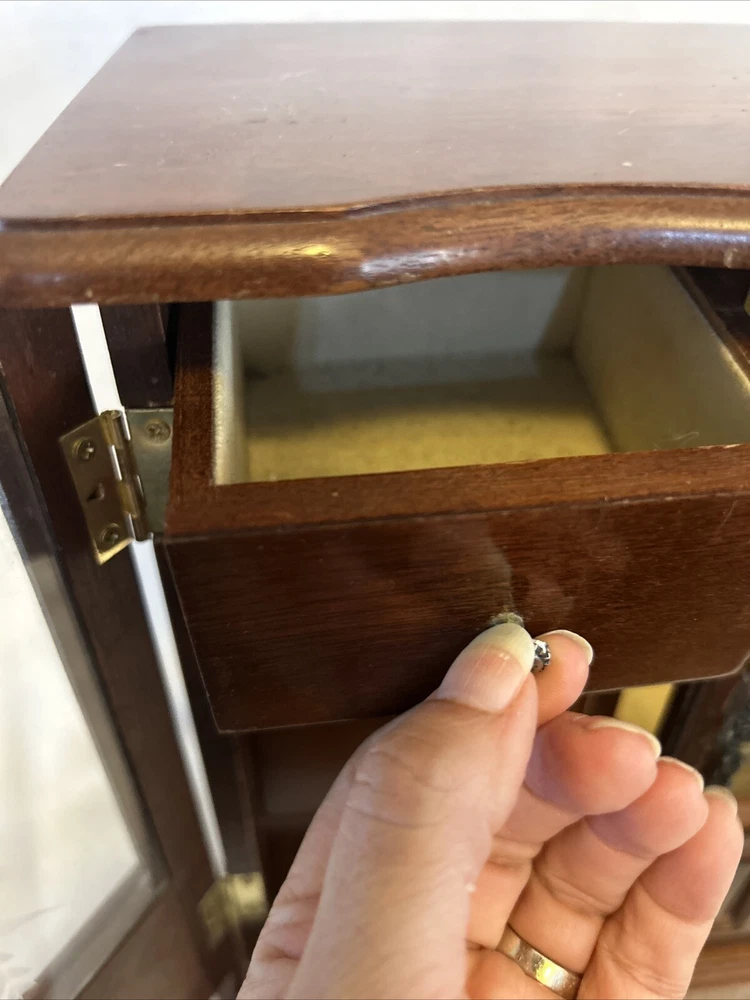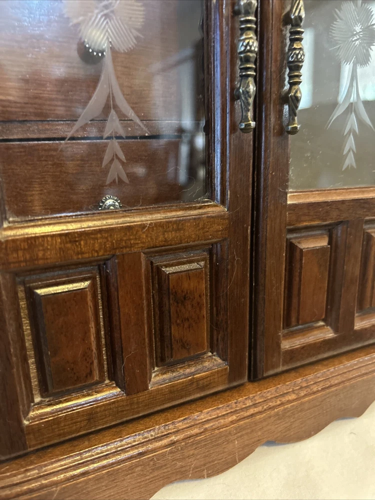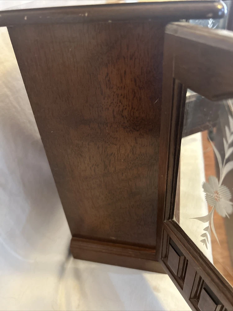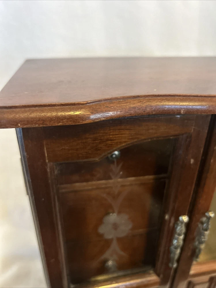 Vintage wooden musical jewelry box. The glass doors have edged flowers on the glass and the music is in working condition. See pictures for description and condition of this vintage wooden jewelry box. No cracks on the wood and has some nicks and scratches as seen on the pictures. Please review pictures for description, condition, and size.