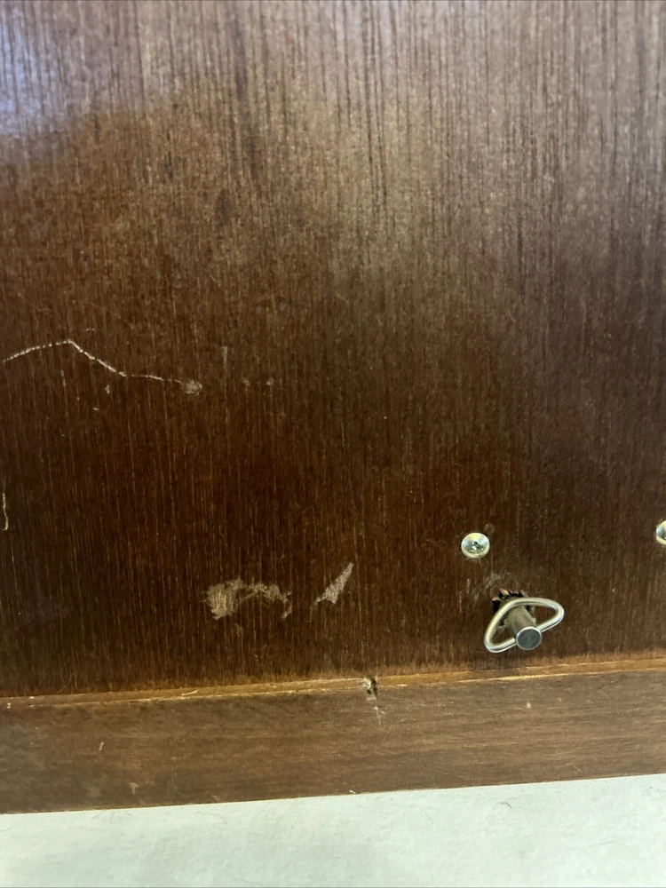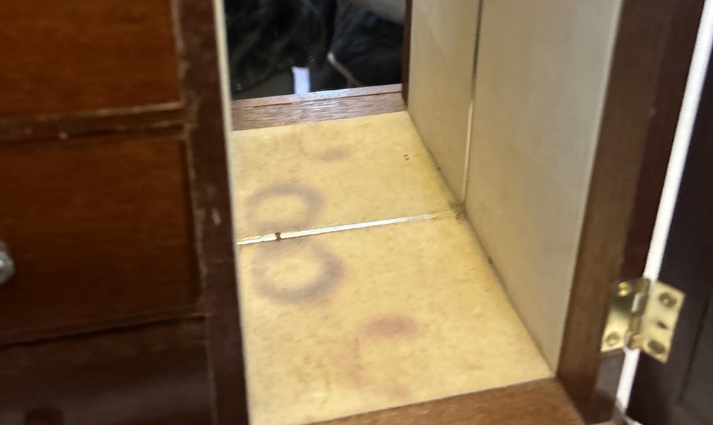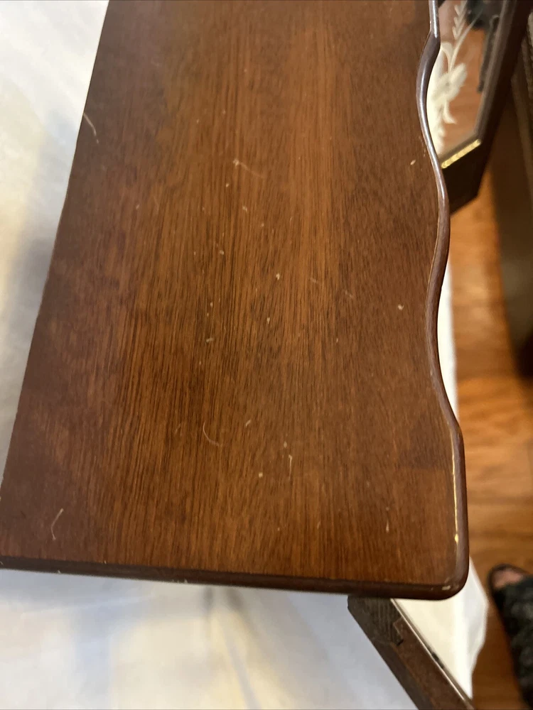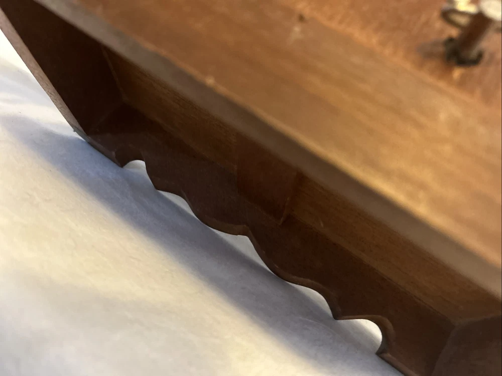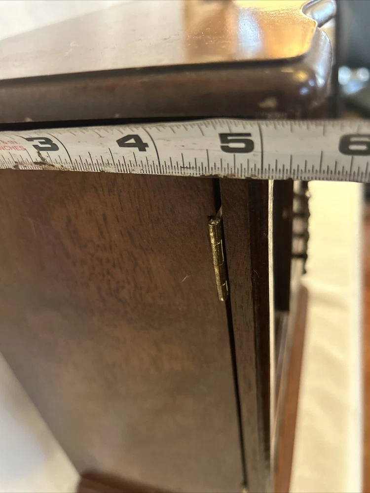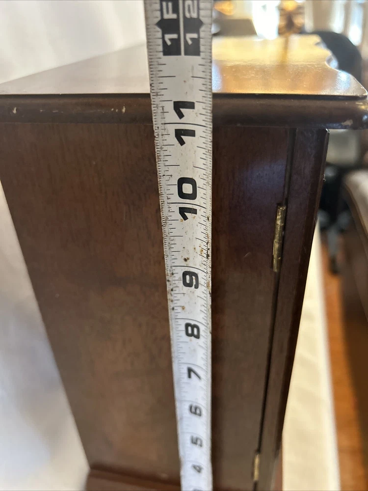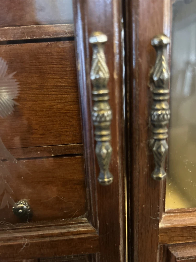 Vintage wooden musical jewelry box. The glass doors have edged flowers on the glass and the music is in working condition. See pictures for description and condition of this vintage wooden jewelry box. No cracks on the wood and has some nicks and scratches as seen on the pictures. Please review pictures for description, condition, and size.