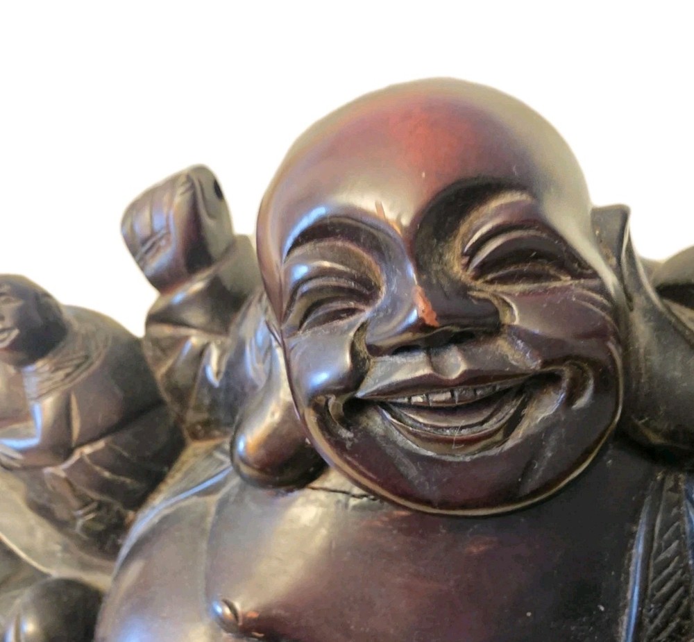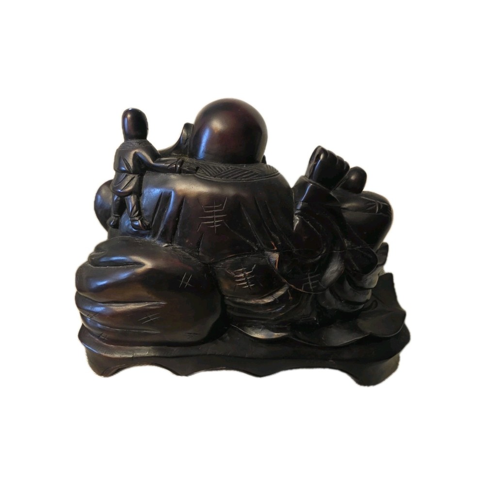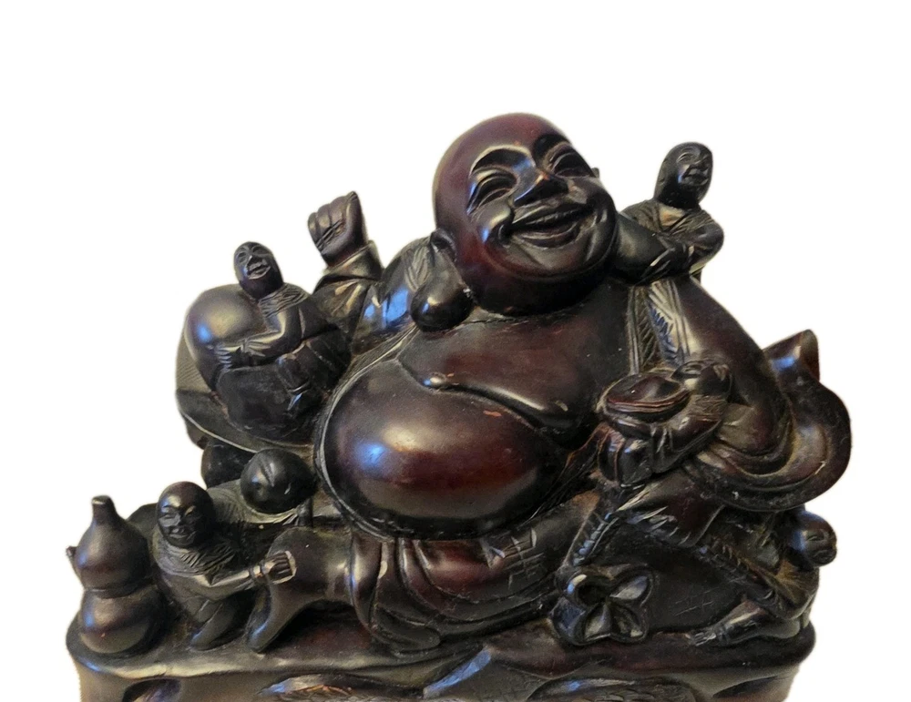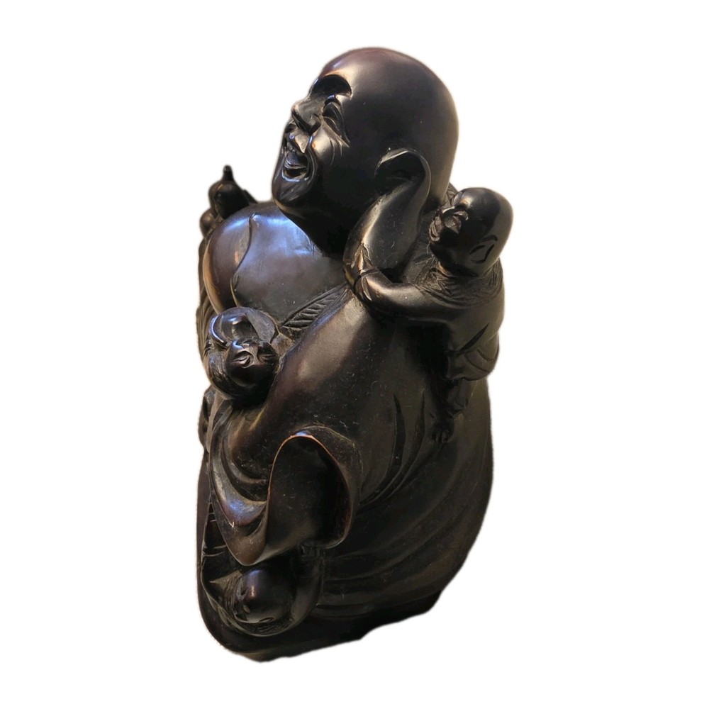 This beautiful 19th century vintage wood carved figure features a Laughing Smiling Buddha with children, standing at 8 inches tall. The brown-colored sculpture reflects the theme of Buddha and was originally created post-1940. A unique and antique piece, this figurine captures the essence of Buddhist teachings and traditional craftsmanship. Size: 10.5"x8"x4.5"