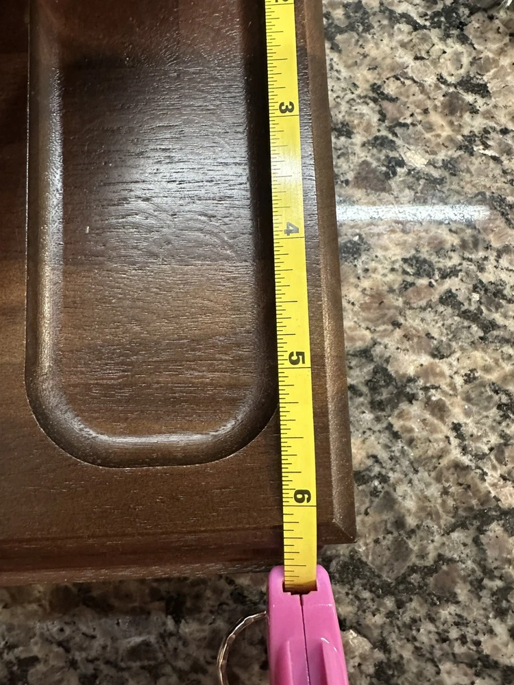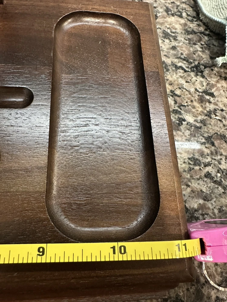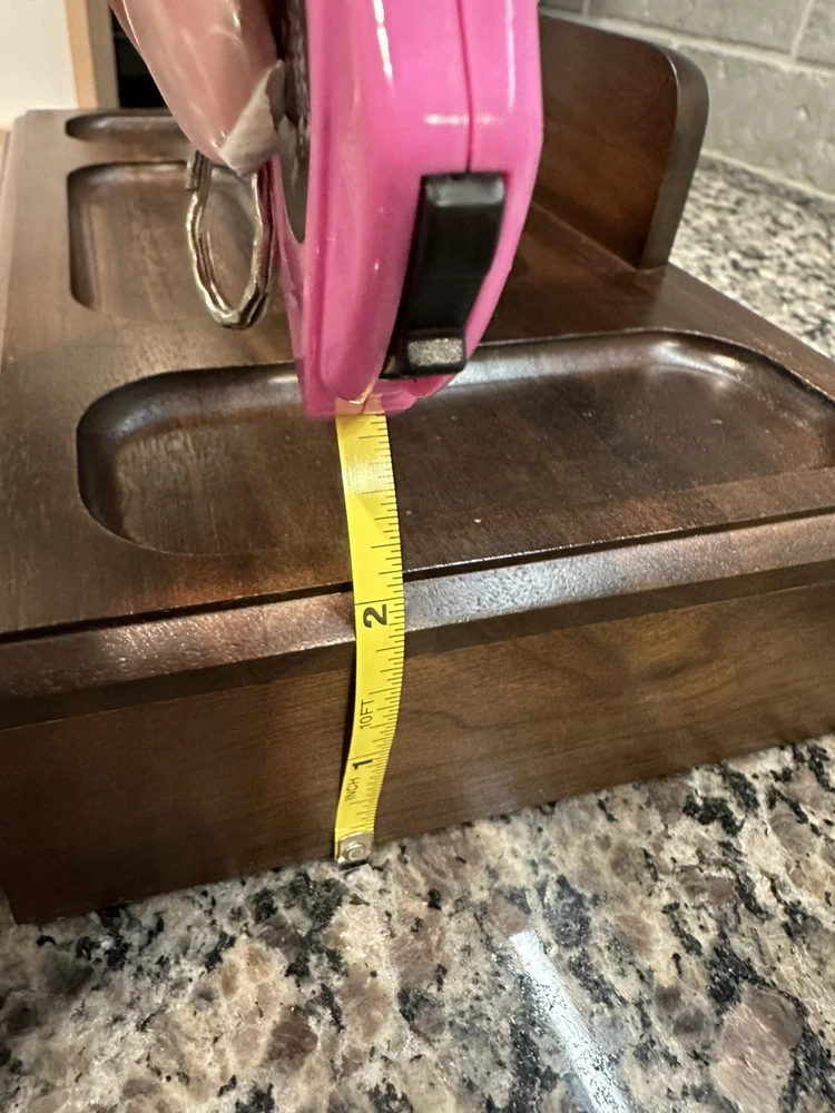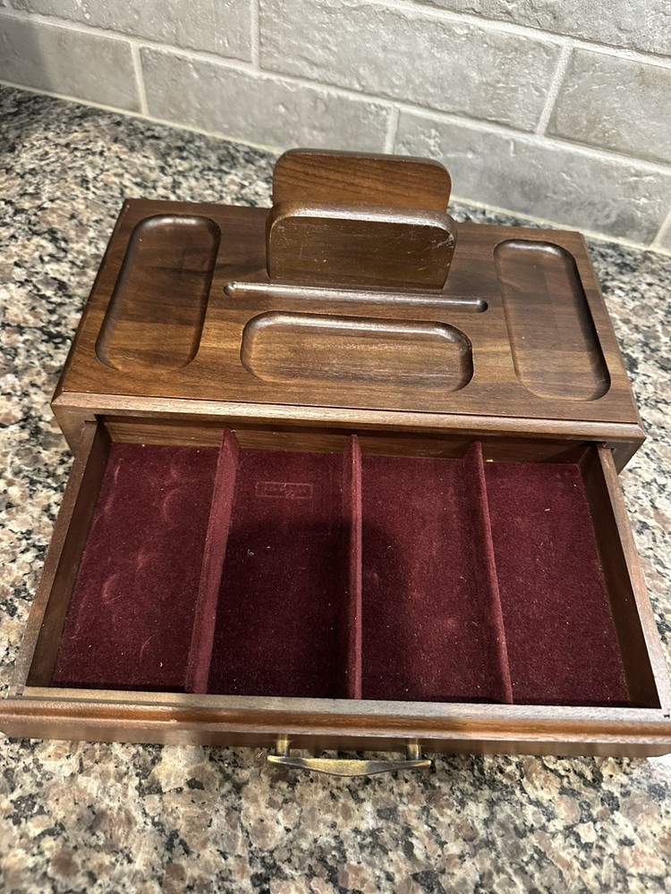 Keep your valuable items organized in this vintage Decatur men's wooden personal organizer. The tray/valet station is perfect for storing your jewelry, watches, and other small accessories. The brown velvet lining adds a touch of elegance and protects your items from scratches. The organizer is made of high-quality wood and measures 11 inches in length, 6.5 inches in width, and 2 inches in depth. It is ideal for men who appreciate vintage jewelry boxes and organizers. This item is perfect for your personal collection or as a gift for your loved ones.