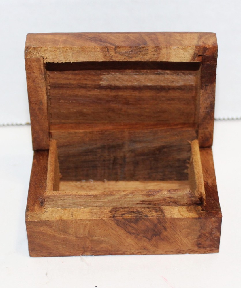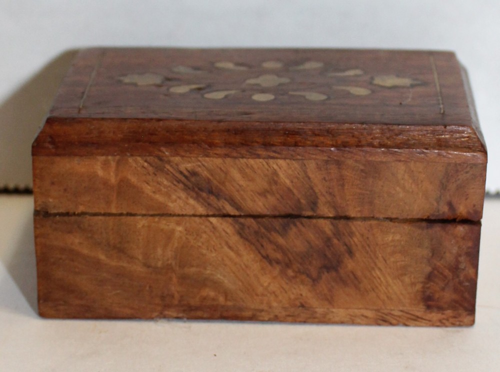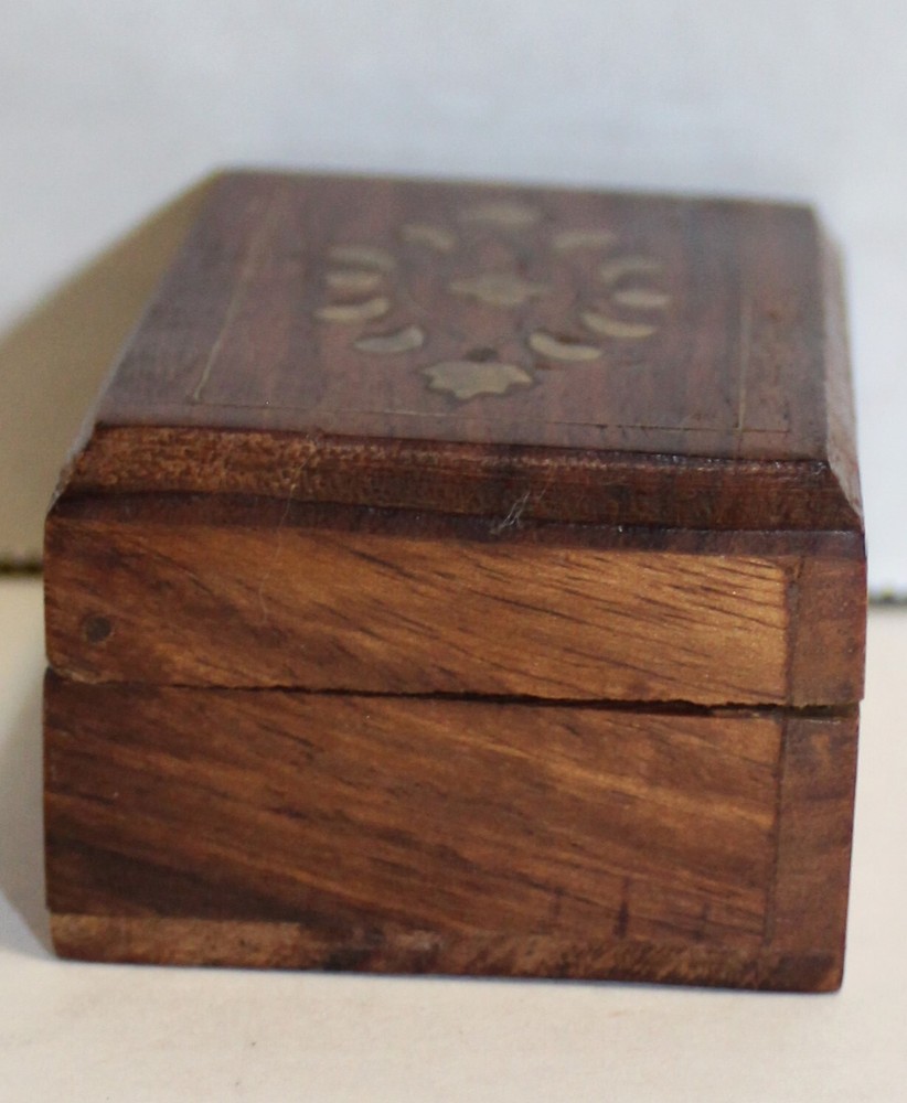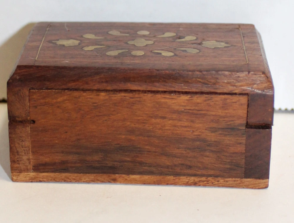 Vintage Retro Small Wooden Stash/ Trinket Box Gold Filigree Design Crafted with care, this vintage wooden stash trinket box is a delightful nod to the past. Its intricate gold filigree design, inspired by the timeless flower pattern, transforms the humble storage piece into a piece of art. Suitable for all occasions, this medium-sized rectangle box is as functional as it is aesthetically pleasing. The trinket box, originating from India in the 1970s, showcases the craftsmanship of the era with its wood-finished surface and carved details. Measuring 3 inches in length, 1.5 inches in height, and 2 inches in width, this keepsake is both practical for everyday use and special enough for those unique items. Its push lock closure ensures your treasures are secure, while the boxed feature adds an extra layer of protection and presentation. See Photos