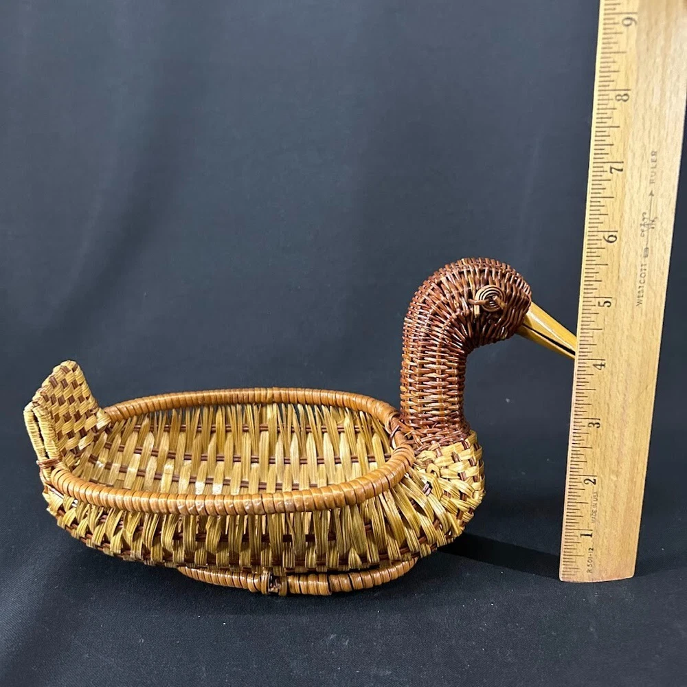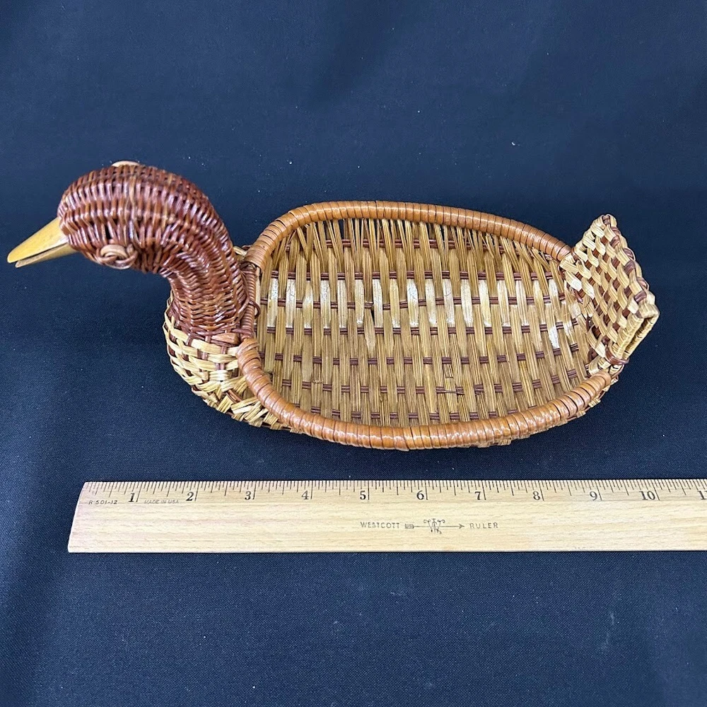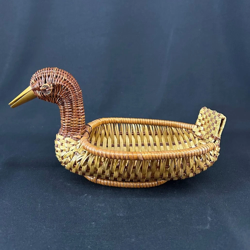Type: Bread Basket Country/Region of Manufacture: Unknown Style: rustic Shape: duck Occasion: All Occasions Original/Reproduction: Original Material: Wood Closure Type: none Features: woven Item Length: 10 in Fill Material: none Item Height: 5.5 in Theme: Animals & Dinosaurs Customized: No Finish: woven Character: duck Size: Medium Handmade: Yes Engraved: No Number in Pack: 1 Seller Notes: “Excellent. See photos for evaluation.” Color: Brown Pattern: Woven Production Technique: Weaving Department: Teens, Adults Brand: Duck Suitable For: table