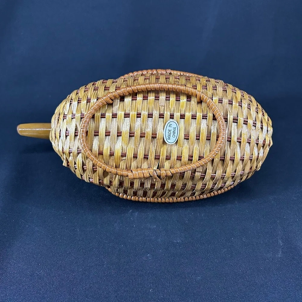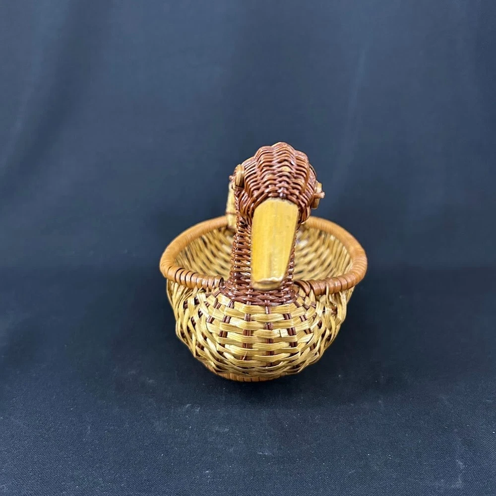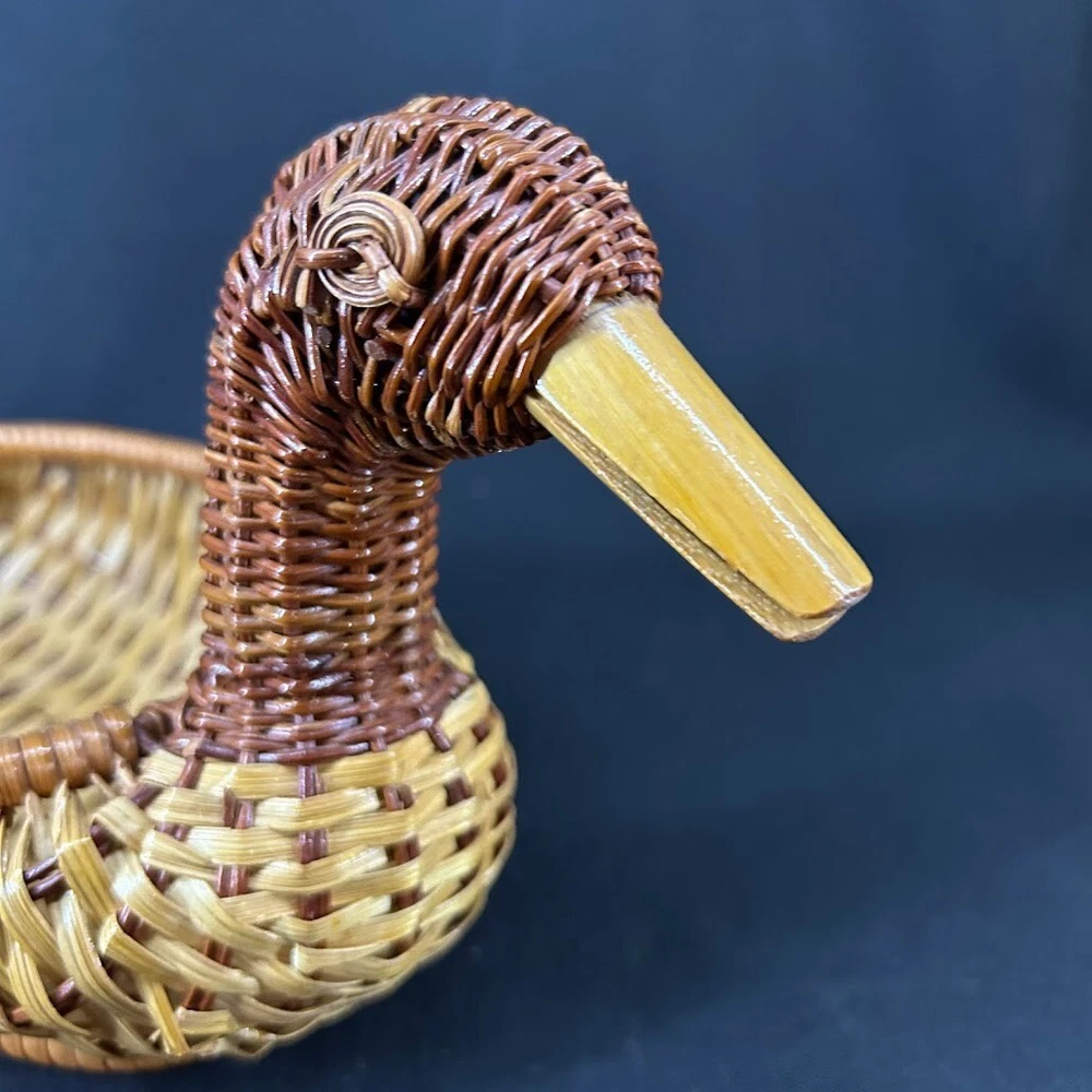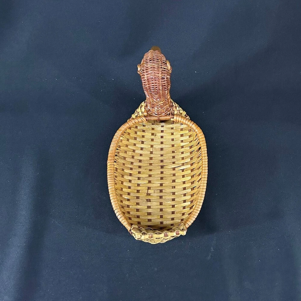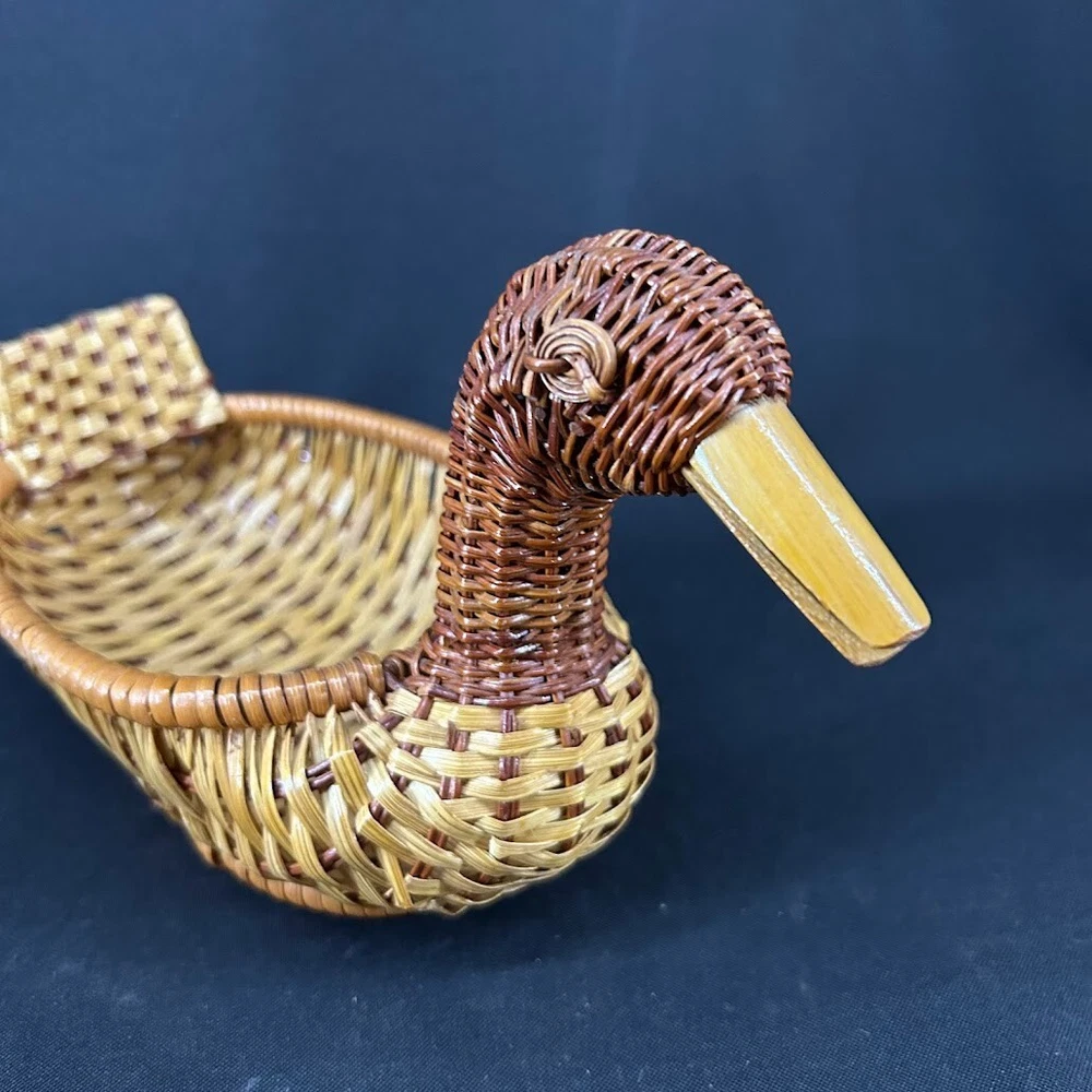 This vintage woven wicker duck basket is a charming addition to any farmhouse or rustic decor. The medium-sized basket is perfect for displaying on a table and features a woven design with a brown color scheme. The basket is handmade and has a duck shape, making it a unique and whimsical piece. The basket is suitable for all occasions and is perfect for teens and adults alike. It is an original, one-of-a-kind piece that is sure to delight collectors of decorative items. The basket has no closure and is made of wood, giving it a sturdy and durable quality. Add this vintage duck basket to your collection today!