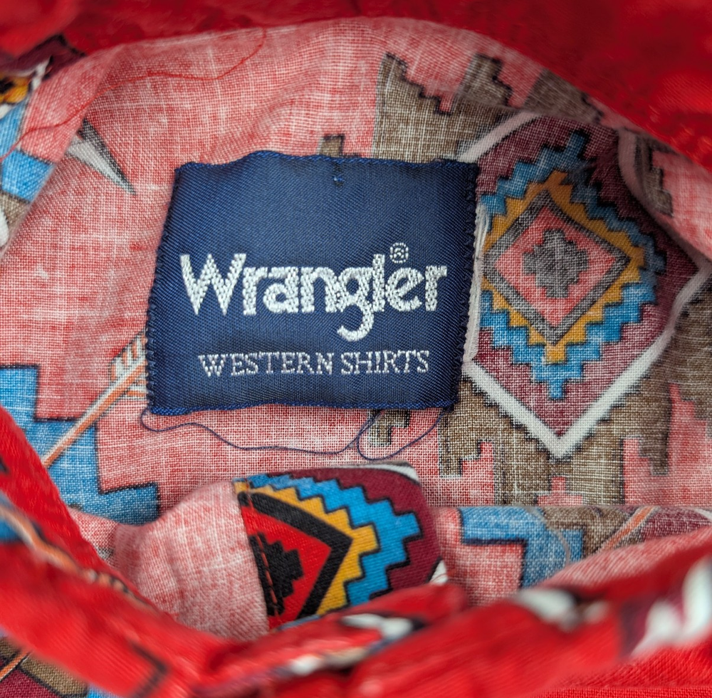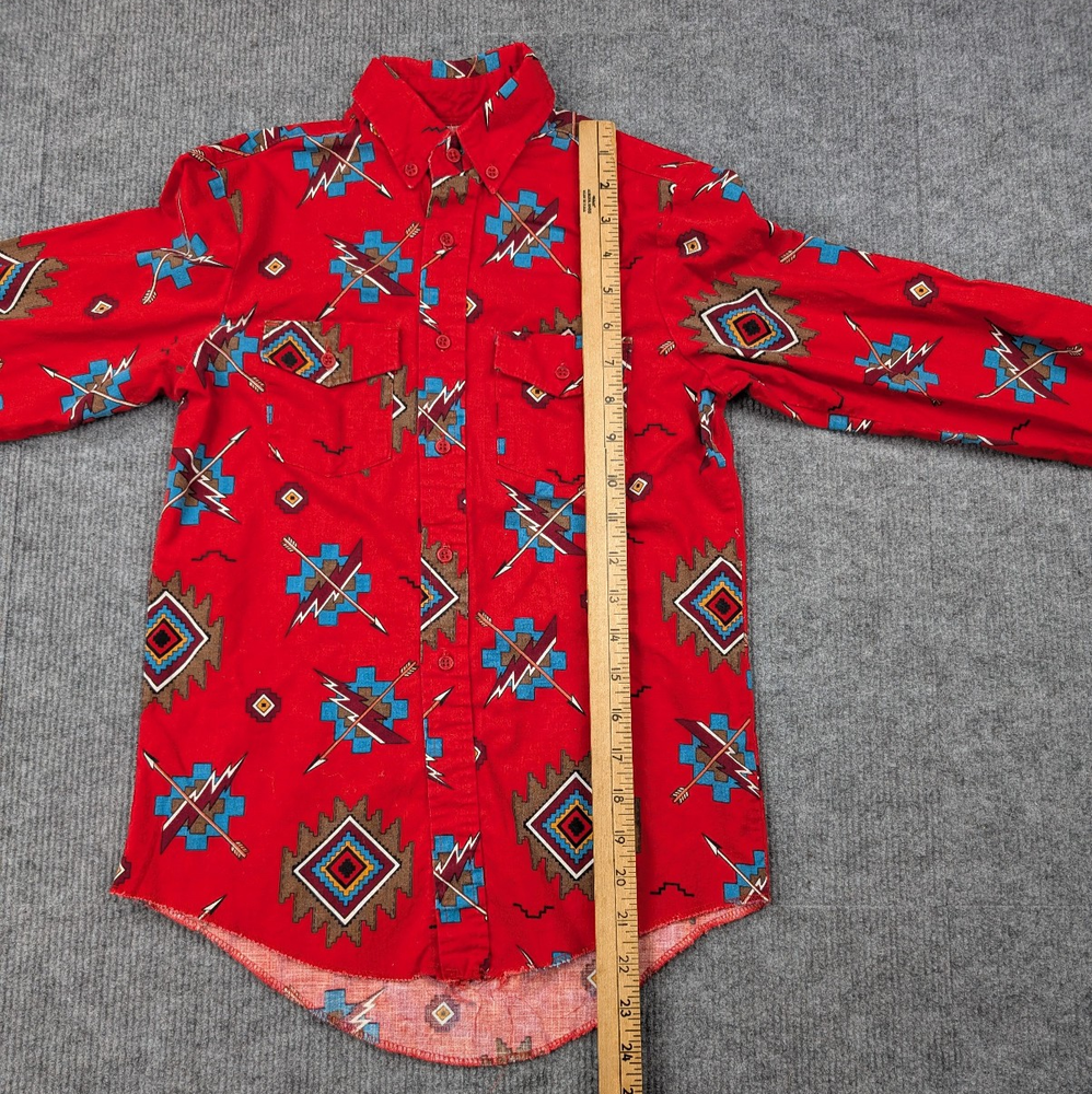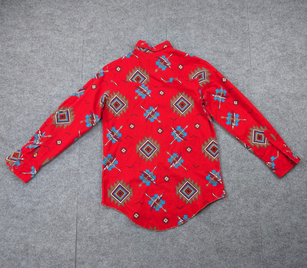 Brand: Wrangler Department: Boys Type: Button-Up Shirt Style: Western Shirt Color: Red Pattern: Southwestern / Aztec Material: Cotton (typical Wrangler western fabric) Fabric Type: Woven Sleeve Length: Long Sleeve Closure: Button Front Fit: Regular Season: Fall, Winter, Spring Features: Button-Down Collar, Chest Pockets, Western Style Condition: Pre-owned